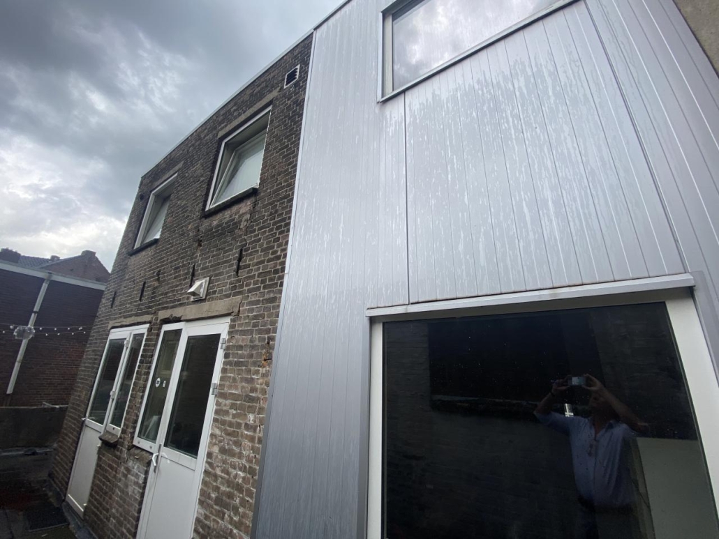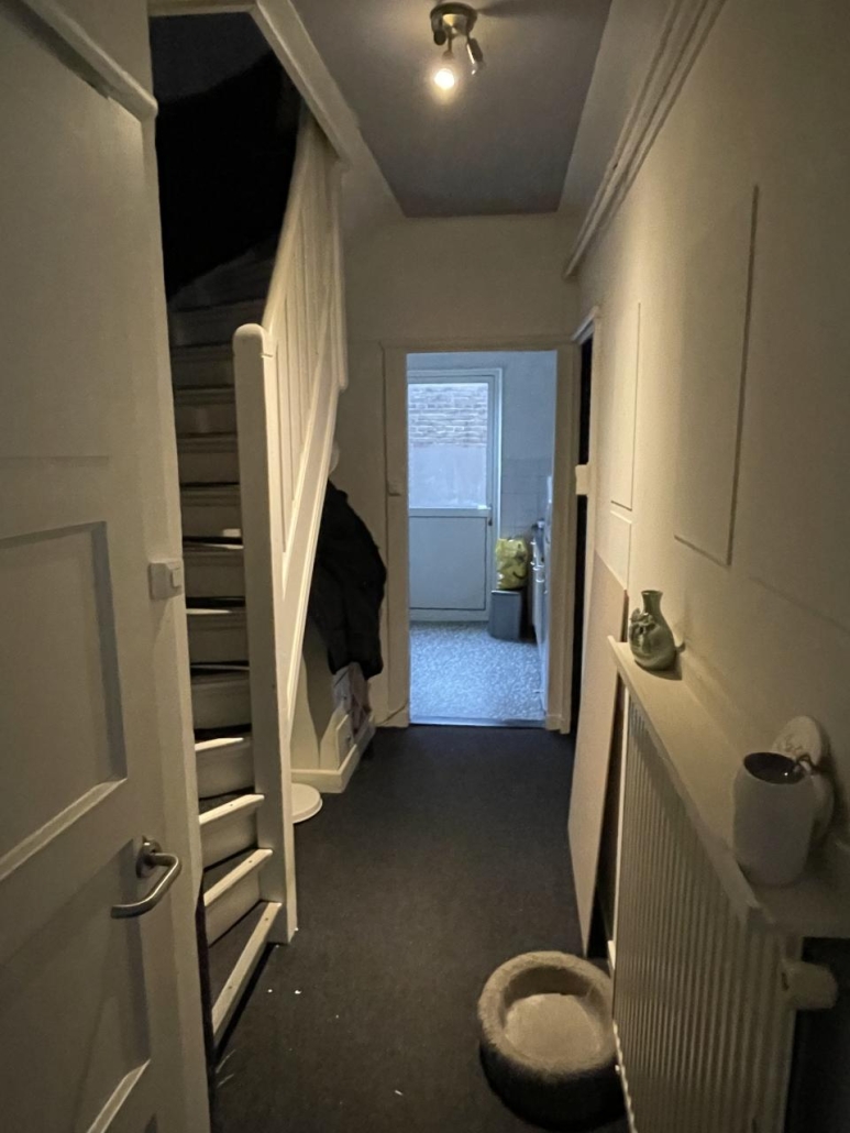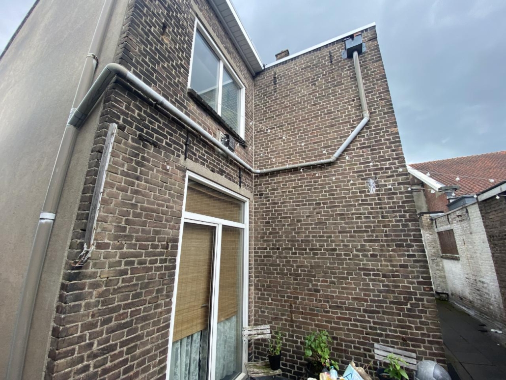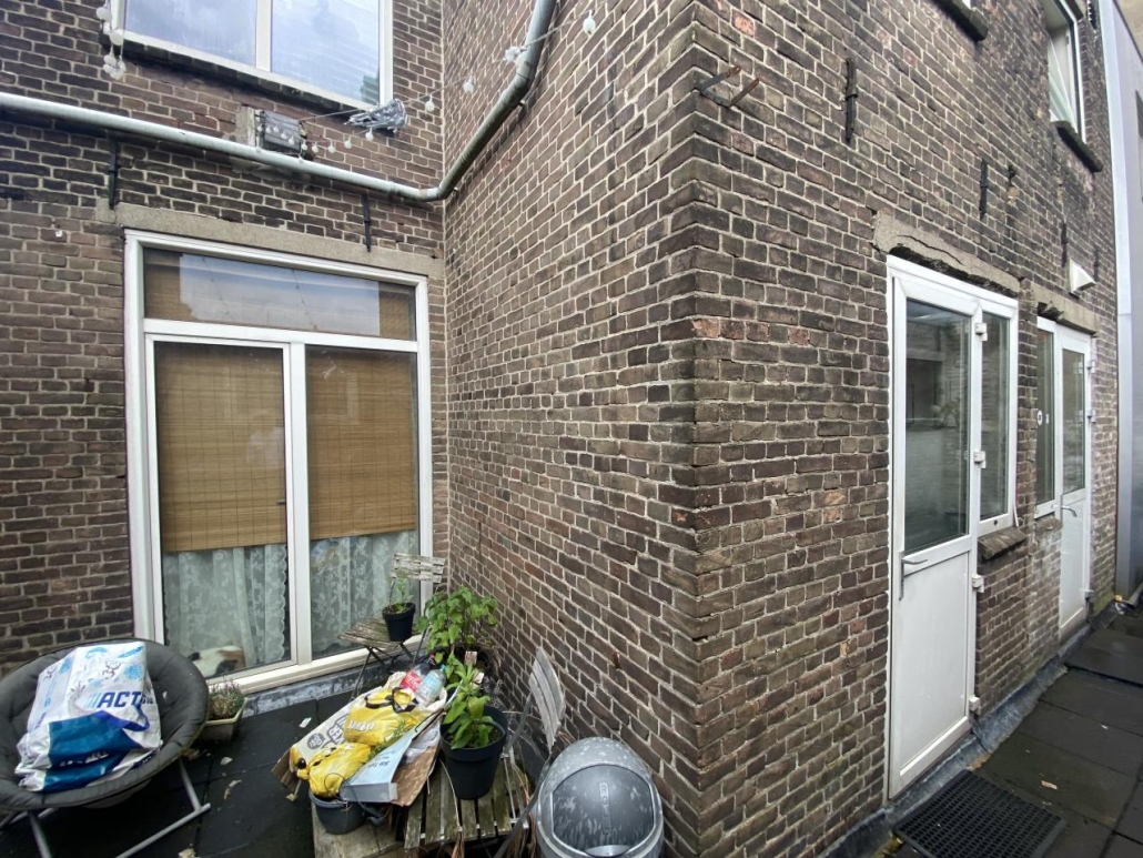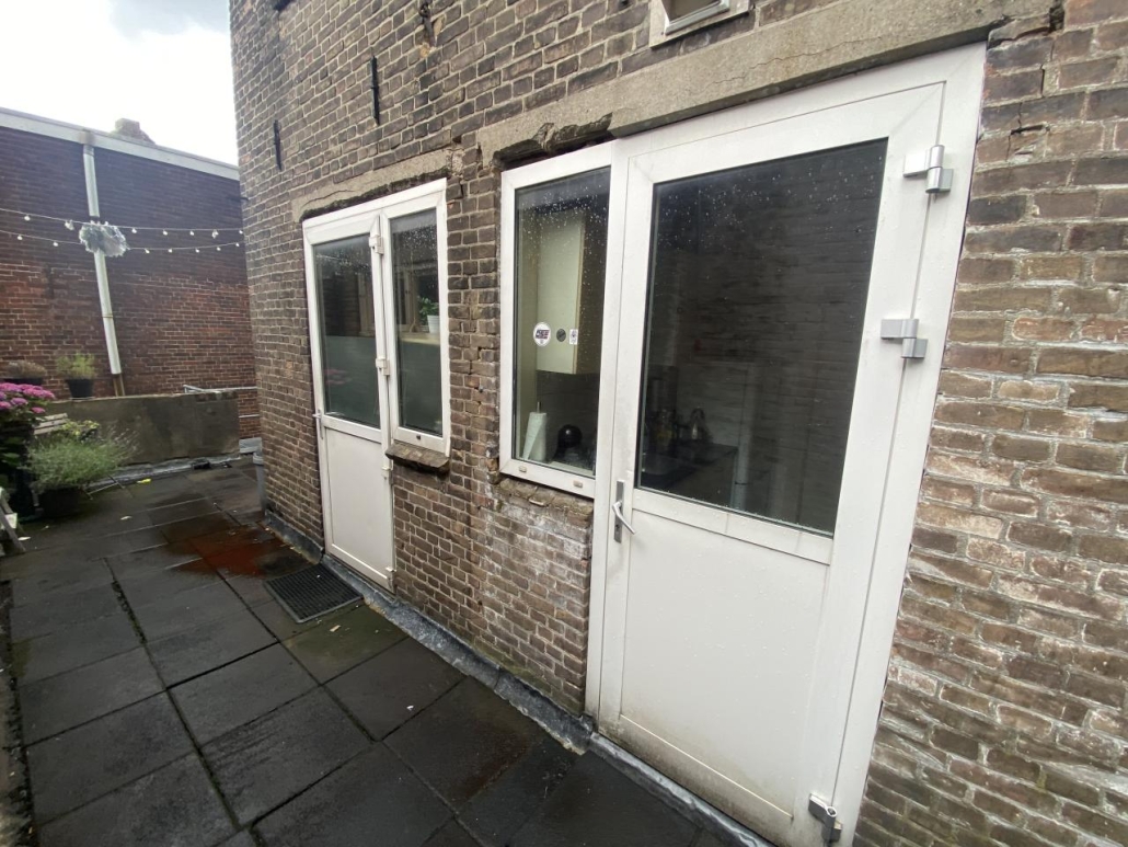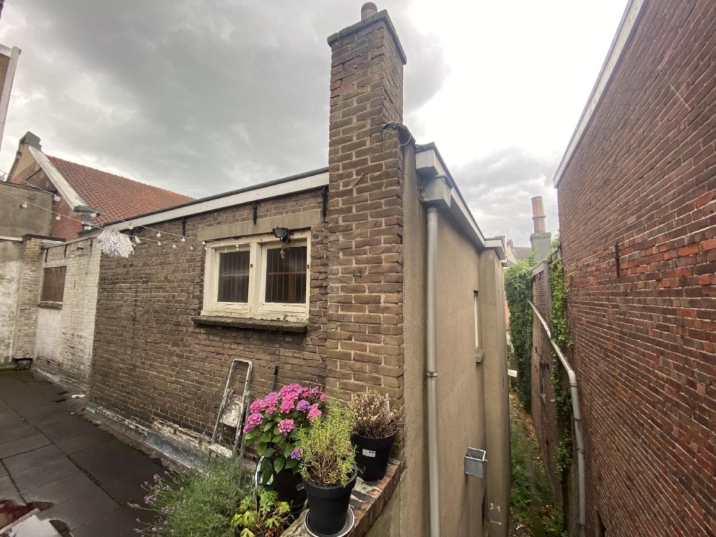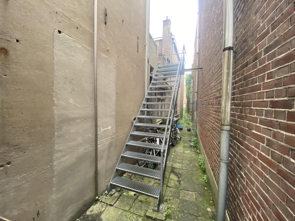De 2 woningen op de etages zijn bereikbaar via de poort aan de rechterzijgevel met stalen trap naar de verdiepingen.