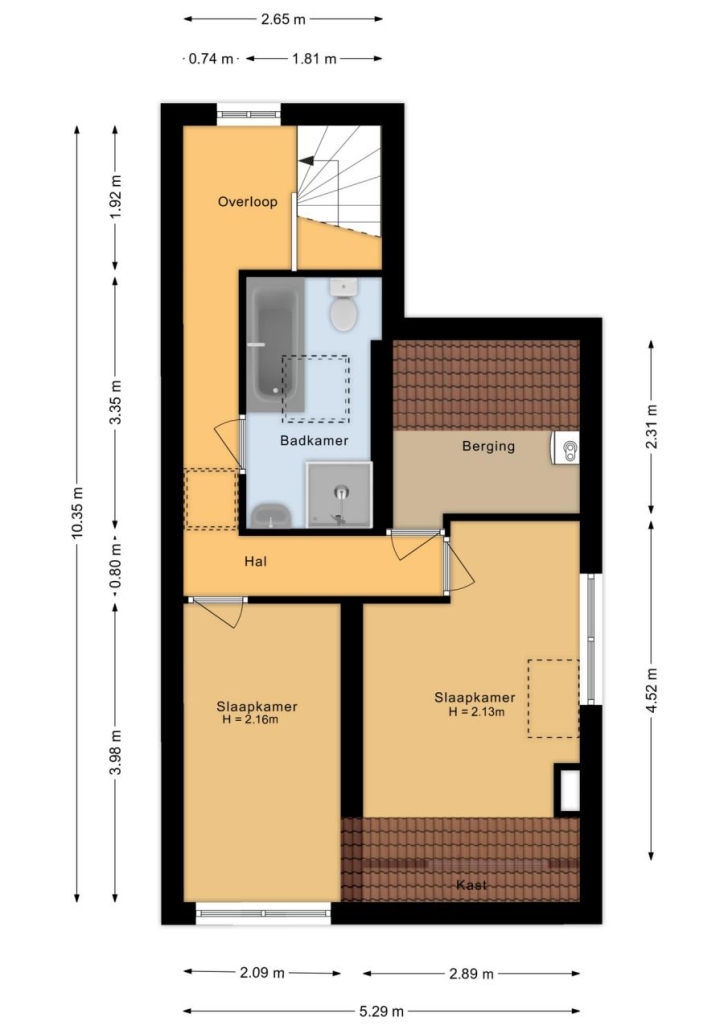 Overloop, derde en vierde slaapkamer, en een praktische zolderberging. De badkamer is voorzien van neutrale betegeling, ligbad, douche, wastafel en toilet.