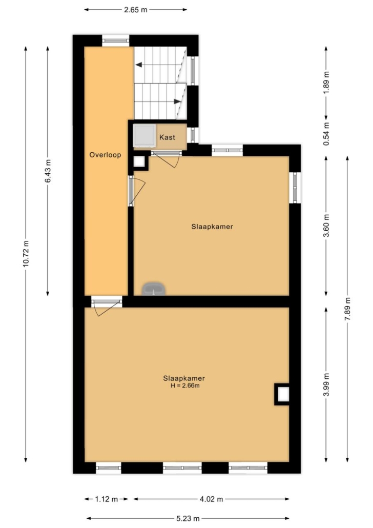 Overloop met toegang tot het plat dak. Twee zeer royale slaapkamers, beide met wastafel. Eén kamer beschikt over een vaste kast met aansluiting voor wasmachine en droger.