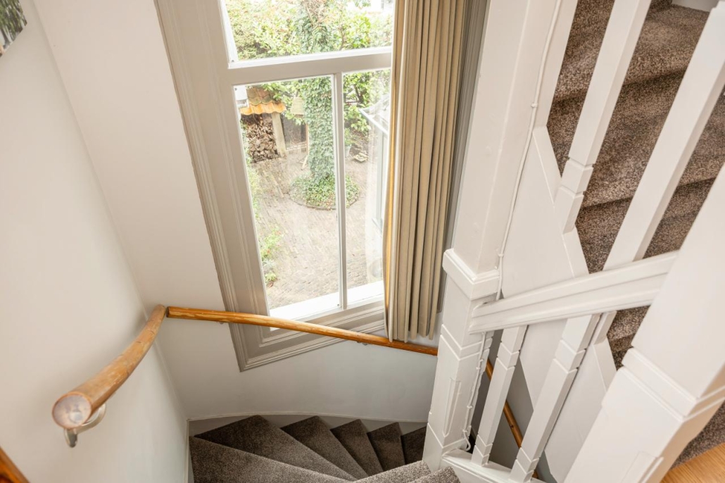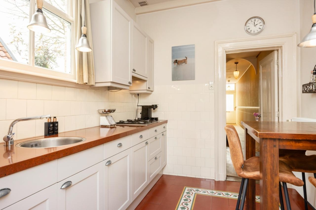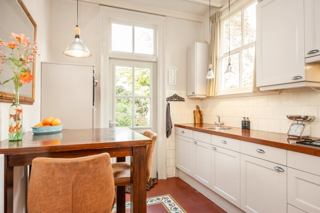 Een stijlvolle gang met eikenvloerdelen leidt naar de toiletruimte met hangcloset en fonteintje. De kamer en suite met erker ademt sfeer dankzij de houtkachel, fraaie eikenvloerdelen en openslaande tuindeuren naar het terras. De dichte keuken met inrichting in lengteopstelling is voorzien van een natuurstenen werkblad, inbouwapparatuur en een deur naar de tuin.