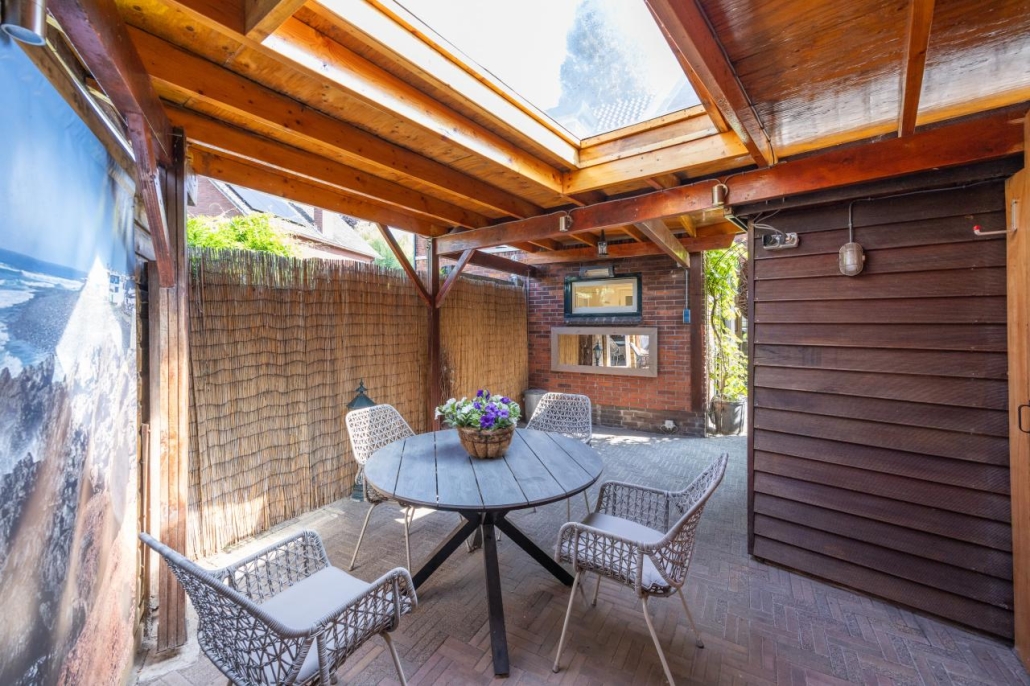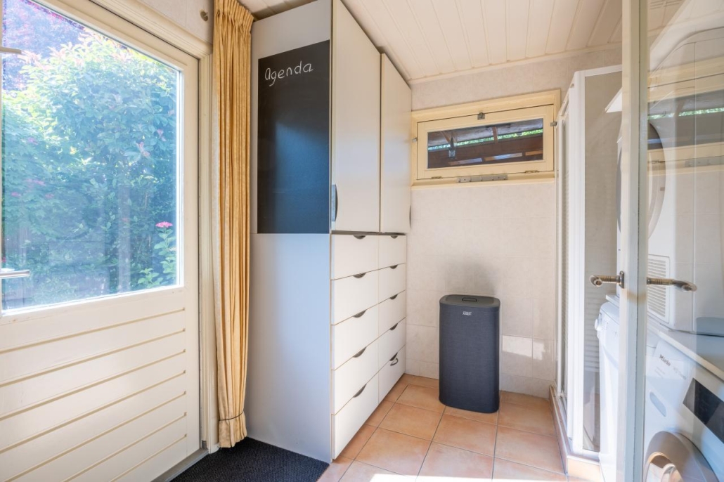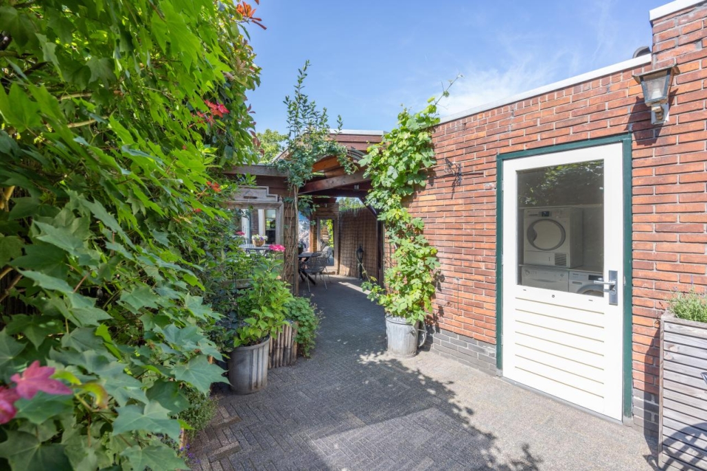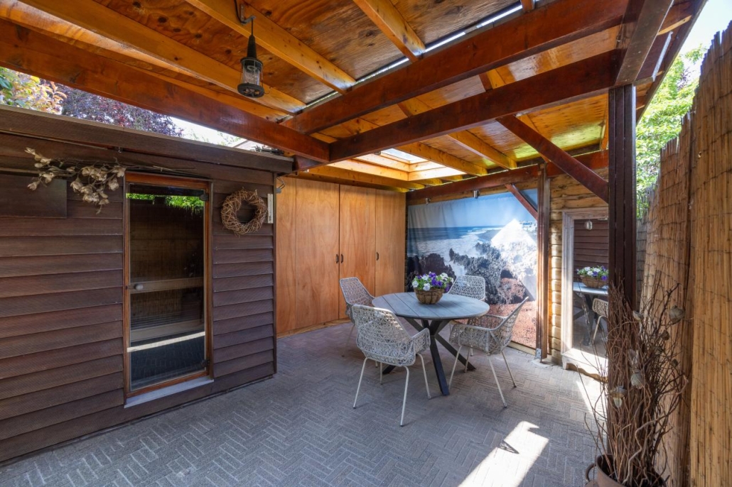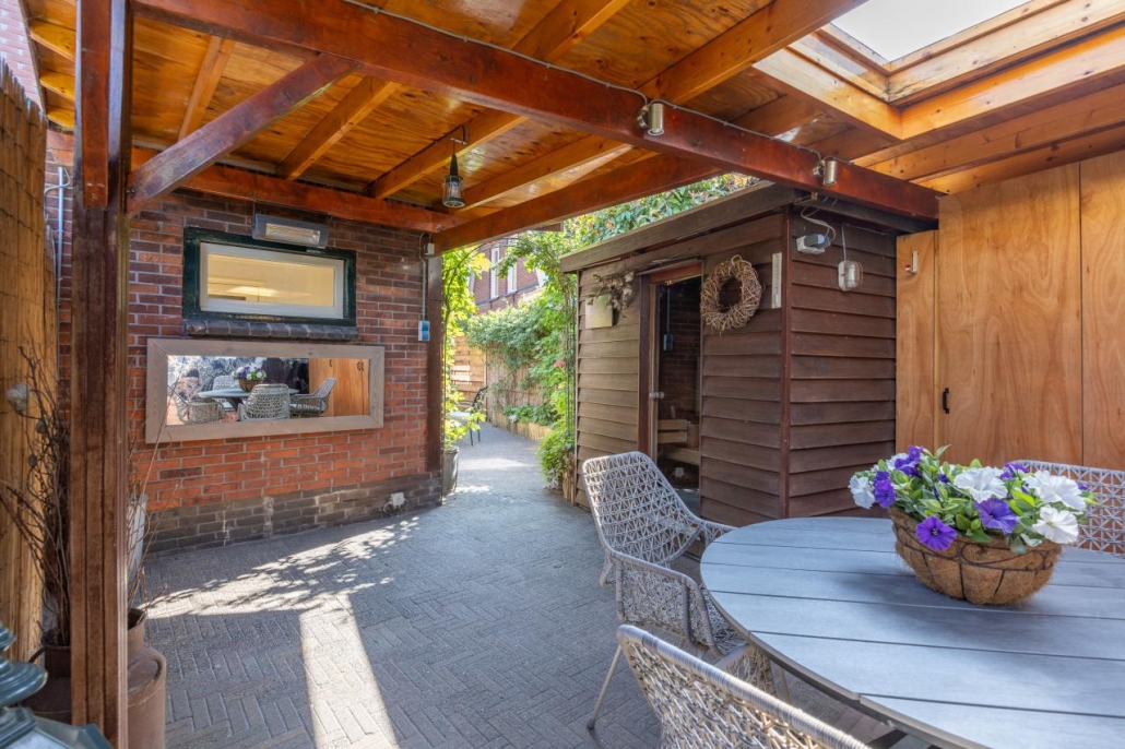 De achtertuin is gelegen op het zonnige zuidwesten en beschikt over een overkapping, sauna, achterom en een berging, waardoor het hier heerlijk ontspannen is.