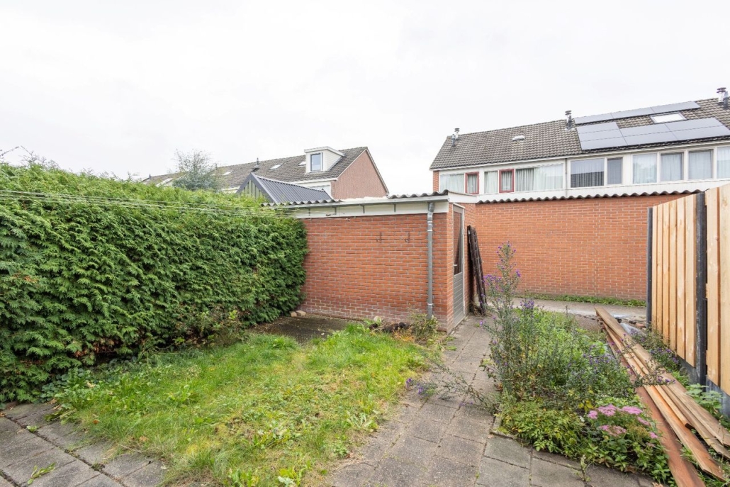 en verduurzaamde eindwoning met stenen berging en diepe achtertuin op een