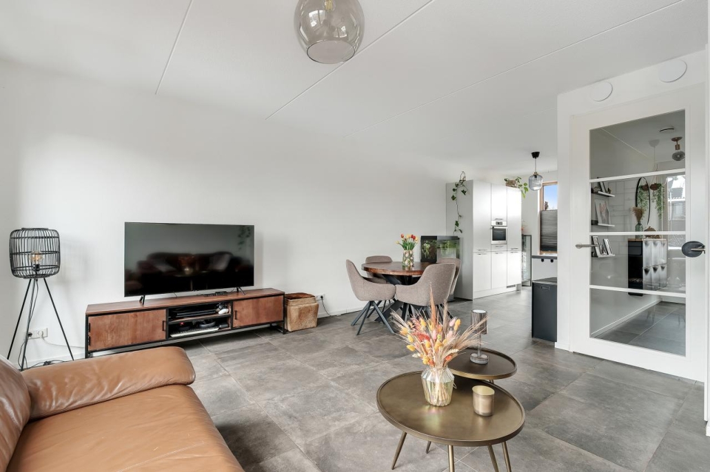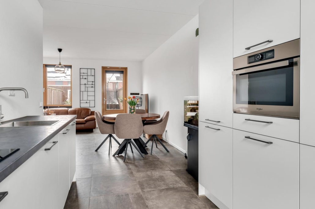 Je betreedt de woning via de ruime hal met toilet. Vervolgens kom je in een mooie open leefruimte met aan de voorzijde de keuken, ideaal voor kookliefhebbers. En aan de achterzijde vind je het gezellige woongedeelte met zicht op de tuin.