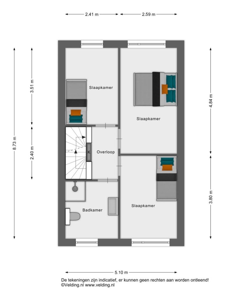 Hier bevinden zich drie ruime slaapkamers, een badkamer en een overloop.
