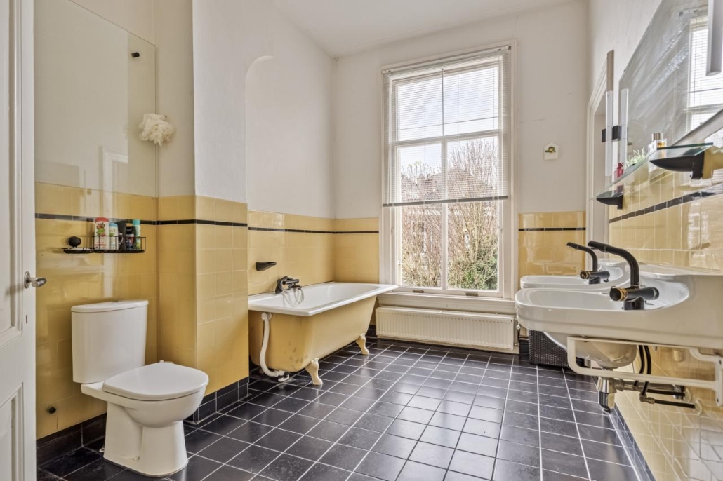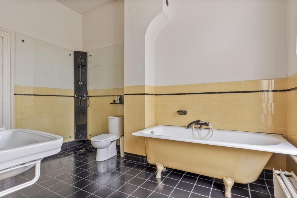Op de eerste verdieping bevindt zich een ruime overloop met origineel fonteintje, drie slaapkamers en een badkamer die doet denken aan een luxe spa. De badkamer is voorzien van klassiek sanitair, zoals een origineel ligbad op pootjes, dubbele wastafels, een toilet en een douche.