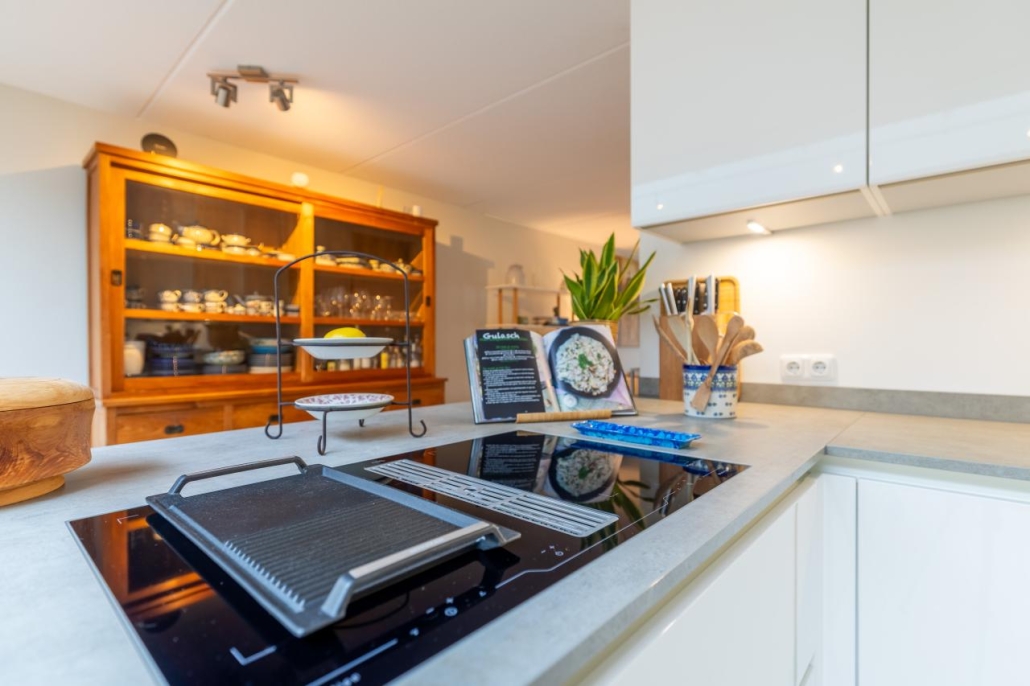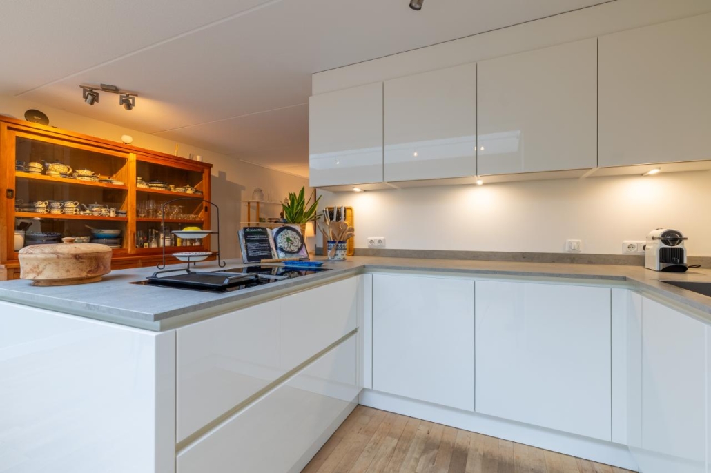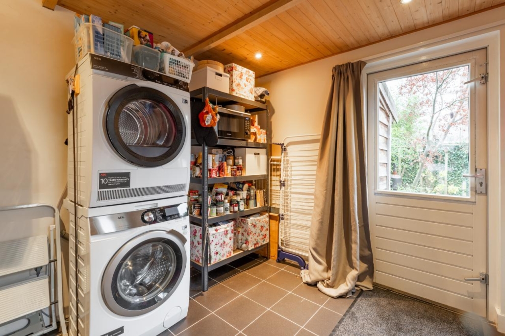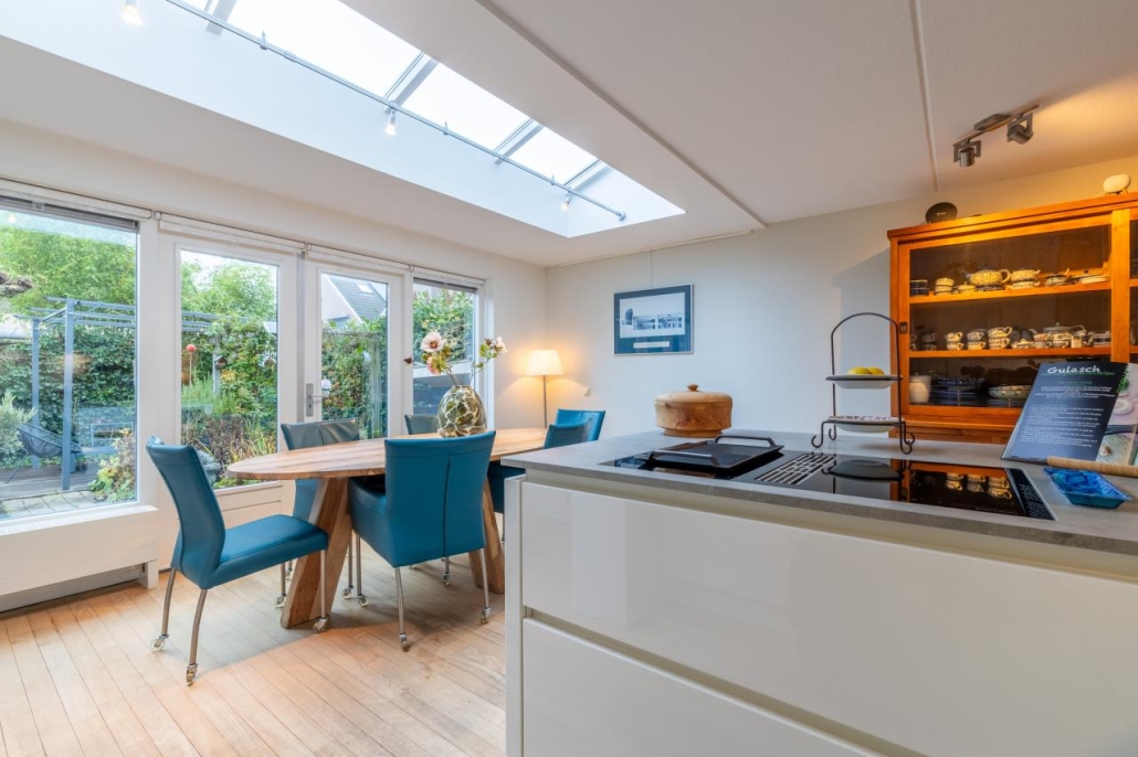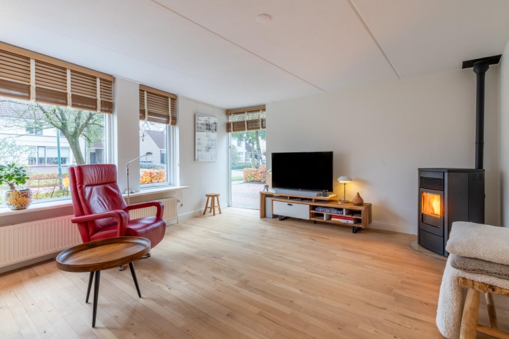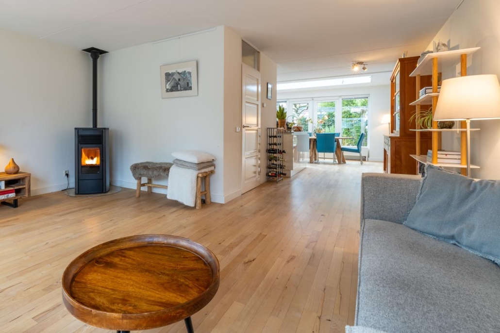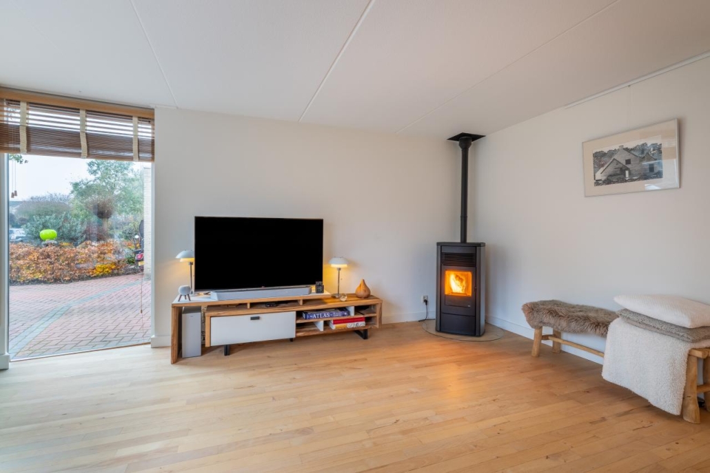 De gezellige woonkamer aan de voorzijde van de woning heeft een speelse erker, een houten vloer en de pellet kachel zorgt voor warmte en gezelligheid. De prachtige ruime keuken is van alle gemakken voorzien en heeft voldoende ruimte voor een grote eettafel om met het hele gezin te tafelen. De grote lichtstraat zorgt voor voldoende licht in de keuken. Vanuit de keuken is via de openslaande tuindeuren toegang tot de gunstig gelegen achtertuin. Ook is er toegang tot de bijkeuken waar zich de aansluiting van de wasmachine bevindt. Aansluitend de geïsoleerde garage met loopdeur naar de oprit voor de woning.