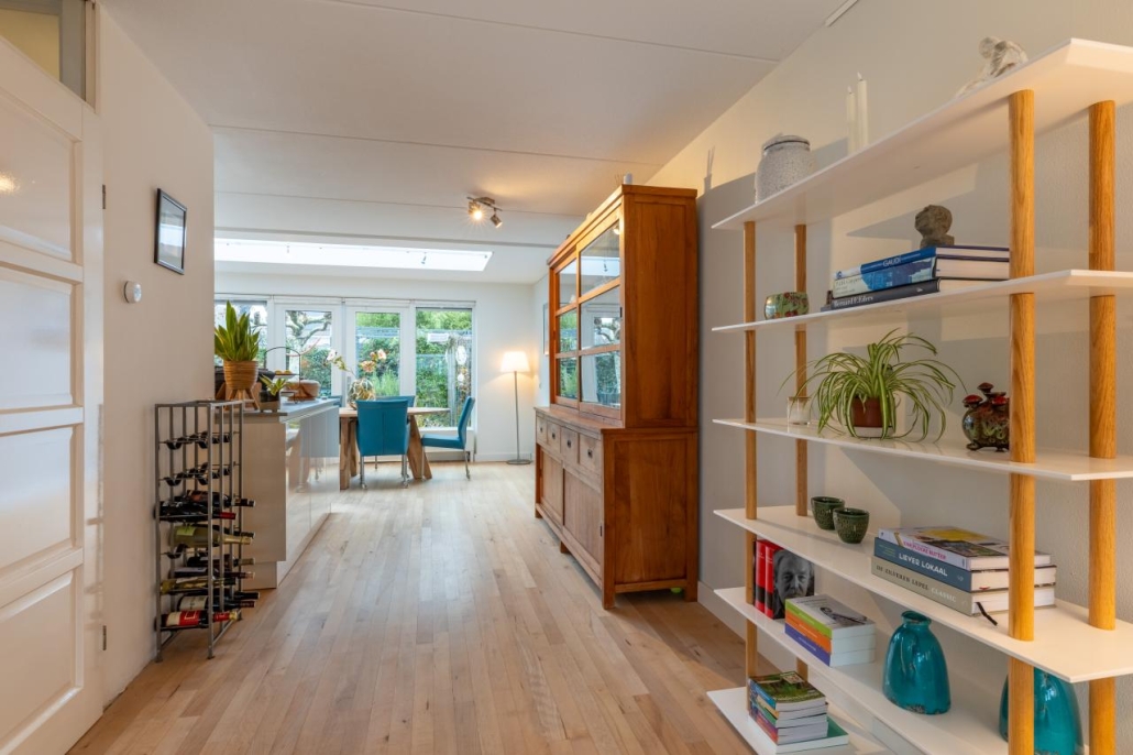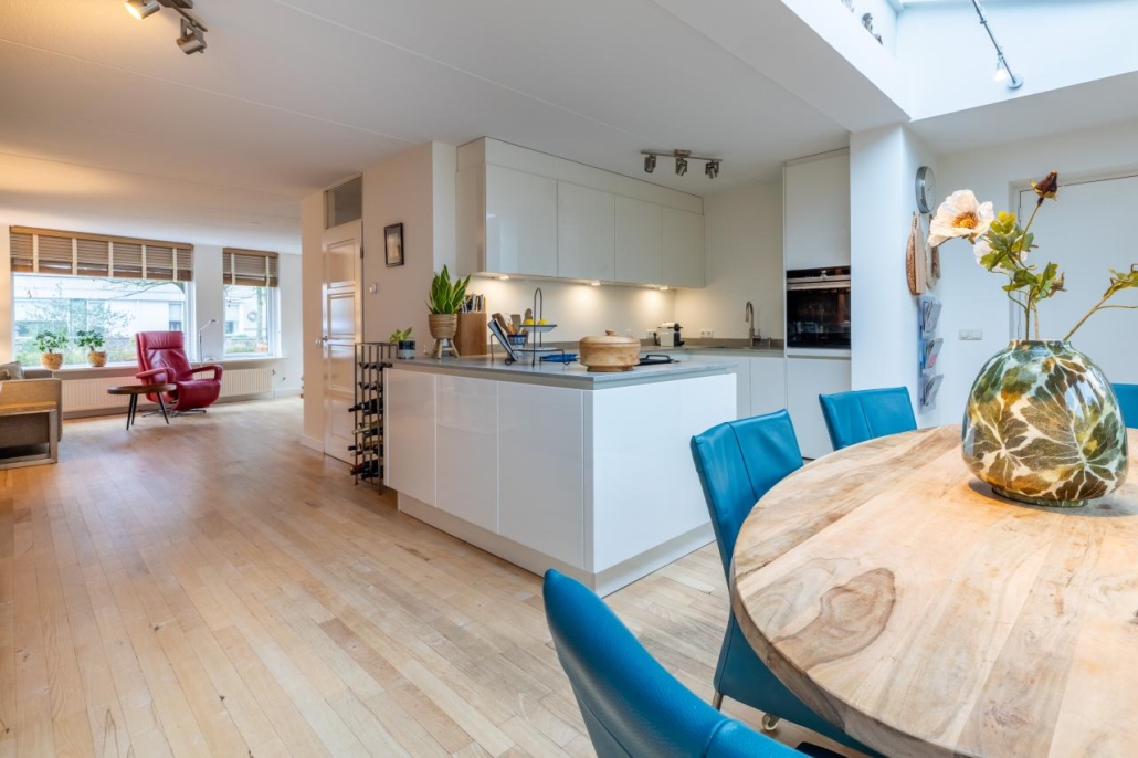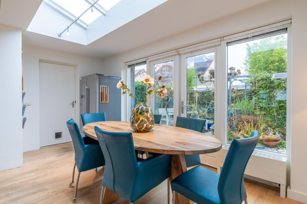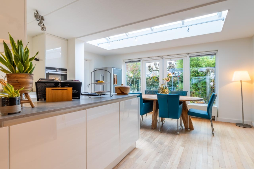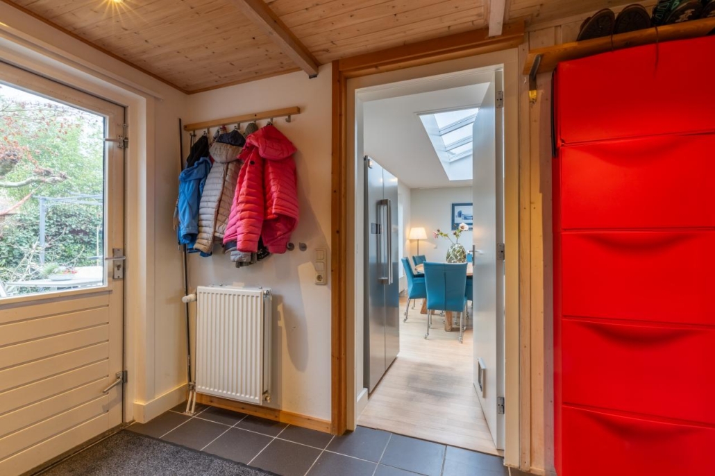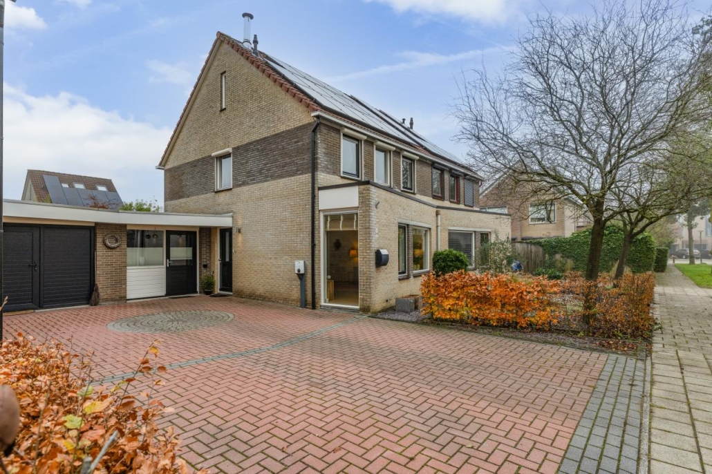 De gezellige woonkamer aan de voorzijde van de woning heeft een speelse erker, een houten vloer en de pellet kachel zorgt voor warmte en gezelligheid. De prachtige ruime keuken is van alle gemakken voorzien en heeft voldoende ruimte voor een grote eettafel om met het hele gezin te tafelen. De grote lichtstraat zorgt voor voldoende licht in de keuken. Vanuit de keuken is via de openslaande tuindeuren toegang tot de gunstig gelegen achtertuin. Ook is er toegang tot de bijkeuken waar zich de aansluiting van de wasmachine bevindt. Aansluitend de geïsoleerde garage met loopdeur naar de oprit voor de woning.