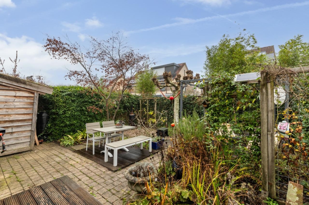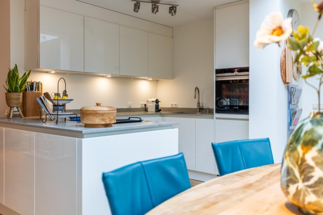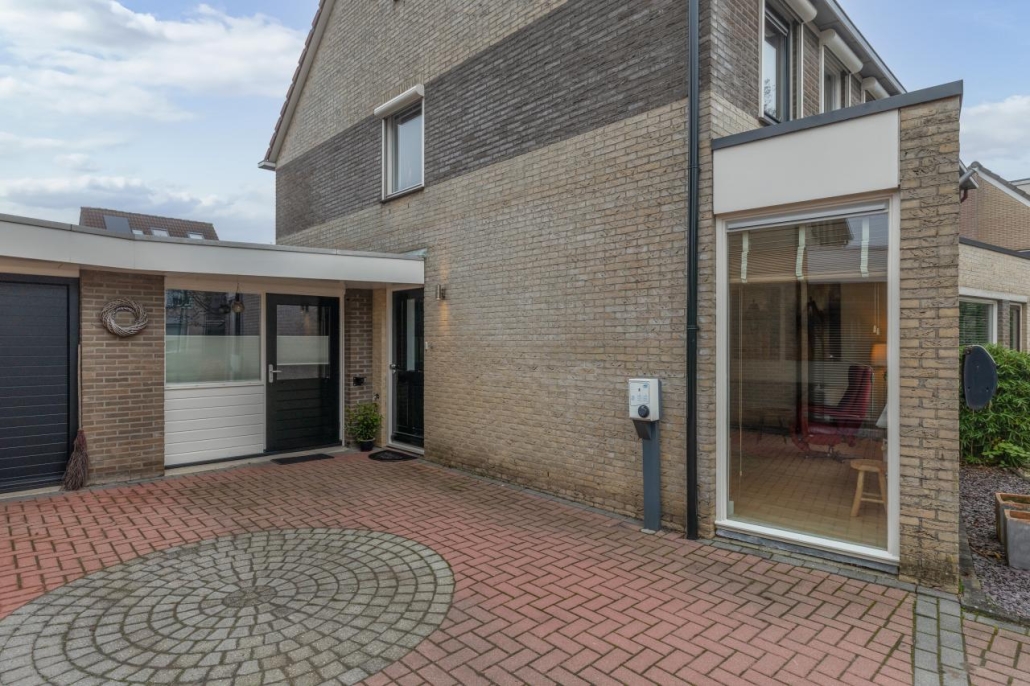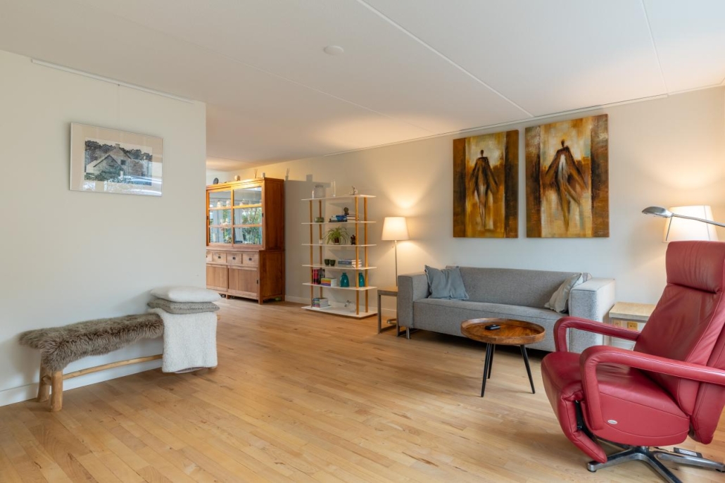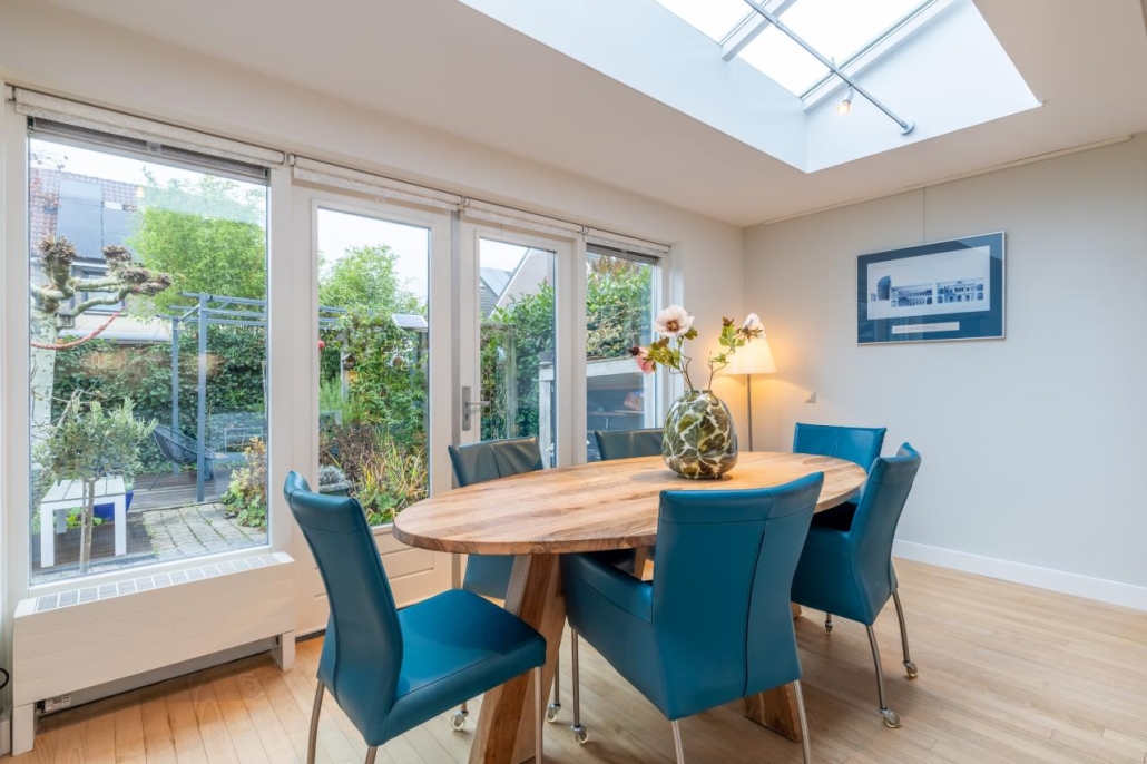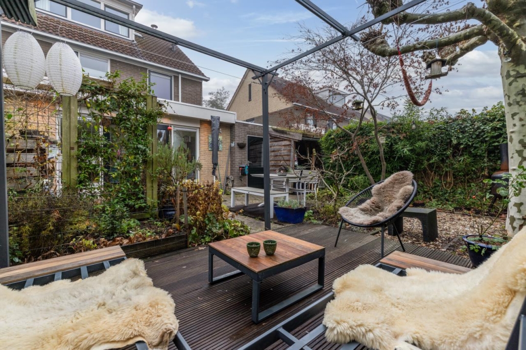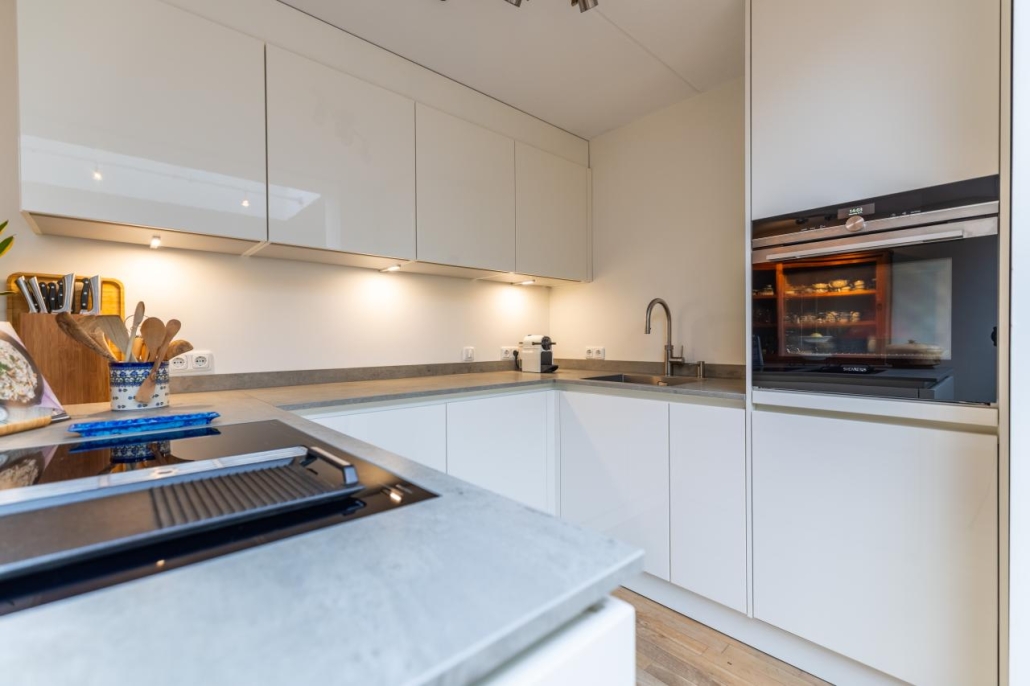 De gezellige woonkamer aan de voorzijde van de woning heeft een speelse erker, een houten vloer en de pellet kachel zorgt voor warmte en gezelligheid. De prachtige ruime keuken is van alle gemakken voorzien en heeft voldoende ruimte voor een grote eettafel om met het hele gezin te tafelen. De grote lichtstraat zorgt voor voldoende licht in de keuken. Vanuit de keuken is via de openslaande tuindeuren toegang tot de gunstig gelegen achtertuin. Ook is er toegang tot de bijkeuken waar zich de aansluiting van de wasmachine bevindt. Aansluitend de geïsoleerde garage met loopdeur naar de oprit voor de woning.