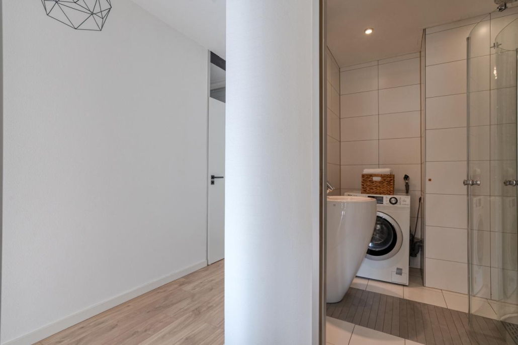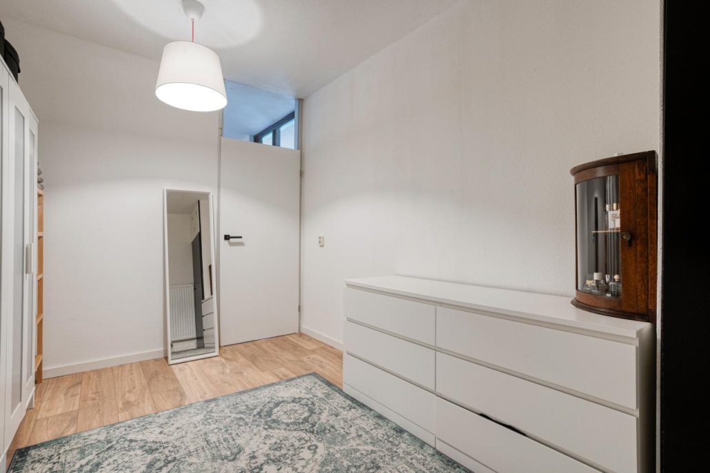 Slapen & Baden: Het appartement beschikt over twee volwaardige slaapkamers. De hoofdslaapkamer is zeer ruim en heeft een directe loopdeur naar het terras. De tweede kamer is momenteel ingericht als riante inloopkast, maar is ook uitstekend geschikt als hobbykamer of logeerkamer voor de kleinkinderen. De moderne badkamer is voorzien van een drempelloze inloopdouche met een veilige instap, een strak wastafelmeubel en aansluitingen voor witgoed op een prettige werkhoogte.