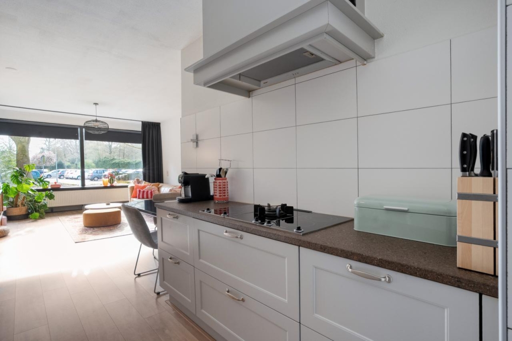 Wonen & Koken: De woonkamer is heerlijk licht dankzij de kamerbrede raampartijen die uitzicht bieden op het omliggende groen. De open keuken is modern uitgevoerd in een lichte kleurstelling en beschikt over een gezellige eethoek. Dit is een fijne plek voor uw ochtendkoffie of om comfortabel aan te zitten terwijl u kookt met de hoogwaardige inbouw-apparatuur.