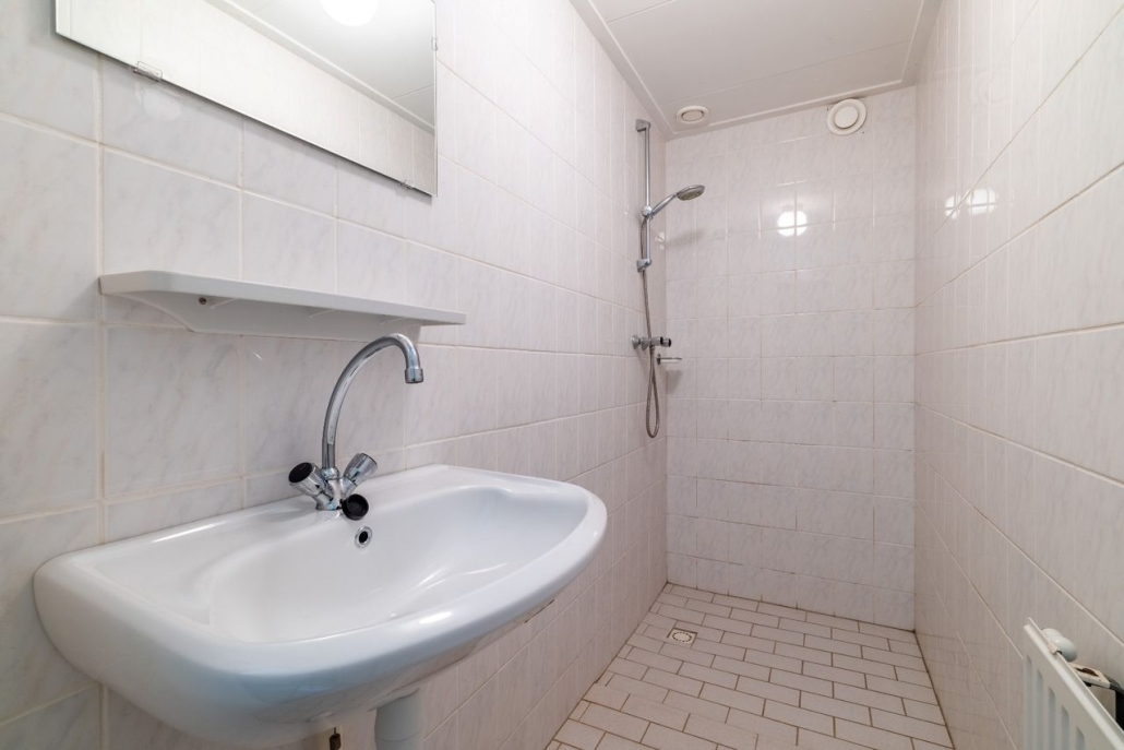 De lichte badkamer is voorzien van een wastafel, douche en radiator.