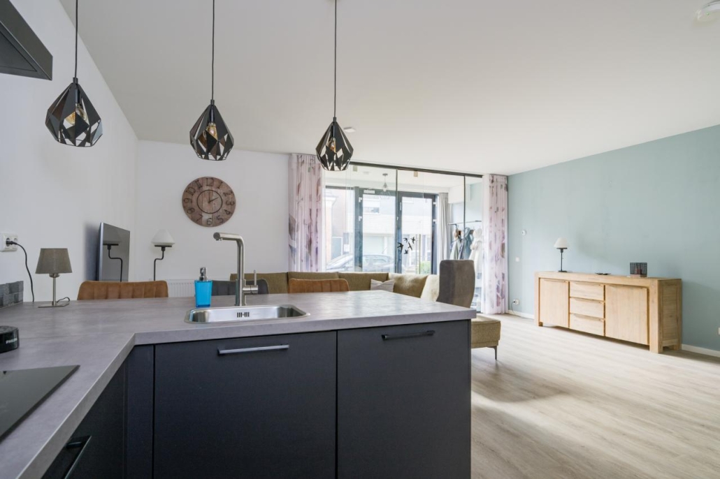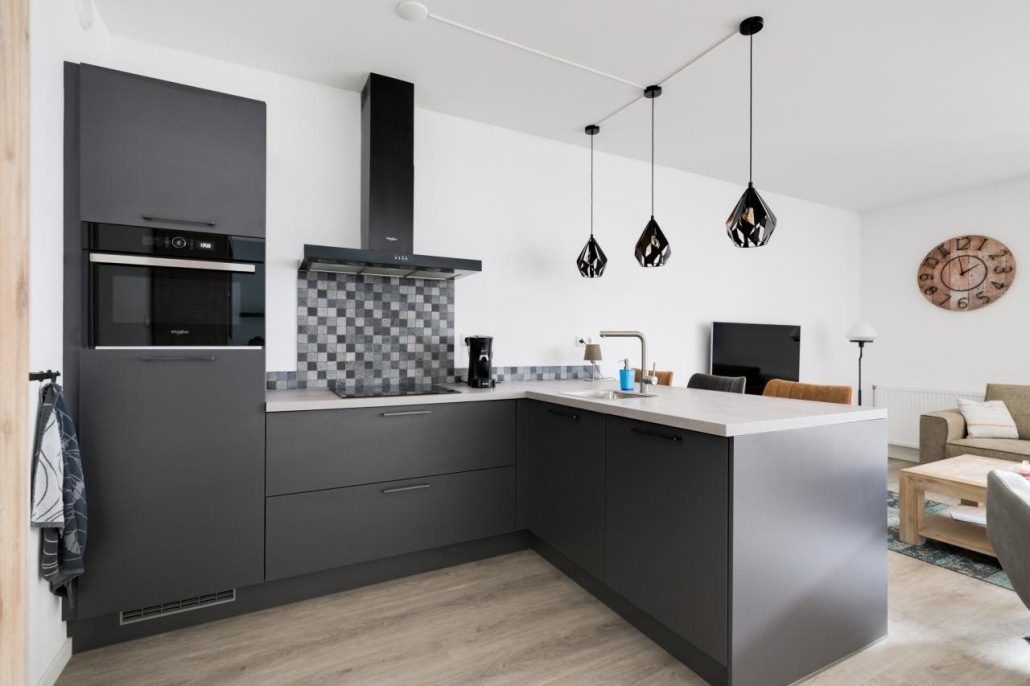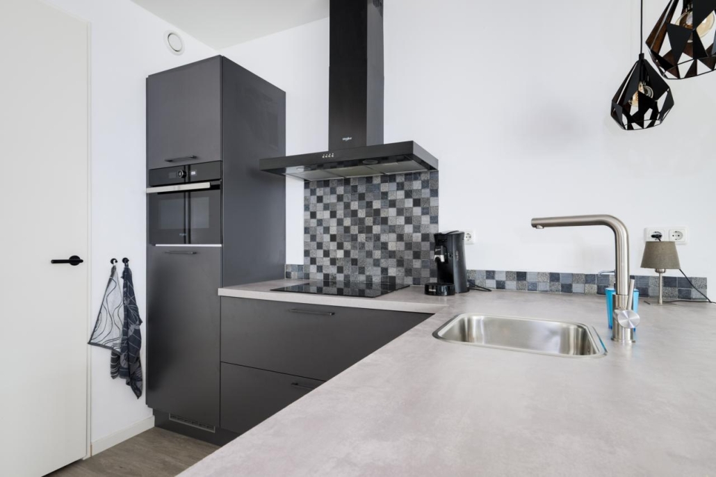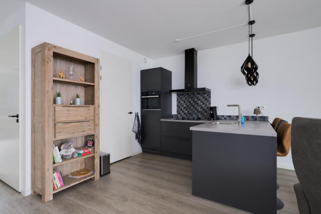De moderne keuken is uitgevoerd met een hoekopstelling met bar. De keuken is voorzien van diverse inbouwapparatuur, waaronder een combi-magnetron, een inductiekookplaat, afzuigkap en een ingebouwde koelkast met vriesvak. Dankzij de ruime lades en handige kastjes is er meer dan voldoende opbergruimte. Vanuit de keuken is een aparte berging bereikbaar, waar zich ook de cv-installatie bevindt.