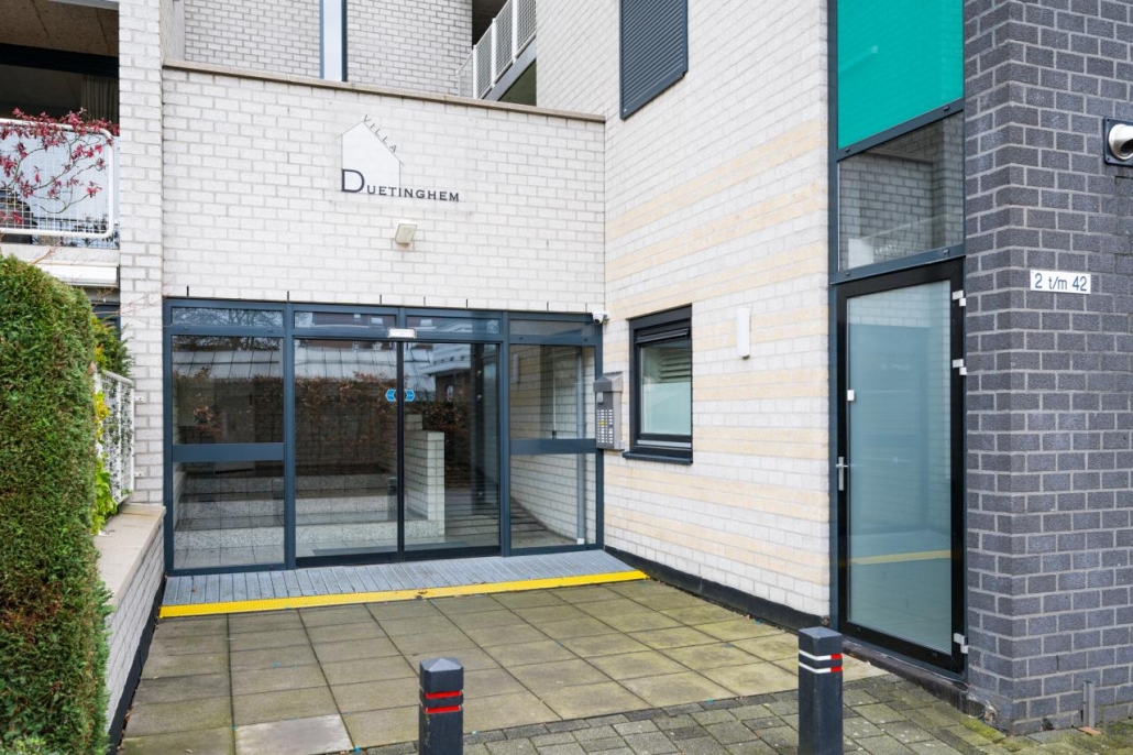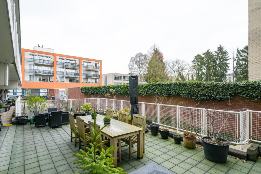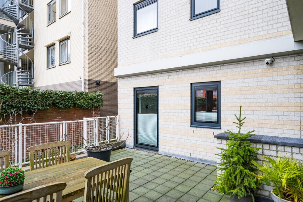 Het appartement beschikt over een eigen entree aan de straatzijde. Aan deze kant bevindt zich ook het zonnige terras. Dankzij de gunstige ligging op het zuiden kunt u hier de hele dag van de zon genieten.