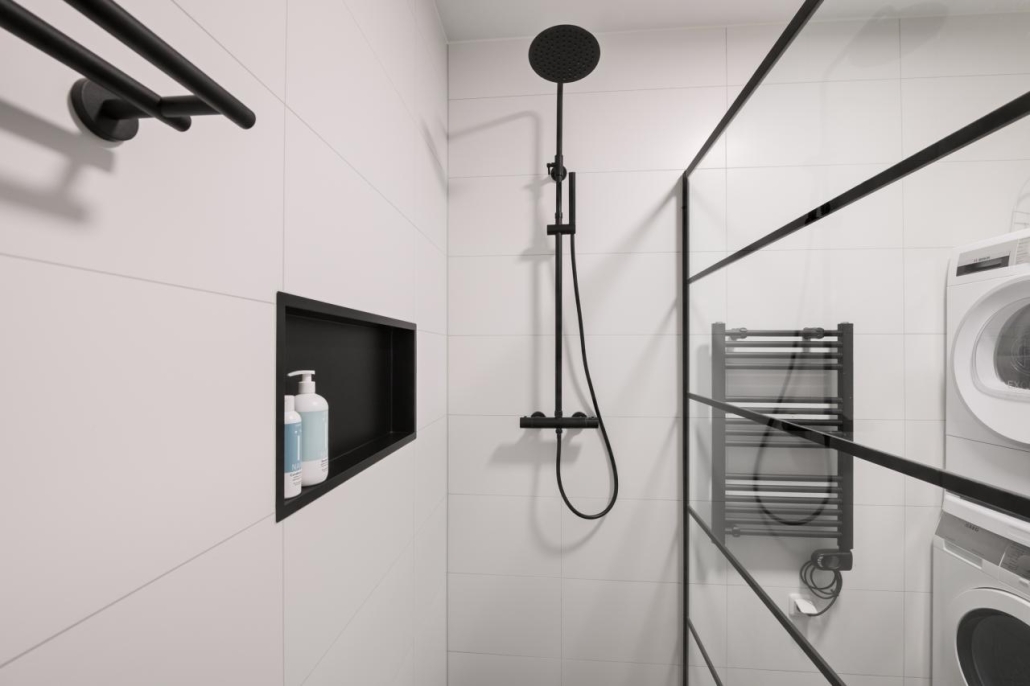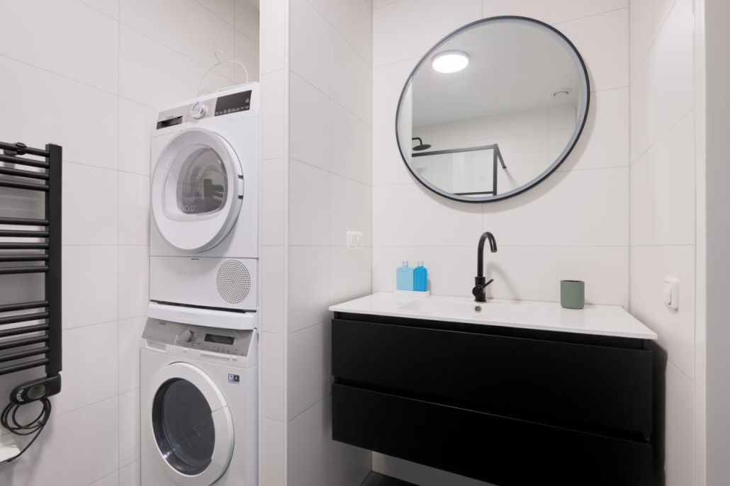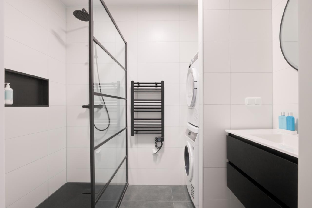De moderne badkamer is uitgerust met een inloopdouche, een wastafel met meubel, een handdoekradiator en een opstelplaats voor de wasmachine en droger. Het appartement beschikt daarnaast over een separaat toilet.