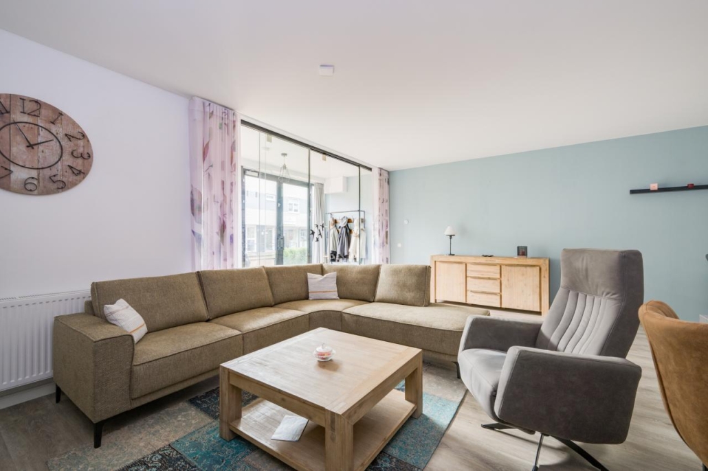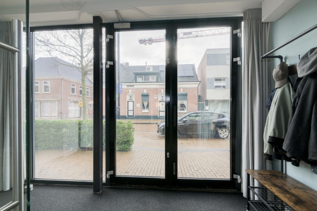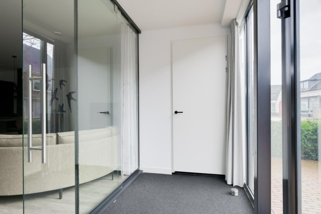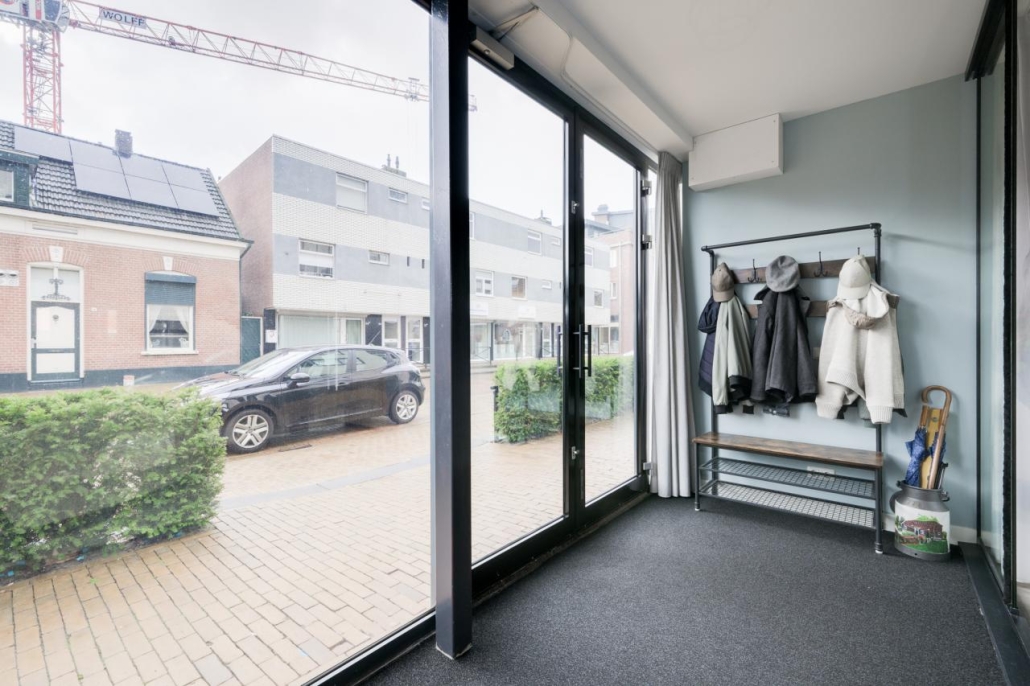 De pui van de woning is volledig van glas en zorgt voor veel licht in de woonkamer. Toch kom je na binnenkomst niet meteen in de woonkamer: door de slim geplaatste glazen wand is er een hal ontstaan, terwijl het daglicht gewoon behouden blijft in de rest van de ruimte. In deze hal is ook de inpandige berging met voldoende opbergruimte. Hier bevindt zich ook de meterkast.