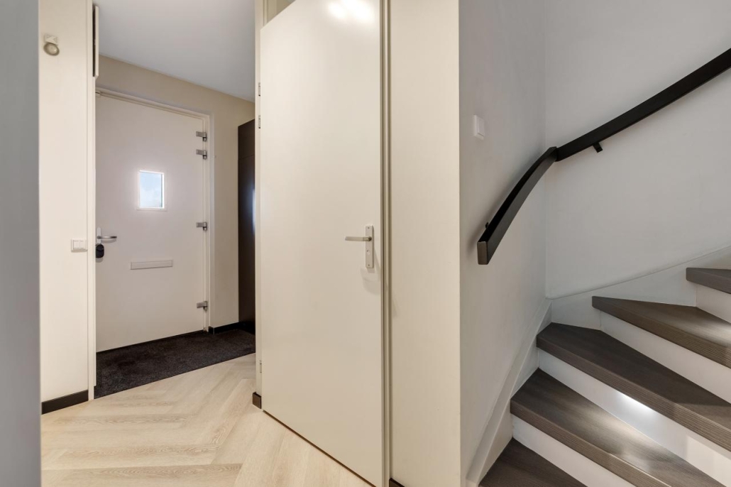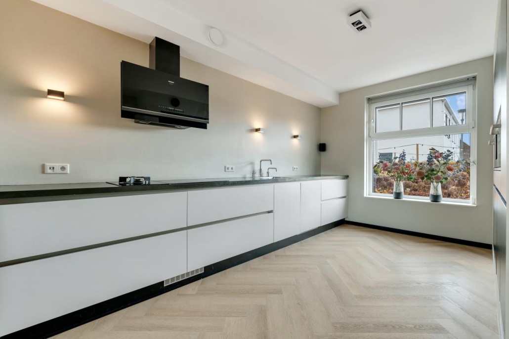 Bij binnenkomst in de hal tref je het toilet, de meterkast, de trapopgang en toegang tot de ruime lichte woonkamer met open keuken. De keuken is gelegen aan de voorzijde van de woning en is voorzien van een grote kastenwand, veel werkruimte en hoogwaardige inbouwapparatuur. Dit maakt de keuken niet alleen functioneel, maar ook stijlvol en modern. De gezellige eethoek naast de keuken is de perfecte plek voor familiediners.