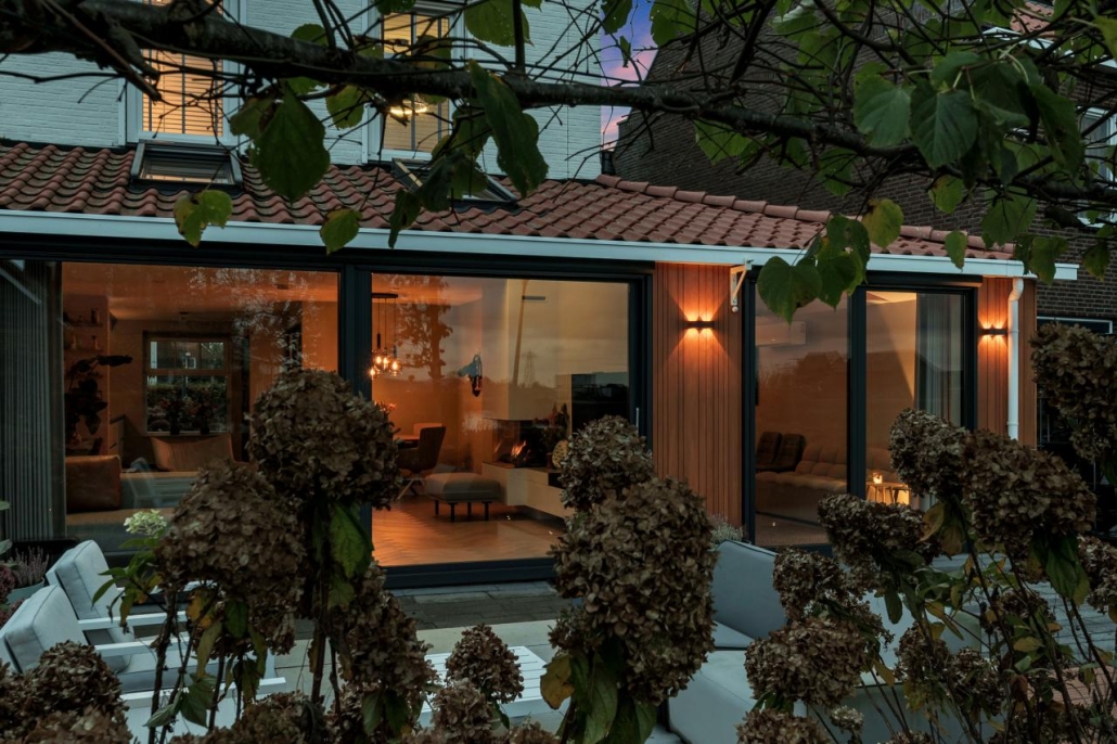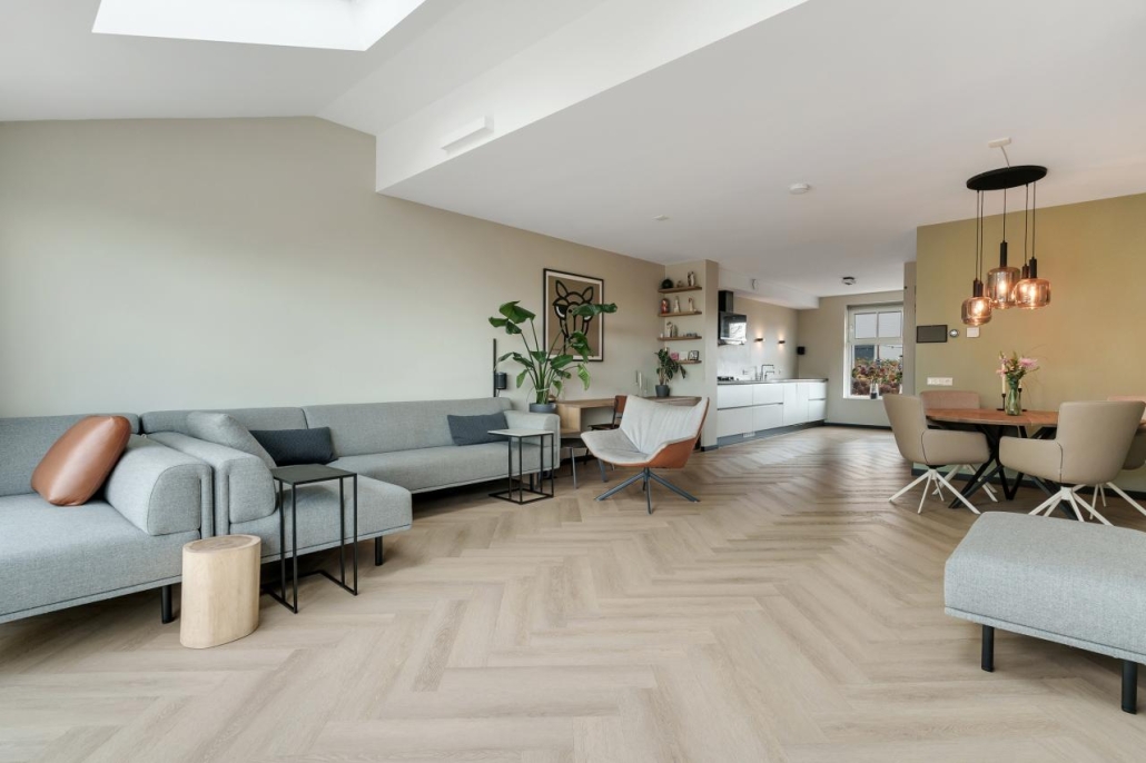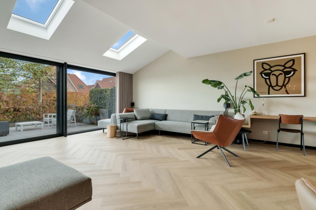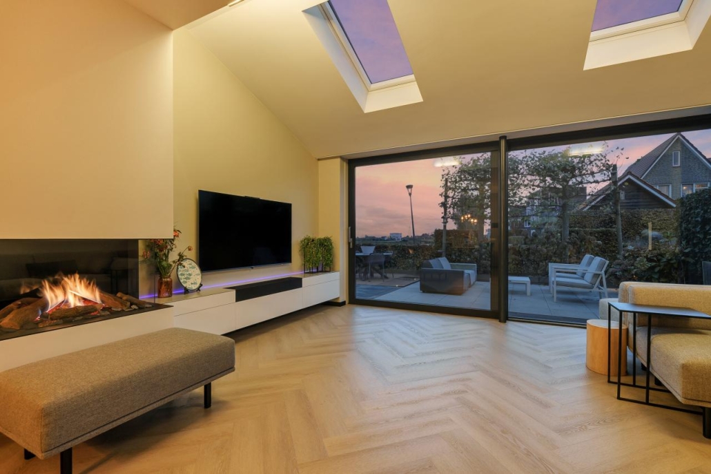 De woonkamer bevindt zich aan de achterzijde van de woning en biedt, dankzij de grote raampartijen en dakramen, veel natuurlijk licht en een schitterend uitzicht op de tuin en het water. De aanwezige gashaard zorgt voor een extra sfeervolle en gezellige ambiance, vooral tijdens de koudere maanden. De woonkamer heeft ook een grote schuifpui die direct naar de tuin leidt, waardoor je het buitenleven eenvoudig binnen kunt halen.