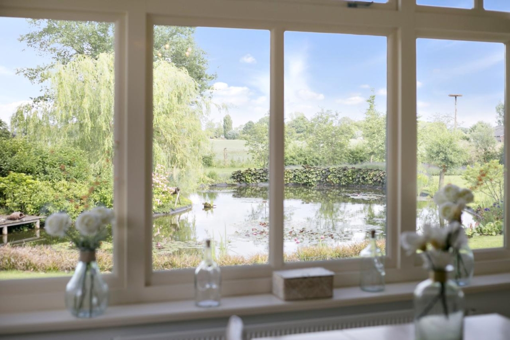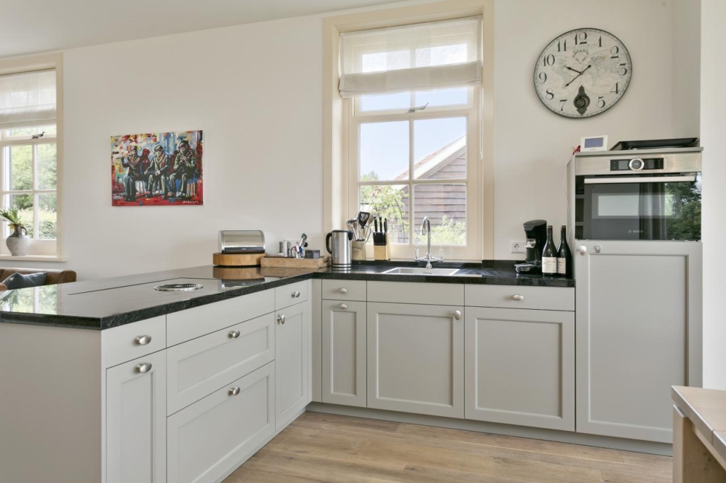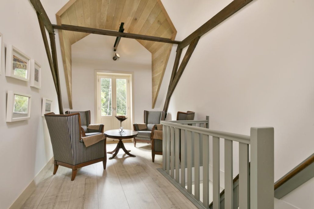 Op de begane grond van het koetshuis (gerenoveerd in 2017) vindt u vanuit de entree met gang, toilet en utility room een riante woonkamer, keuken, garage en overkapping. Ook vanuit dit koetshuis geniet u van een optimale daglichttoetreding en bovenal van een fantastisch uitzicht op het groen en in het bijzonder van de vijver. De woonkamer met open keuken biedt u een aangename plek om in alle rust te ontspannen en te dineren. Daarnaast is de keuken in 2017 voorzien van nieuwe apparatuur; koelkast, vaatwasser, een inductiekookplaat met ingebouwde afzuiginstallatie (Bora) en een combi oven.