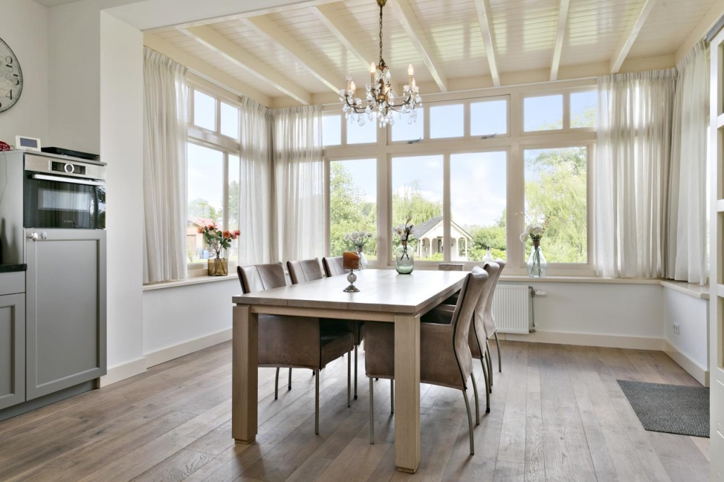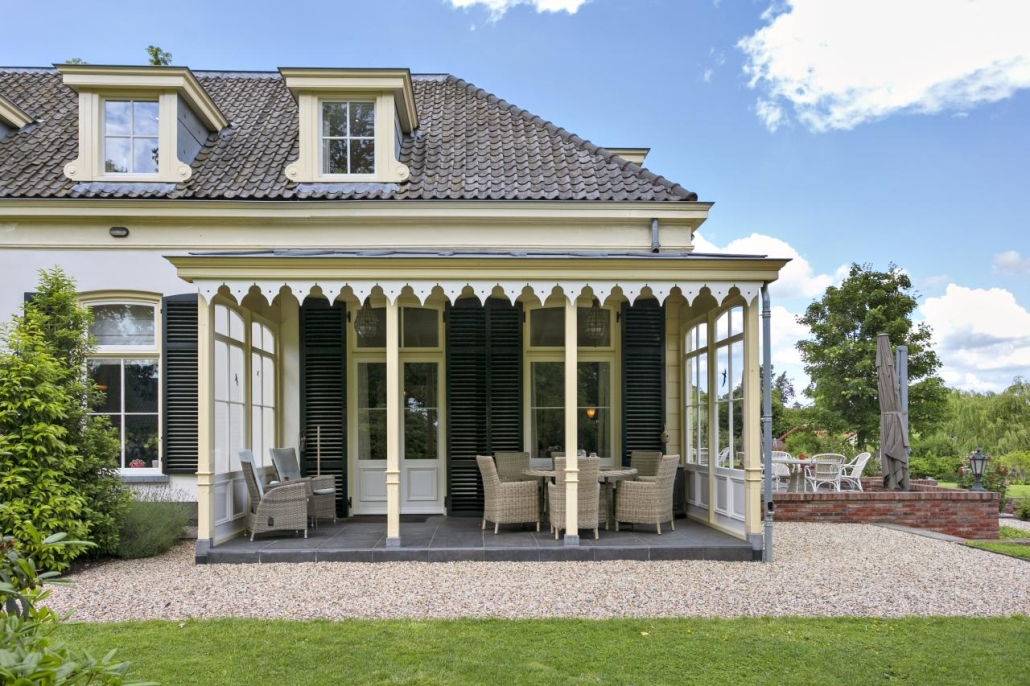 Heeft u 's zomers behoefte om op een schaduwrijk terras te dineren, dan kan dat eenvoudig onder de veranda (zuidzijde) die vanuit de eetkamer toegankelijk is.