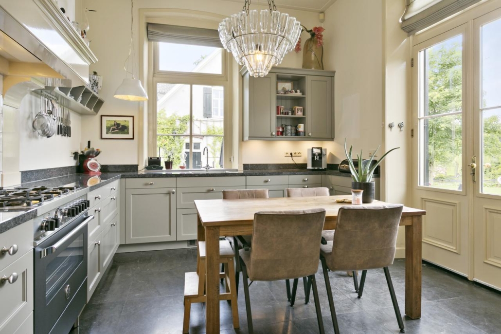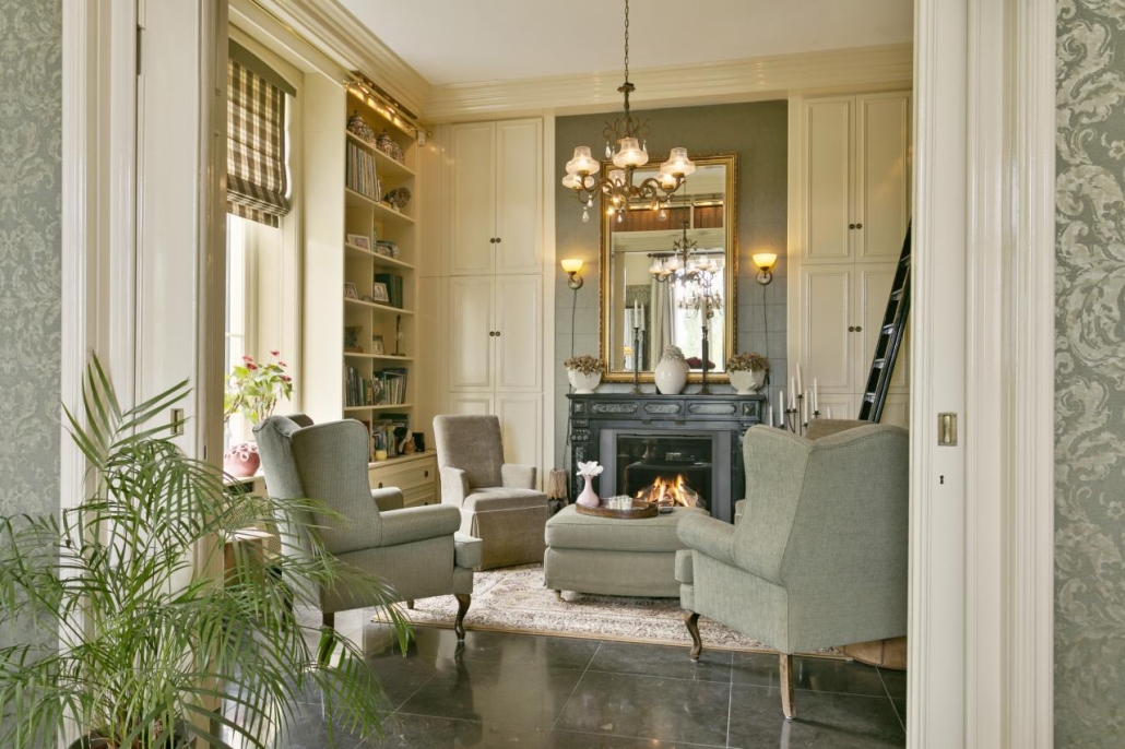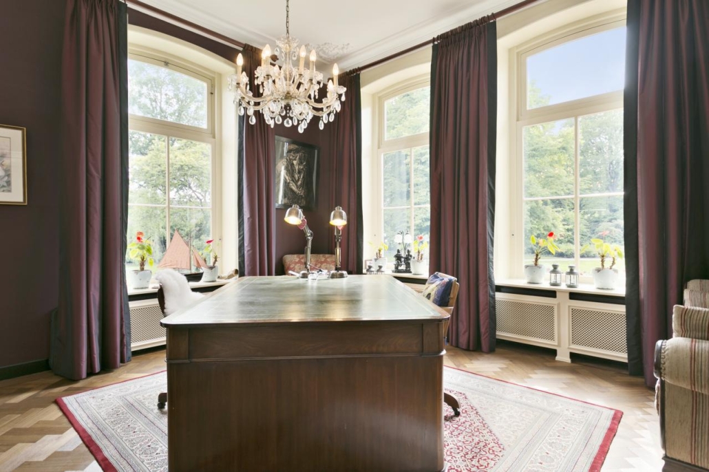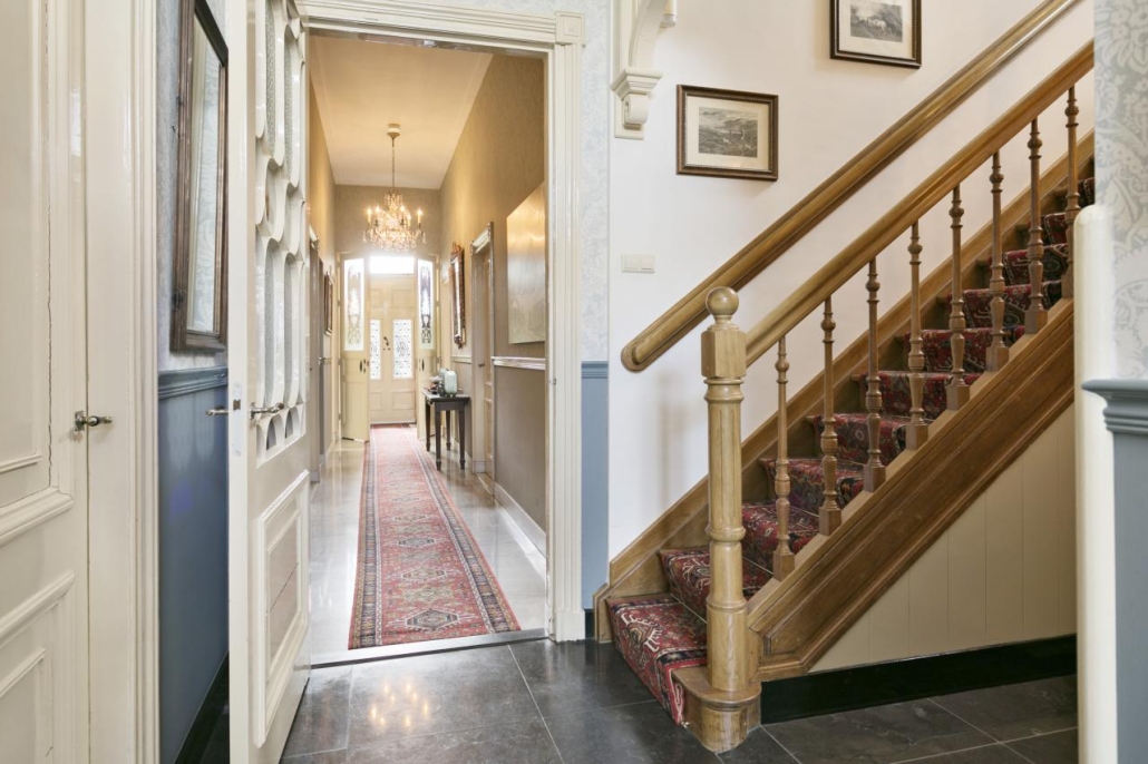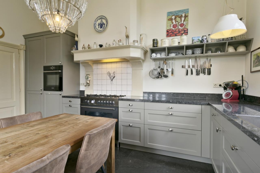 Vanuit de entree met authentiek tochtportaal biedt de lange centrale gang toegang tot alle leefruimtes op de begane grond: woonkamer, keuken, toilet, werkkamer, bibliotheek en eetkamer. Bij binnenkomst van de woonkamer zult u versteld staan van de klasse die deze uitstraalt. Details zoals de plafondornamenten, de haard en de stijlvolle schouw geven deze leefruimte enorm veel karakter. Bovendien heeft u vanuit de woonkamer een fenomenaal uitzicht op de tuin rondom het pand. De woonkeuken is goed onderhouden, biedt tevens een fraai uitzicht op de zij- en achtertuin en is belegd met een stijlvolle, natuurstenen vloer. Daarbij is de keuken voorzien van de benodigde keukenapparatuur: koelkast, vrieskast, vaatwasser, combimagnetron, fornuis en gasoven.