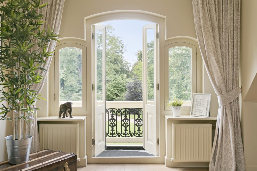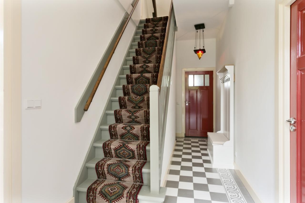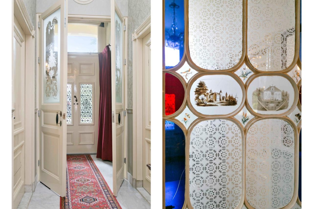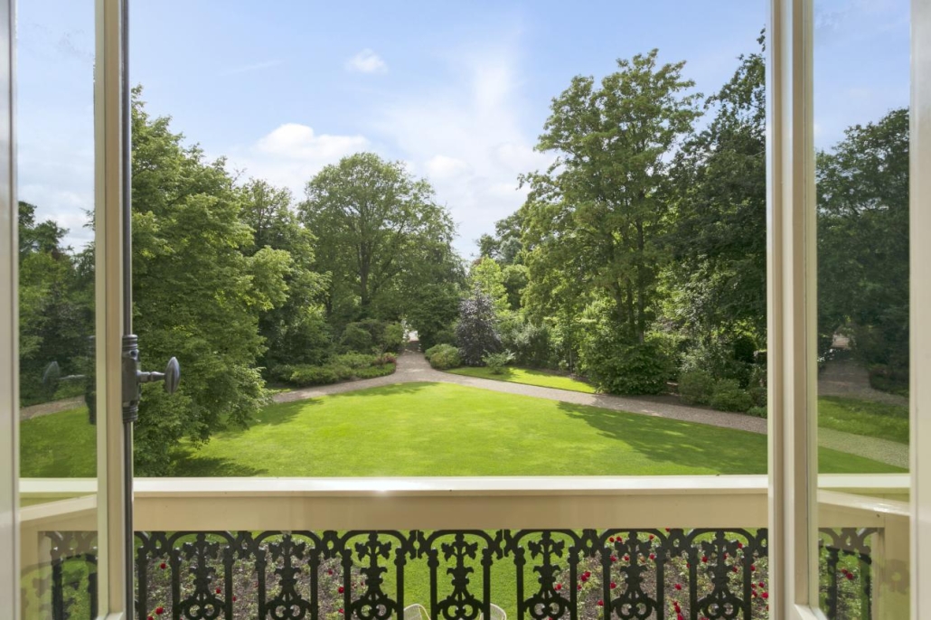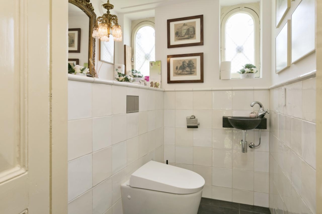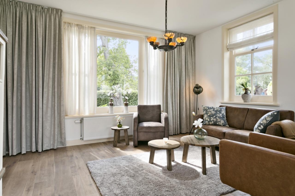 Vanuit de entree met authentiek tochtportaal biedt de lange centrale gang toegang tot alle leefruimtes op de begane grond: woonkamer, keuken, toilet, werkkamer, bibliotheek en eetkamer. Bij binnenkomst van de woonkamer zult u versteld staan van de klasse die deze uitstraalt. Details zoals de plafondornamenten, de haard en de stijlvolle schouw geven deze leefruimte enorm veel karakter. Bovendien heeft u vanuit de woonkamer een fenomenaal uitzicht op de tuin rondom het pand. De woonkeuken is goed onderhouden, biedt tevens een fraai uitzicht op de zij- en achtertuin en is belegd met een stijlvolle, natuurstenen vloer. Daarbij is de keuken voorzien van de benodigde keukenapparatuur: koelkast, vrieskast, vaatwasser, combimagnetron, fornuis en gasoven.