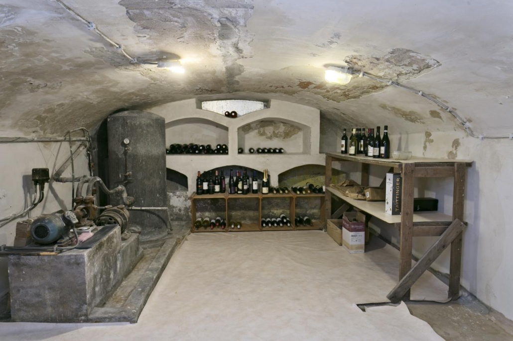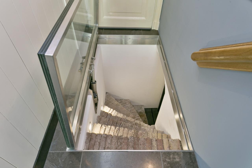 Keuken en eetkamer zijn onderkelderd. De kelder biedt voldoende ruimte om deels dienst te doen als wijnkelder. De kelder is toegankelijk via een uniek (drielaags!) glazen luik, dat elektrisch wordt aangedreven.