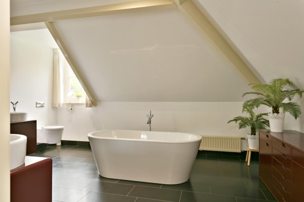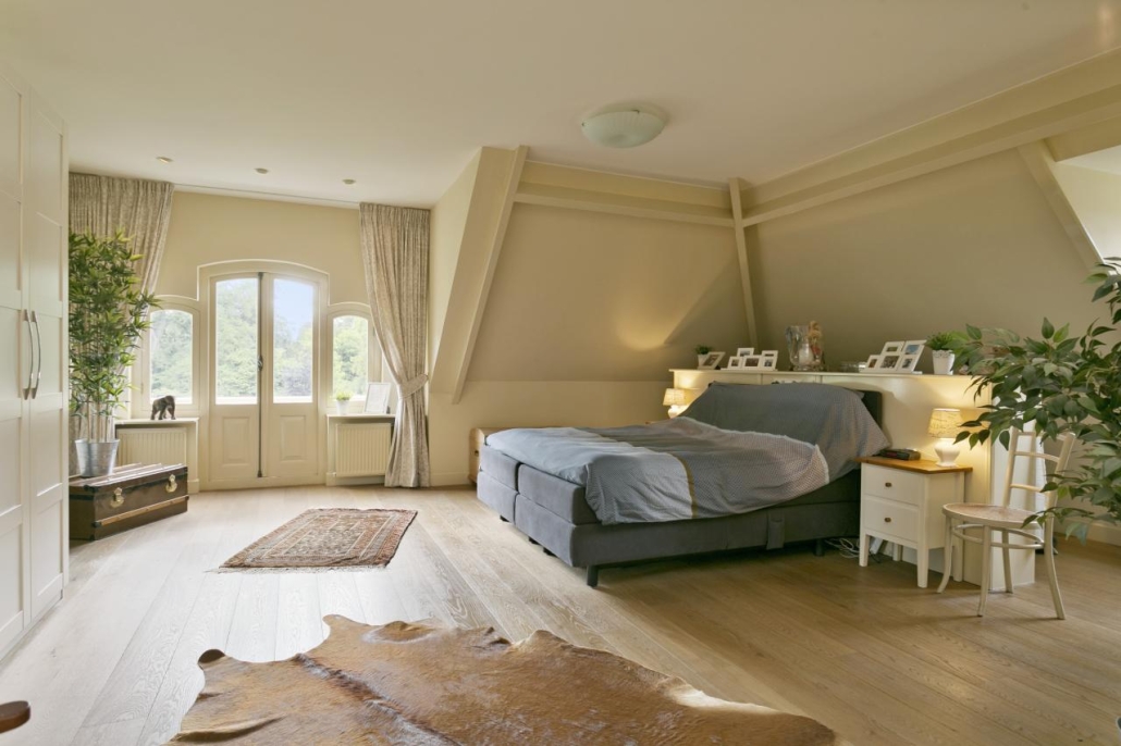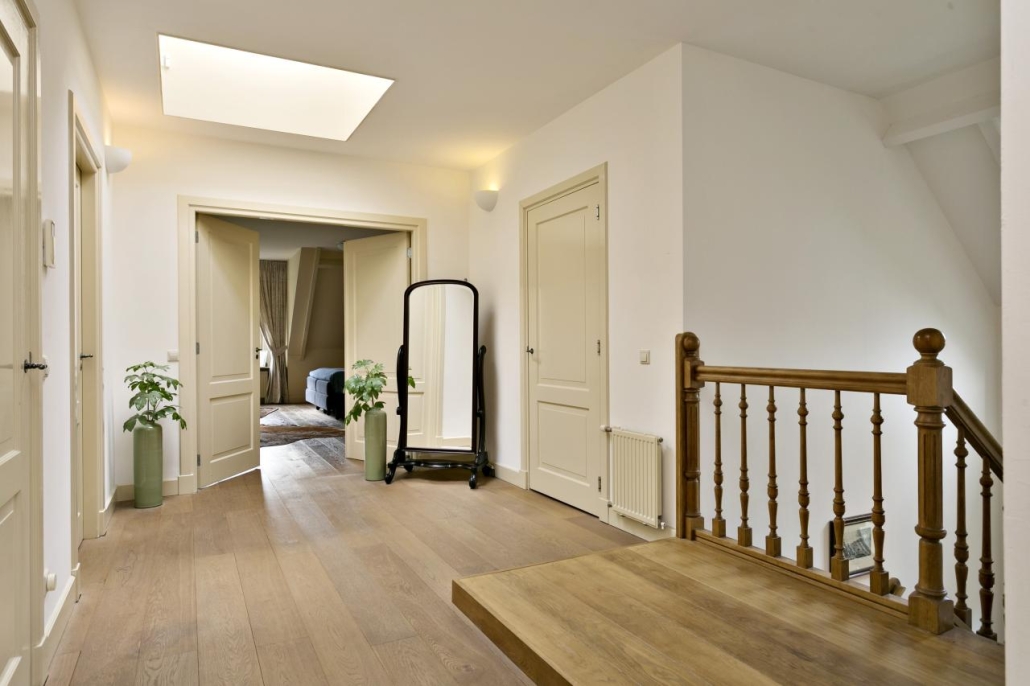 Middels de smaakvolle bordestrap bereikt u de overloop op de verdieping. Op deze etage bevinden zich vier slaapkamers, twee badkamers, een separaat toilet, een wasruimte en een berging. De master bedroom met ensuite badkamer en toilet is meer dan royaal opgezet en beschikt over een balkon waarvandaan u een magnifieke uitkijk heeft op uw boomrijke voortuin. Beide badkamers verkeren in een uitstekende staat. De ene badkamer _ die naast de master bedroom is gesitueerd _ is voorzien van een comfortabel ligbad, een luxe stoomdouchecabine, twee wastafels in meubel en een hangcloset. De tweede badkamer beschikt tevens over een ligbad, een wastafel, een designradiator en een douche. De resterende slaapkamers zijn goed onderhouden en genieten een aangename lichtinval.