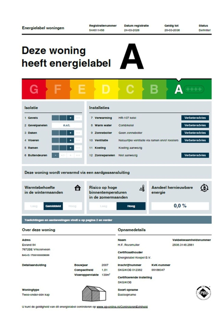 -de woning is voorzien van spouw-, vloer-, dak- en glasisolatie en beschikt over energielabel A