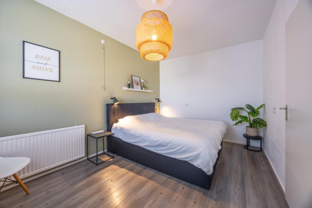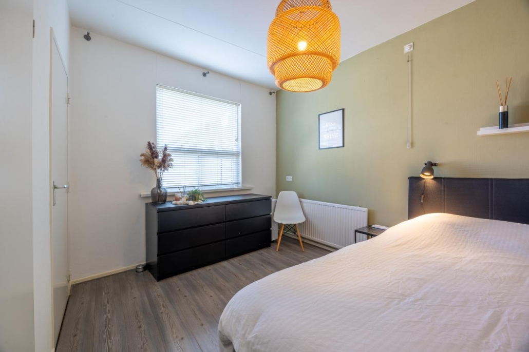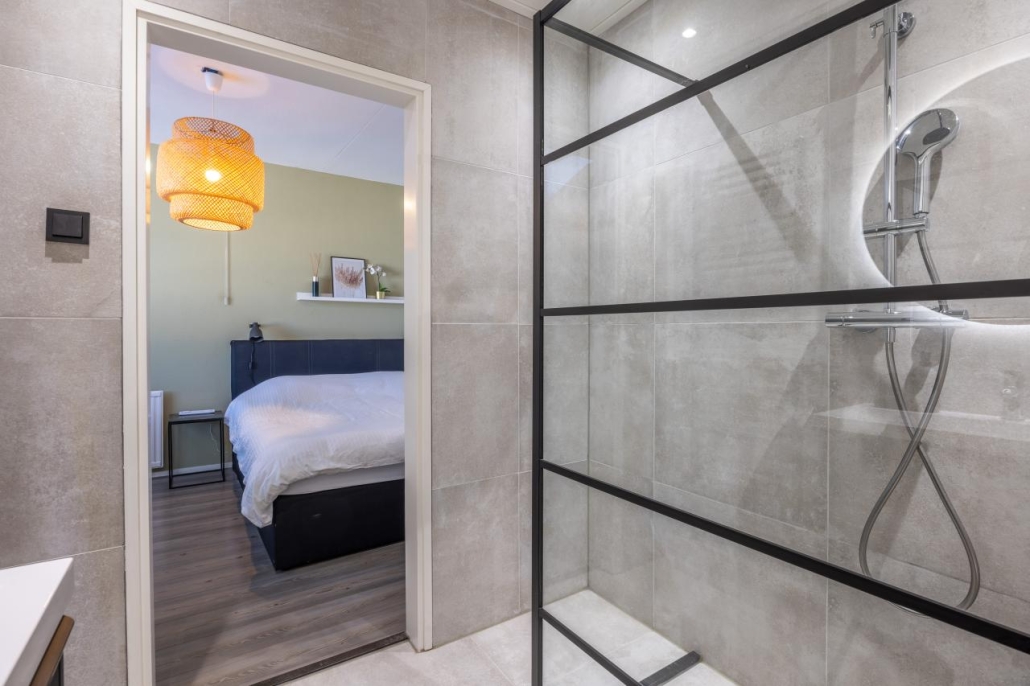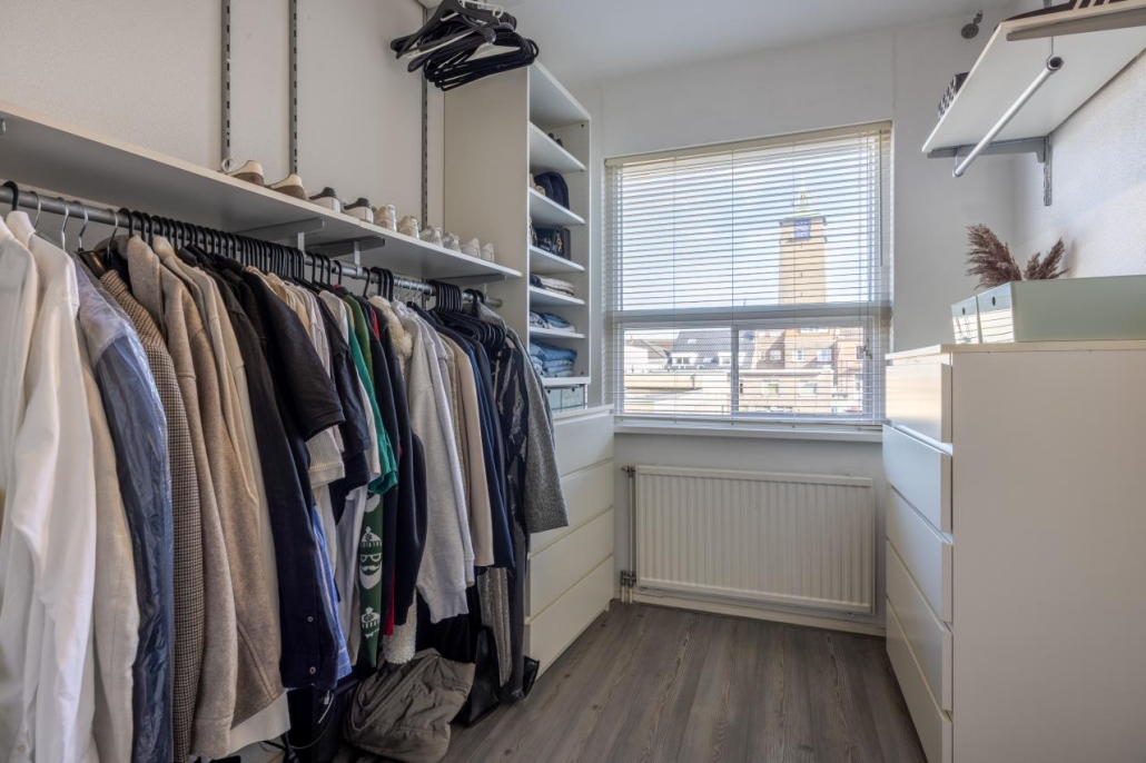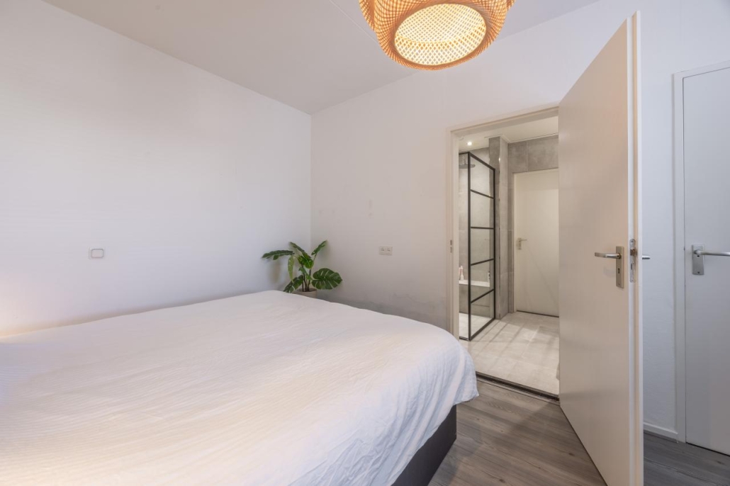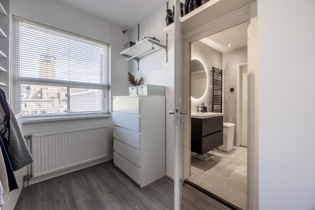 Aan de rustige achterzijde van het appartement bevinden zich twee slaapkamers. De hoofdslaapkamer is een royale en lichte ruimte. De tweede slaapkamer is momenteel ingericht als garderobe, maar biedt voldoende ruimte en licht om in te richten als volwaardige slaapkamer. Tussen beide slaapkamers in ligt de moderne badkamer, die in 2023 volledig is vernieuwd. Deze is direct toegankelijk vanuit beide kamers en voorzien van een inloopdouche en wastafelmeubel.