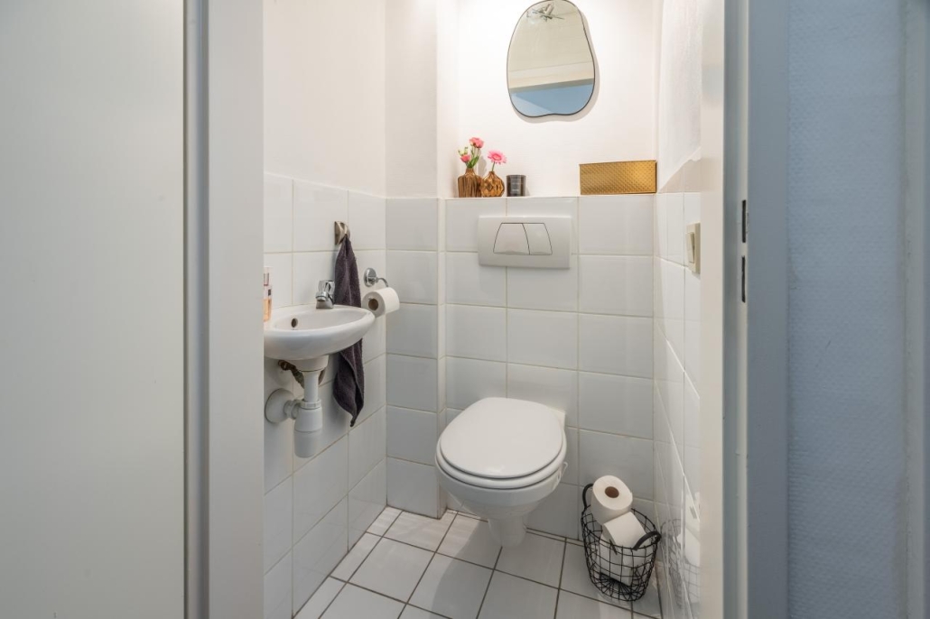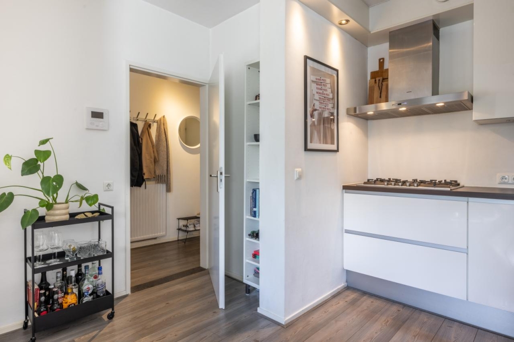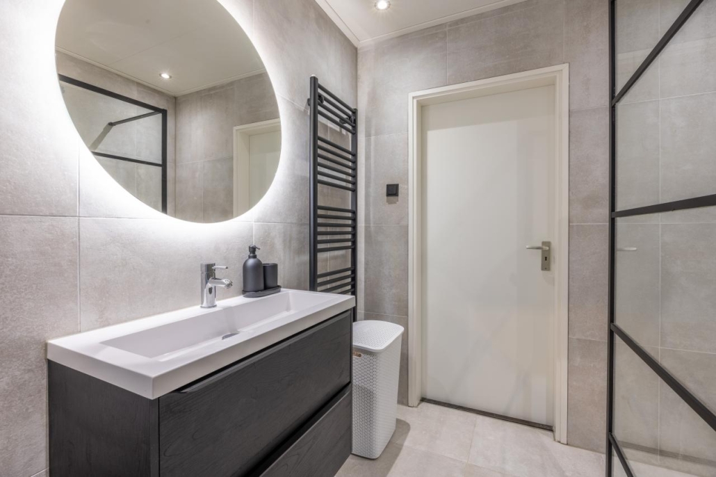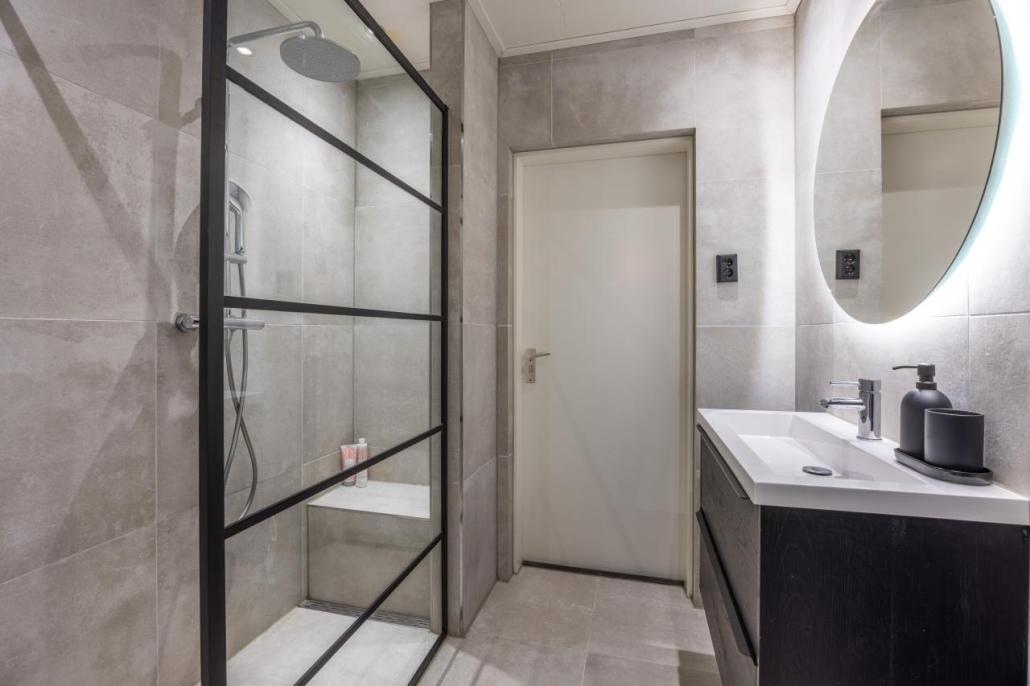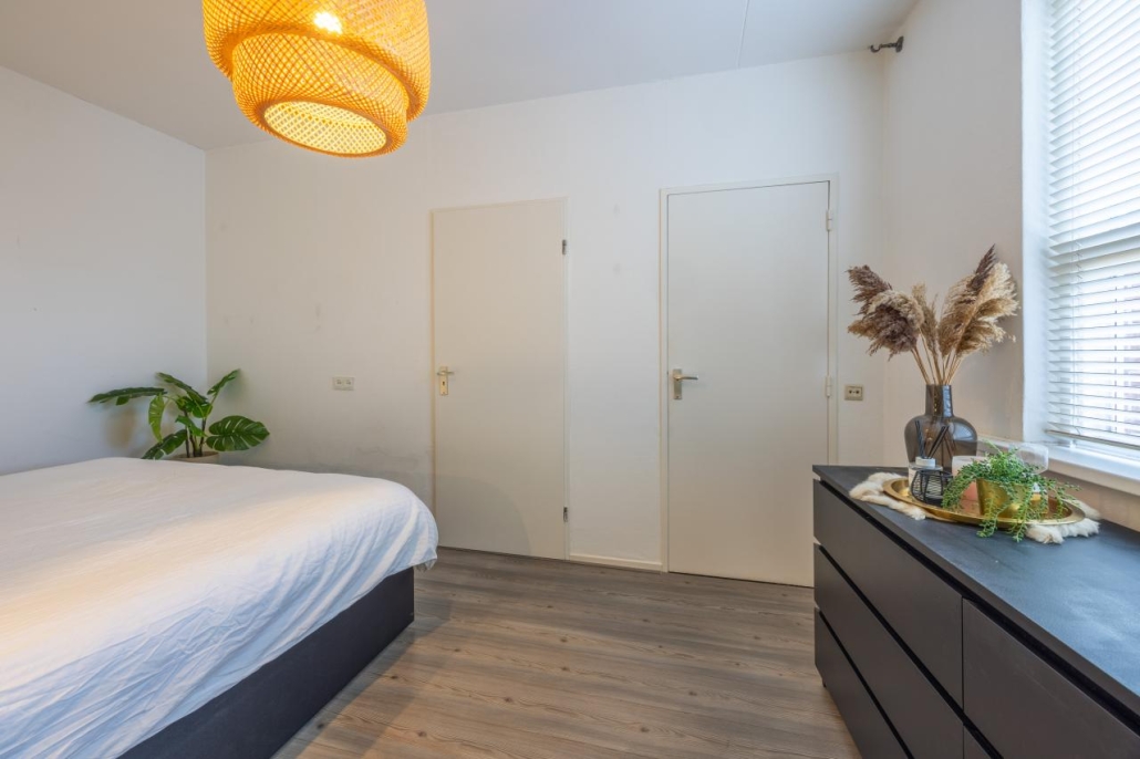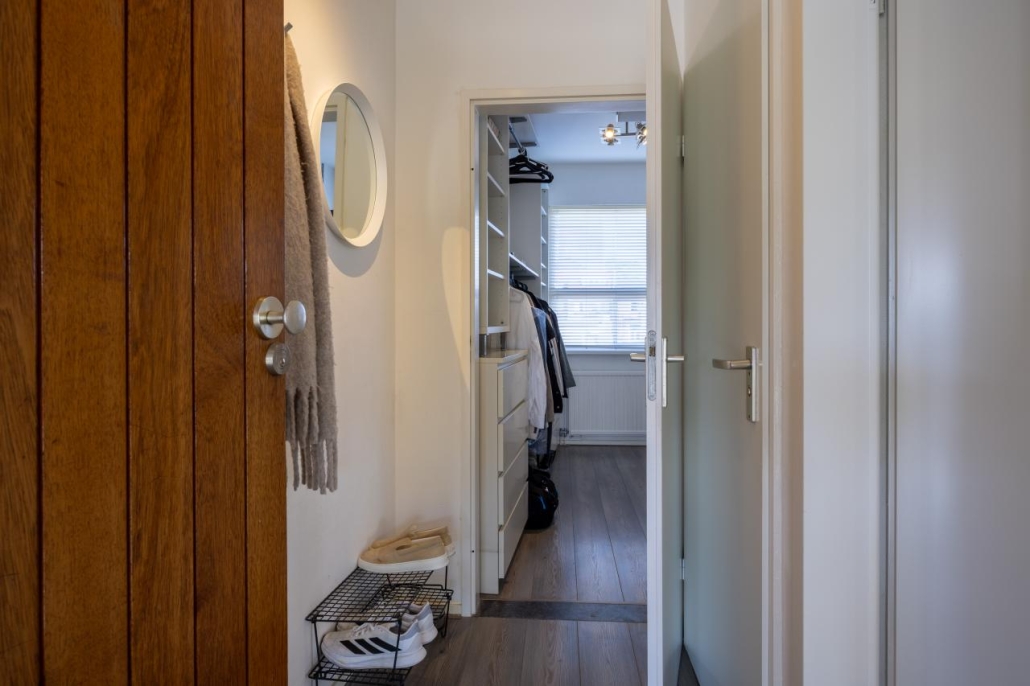 Aan de rustige achterzijde van het appartement bevinden zich twee slaapkamers. De hoofdslaapkamer is een royale en lichte ruimte. De tweede slaapkamer is momenteel ingericht als garderobe, maar biedt voldoende ruimte en licht om in te richten als volwaardige slaapkamer. Tussen beide slaapkamers in ligt de moderne badkamer, die in 2023 volledig is vernieuwd. Deze is direct toegankelijk vanuit beide kamers en voorzien van een inloopdouche en wastafelmeubel.