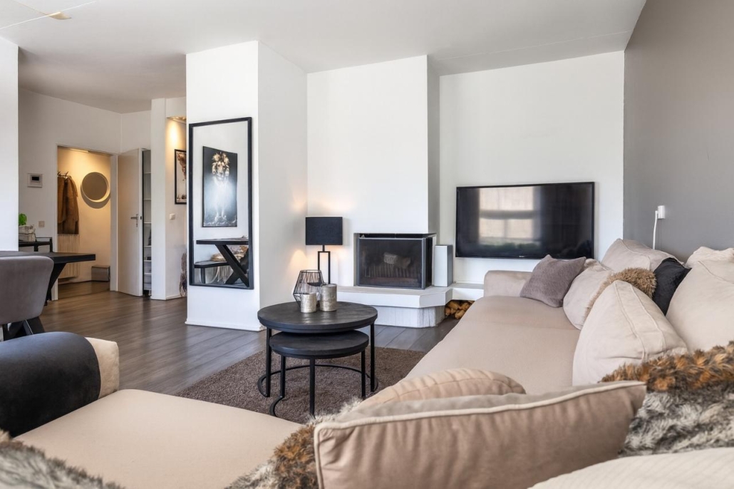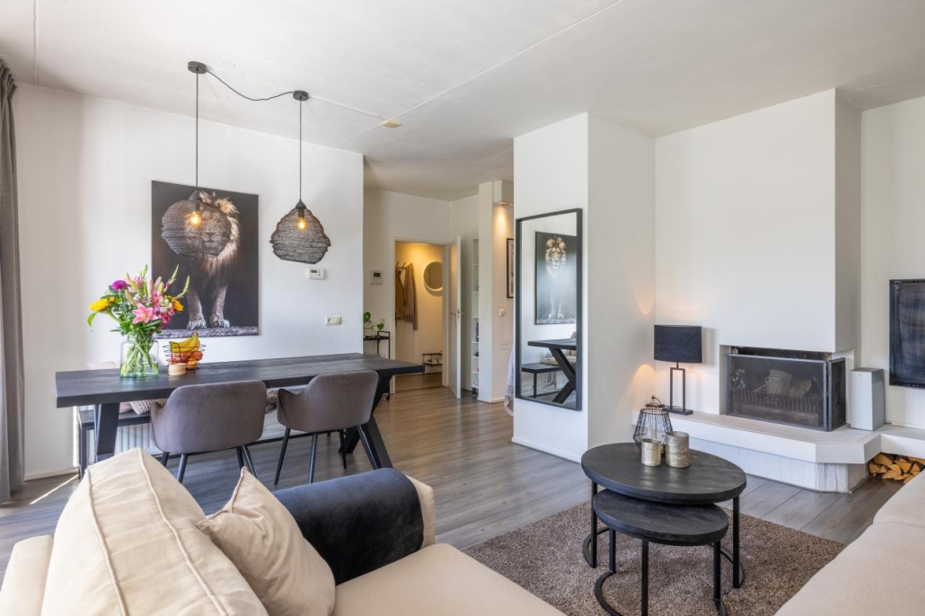 Via het trappenhuis bereik je de tweede verdieping, waar de entree van het appartement zich bevindt. Je komt binnen in de hal, die doorloopt naar de woonkamer aan de voorzijde van de woning. Deze royale en lichte leefruimte is voorzien van een sfeervolle open haard en een schuifpui naar de loggia.