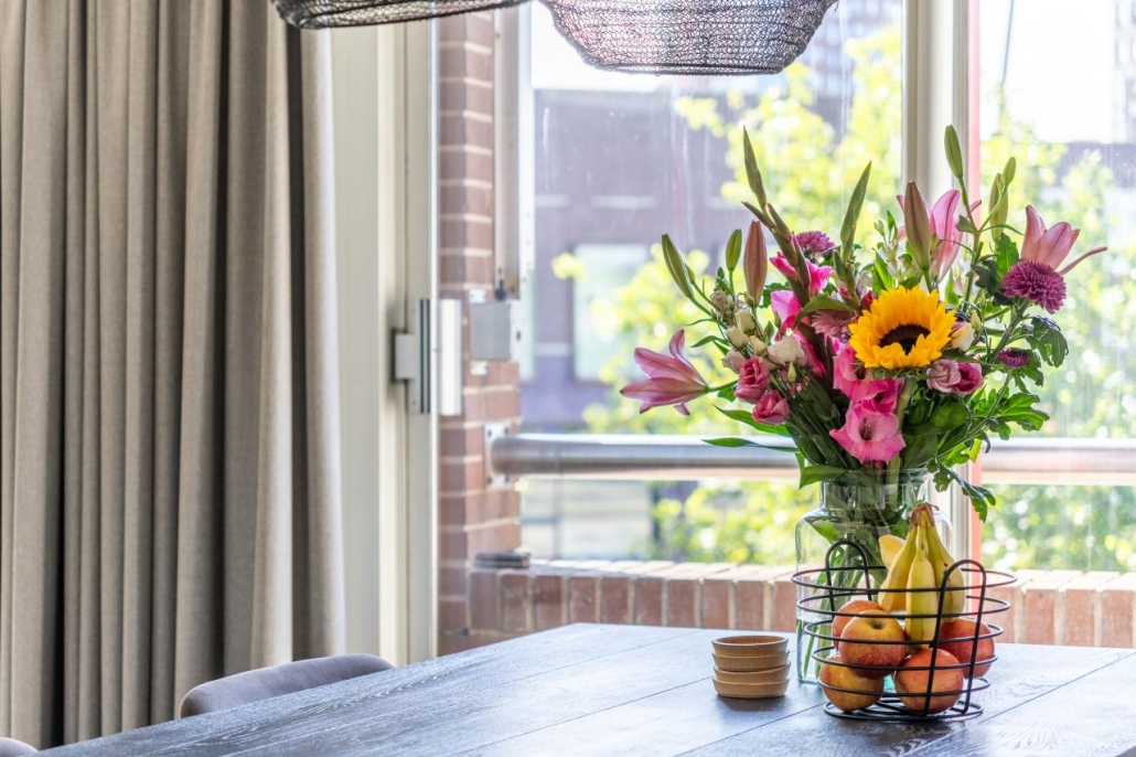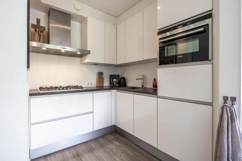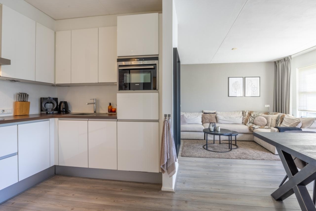 De open keuken sluit naadloos aan op de woonkamer en is uitgerust met luxe Siemens inbouwapparatuur, waaronder een vaatwasser, een 5-pits gaskookplaat en een combi-oven.