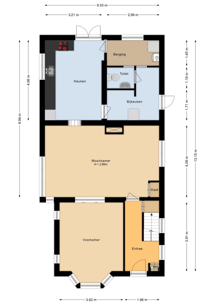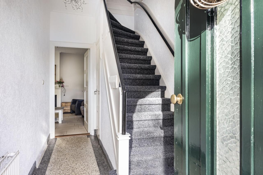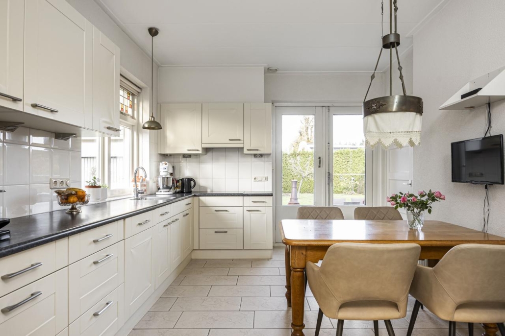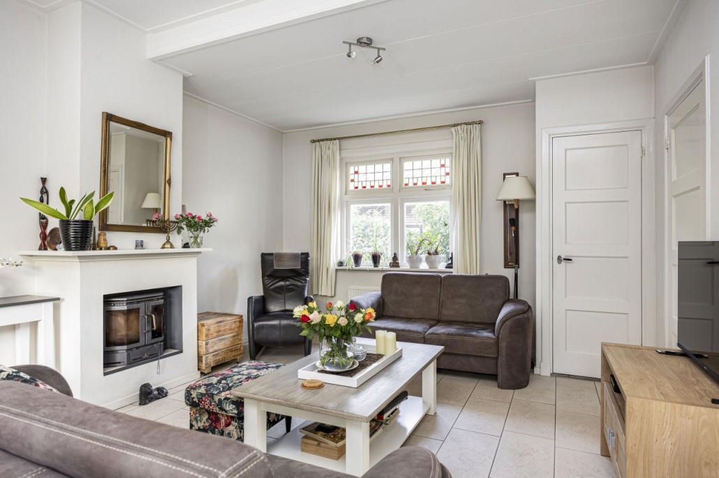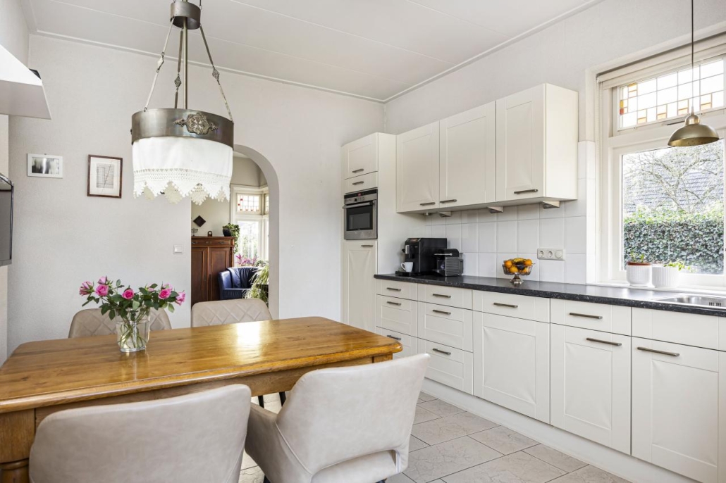 De hal met granitovloer geeft direct toegang tot de kelder. Vanuit hier loop je door naar de sfeervolle achterkamer met houtkachel en praktische inbouwkast. Via de originele en suite deuren kom je in de lichte voorkamer met erker, een heerlijke plek om te ontspannen. De royale woonkeuken, gesitueerd in de uitbouw, met inrichting in hoekopstelling is uitgerust met diverse inbouwapparatuur, waaronder een inductiekookplaat, combi-oven, afzuigkap, koelkast en vaatwasser. De openslaande tuindeuren brengen je rechtstreeks naar het terras en laten de keuken naadloos overlopen in de tuin. Daarnaast vind je op de begane grond een bijkeuken met toiletruimte en directe toegang naar buiten. Vanuit de keuken bereik je tevens de technische ruimte met opstelplaats voor de wasmachine.