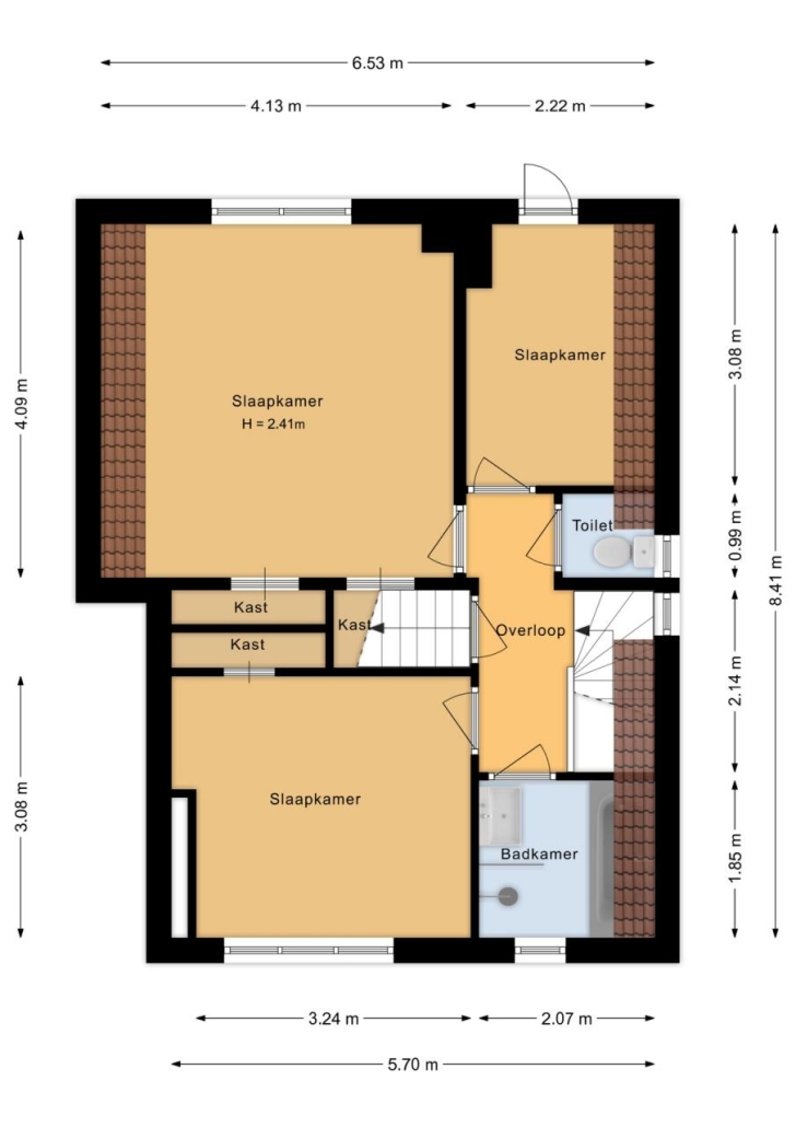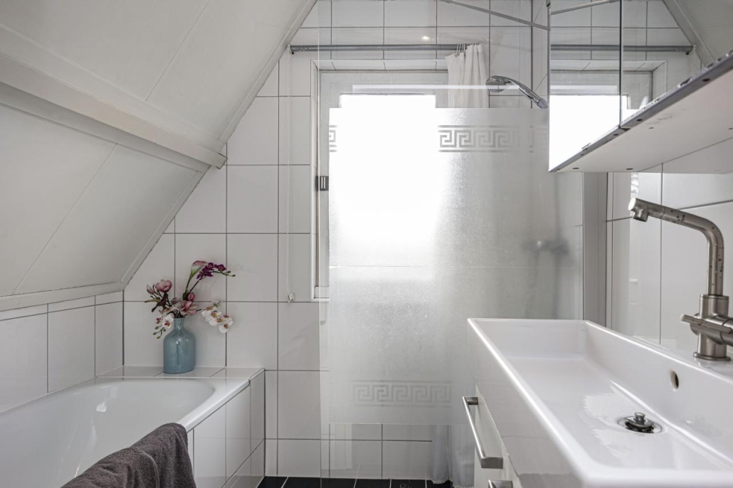 De overloop biedt toegang tot drie slaapkamers, waarvan twee zijn voorzien van praktische inbouwkasten. De badkamer is compleet uitgerust met een inloopdouche, ligbad en wastafelmeubel. Een extra separaat toilet bevindt zich eveneens op deze verdieping.