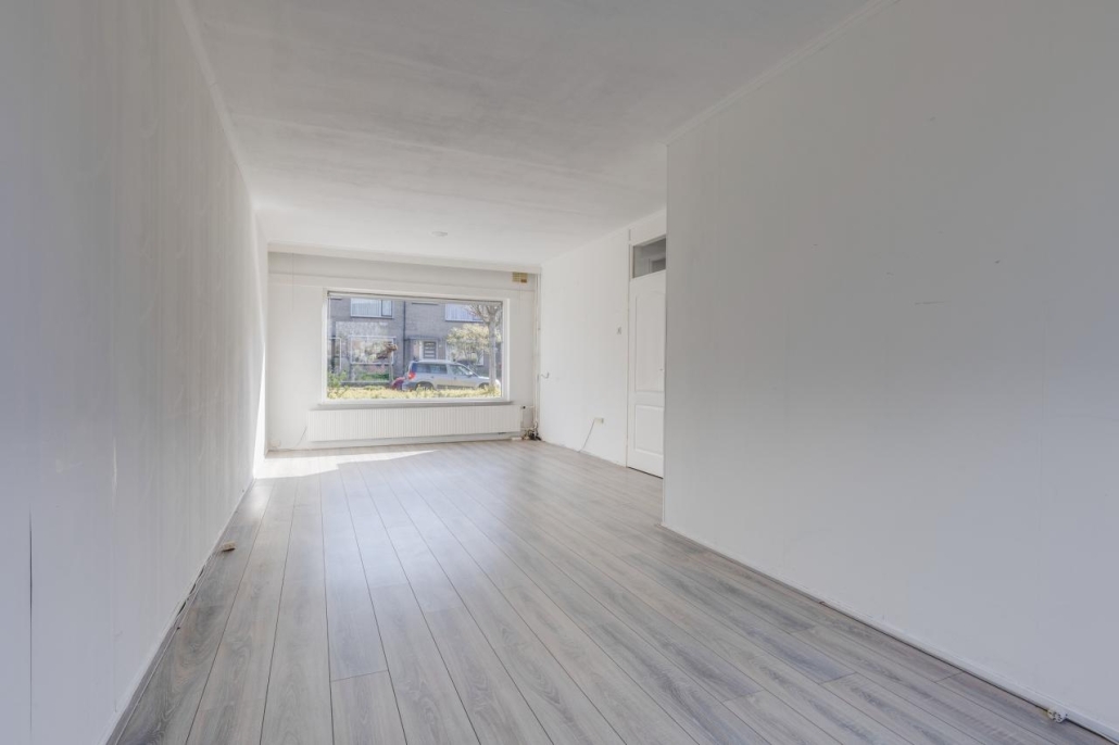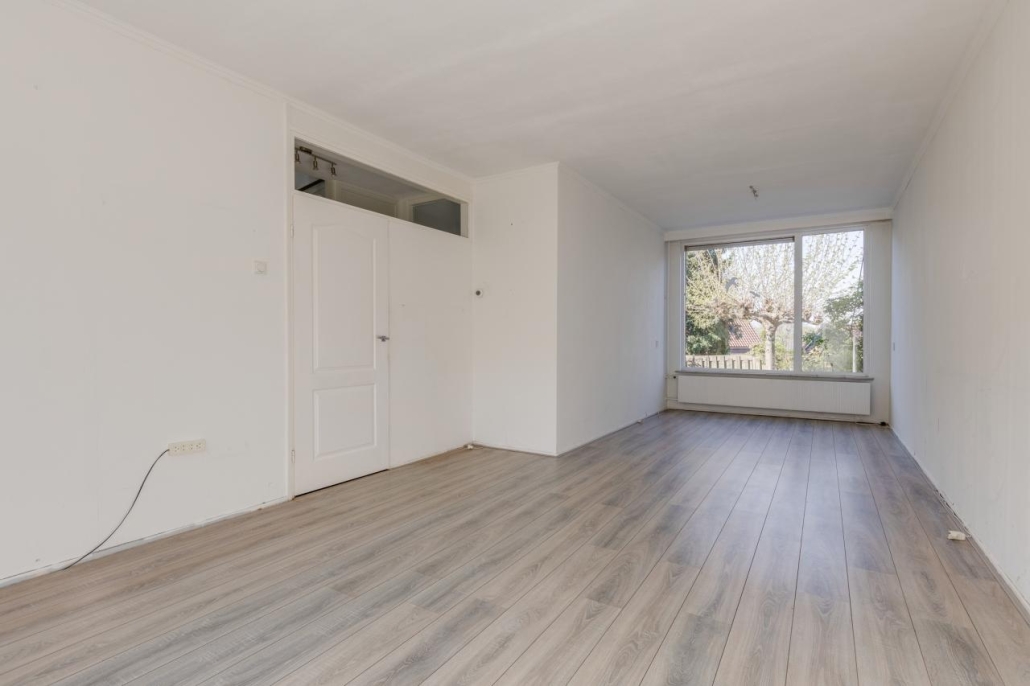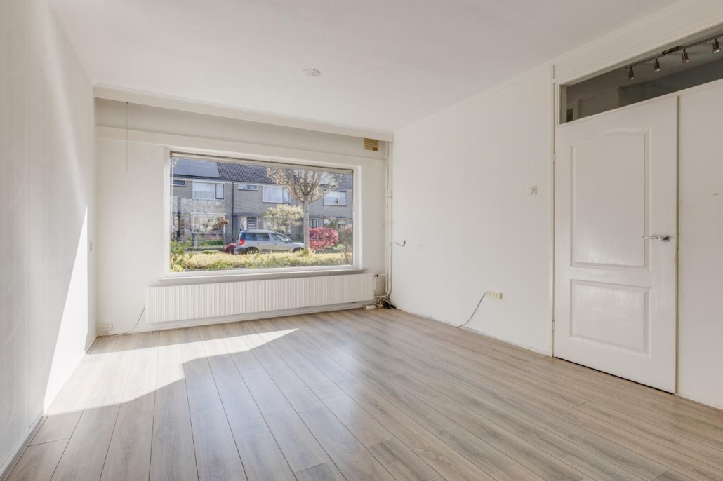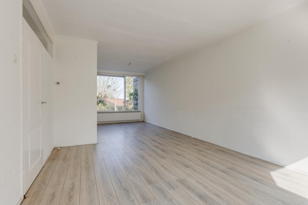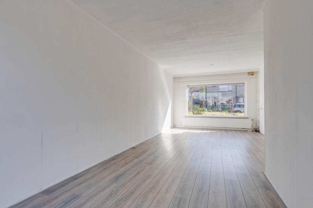 De lichte doorzonwoonkamer is voorzien van grote raampartijen, wat zorgt voor een prettige hoeveelheid daglicht.
