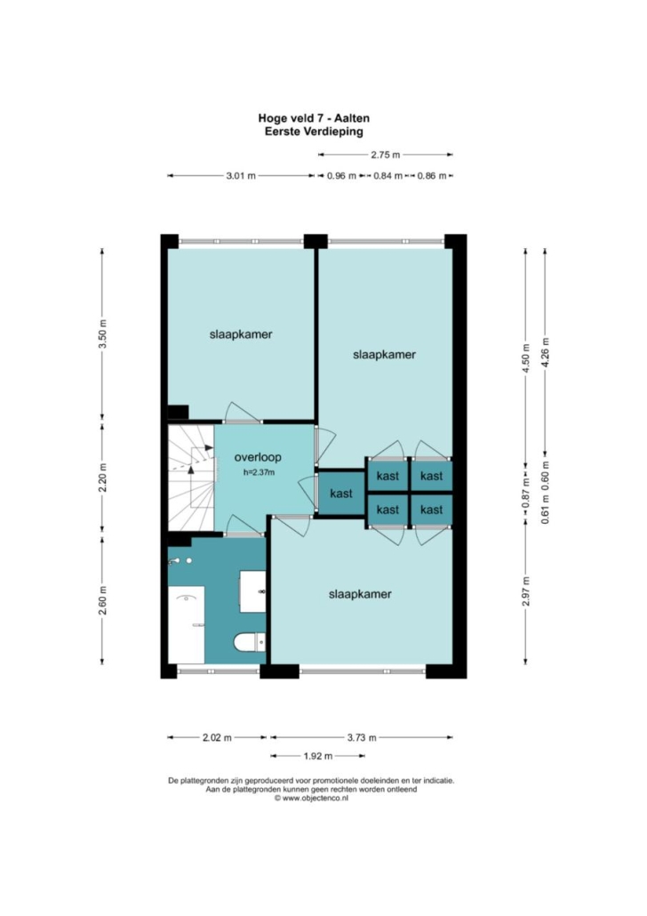 De overloop beschikt over een inbouwkast en geeft toegang tot drie ruime slaapkamers, waarvan twee zijn voorzien van praktische inbouwkasten. Ook op de overloop is een inbouwkast.