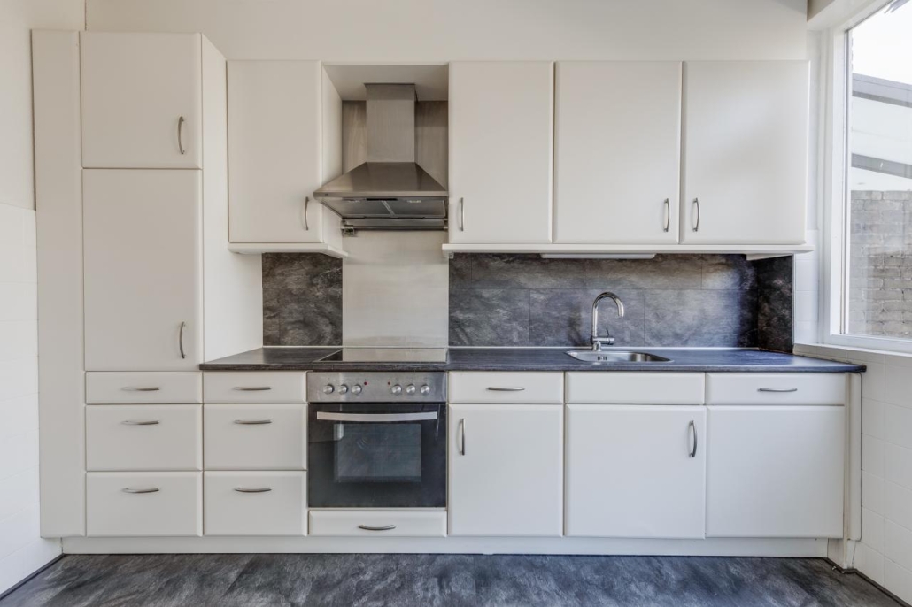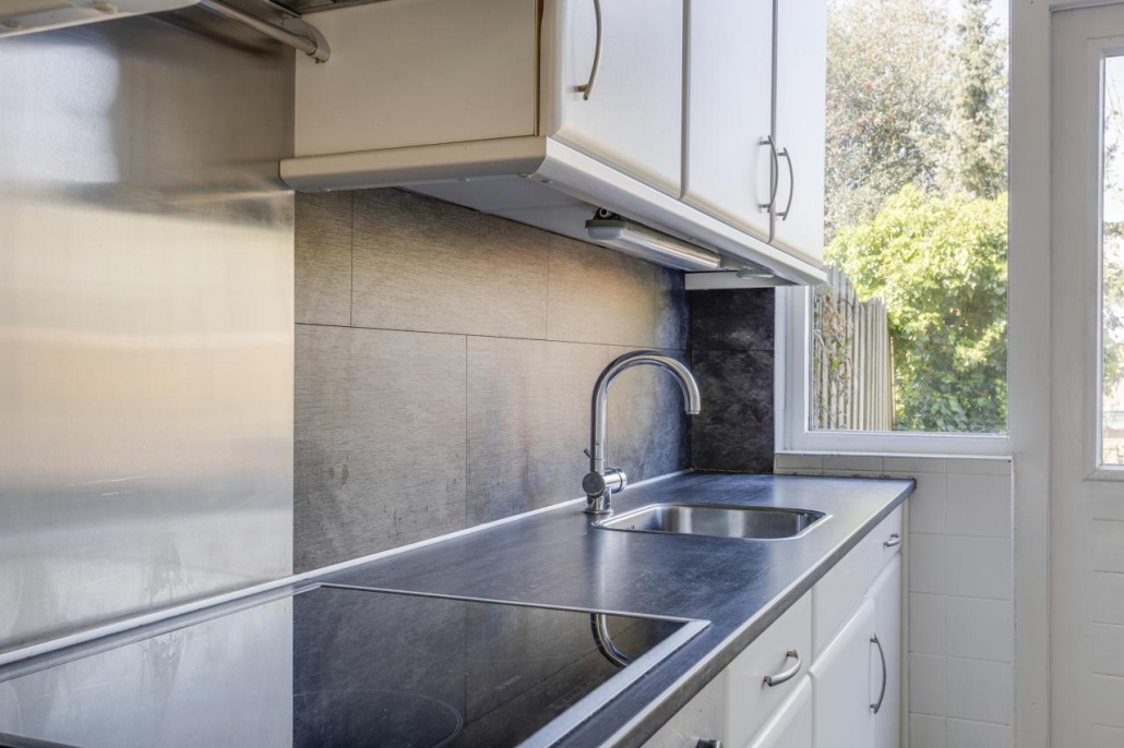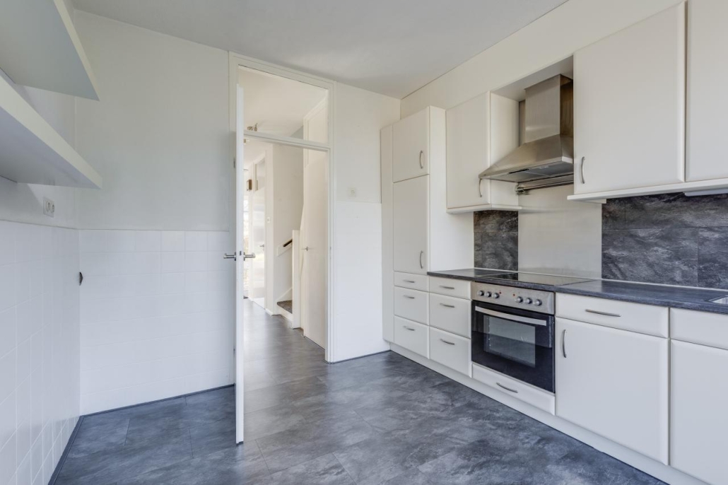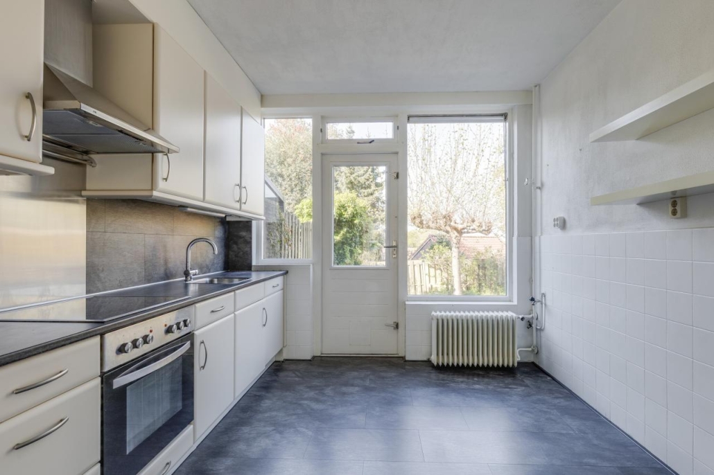 De keuken is uitgevoerd in een eenvoudige rechte opstelling. Vanuit hier bereik je de achtertuin.