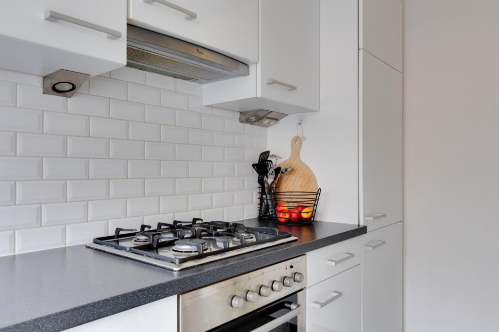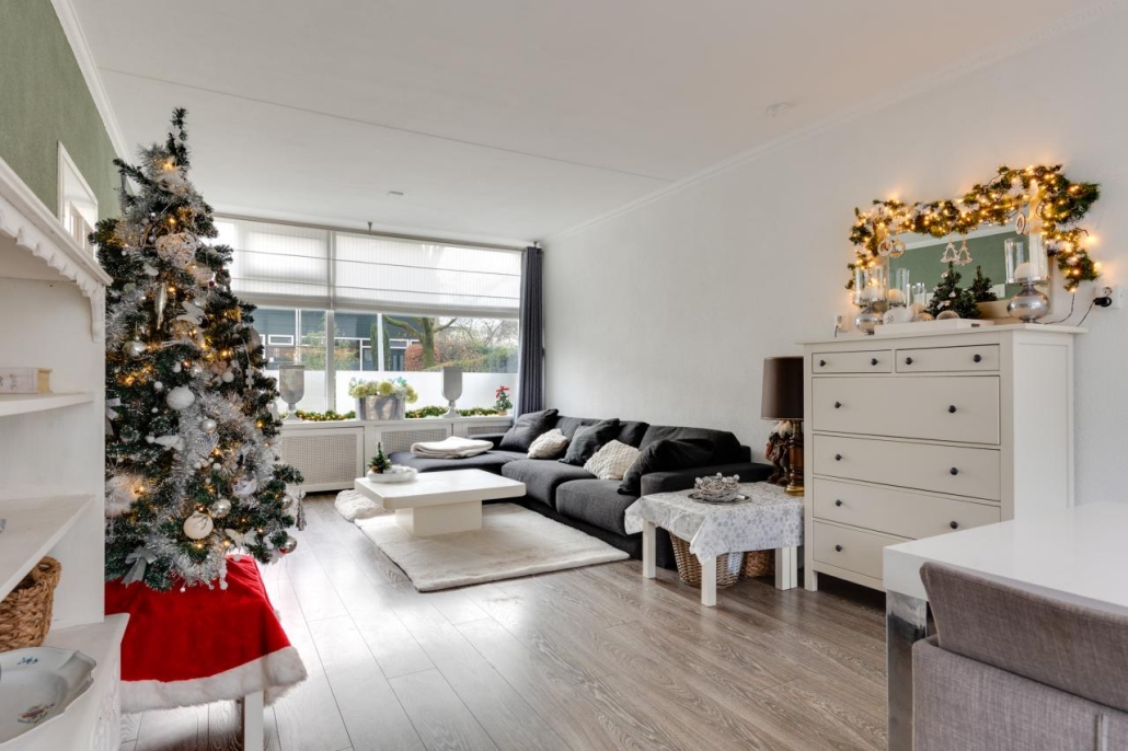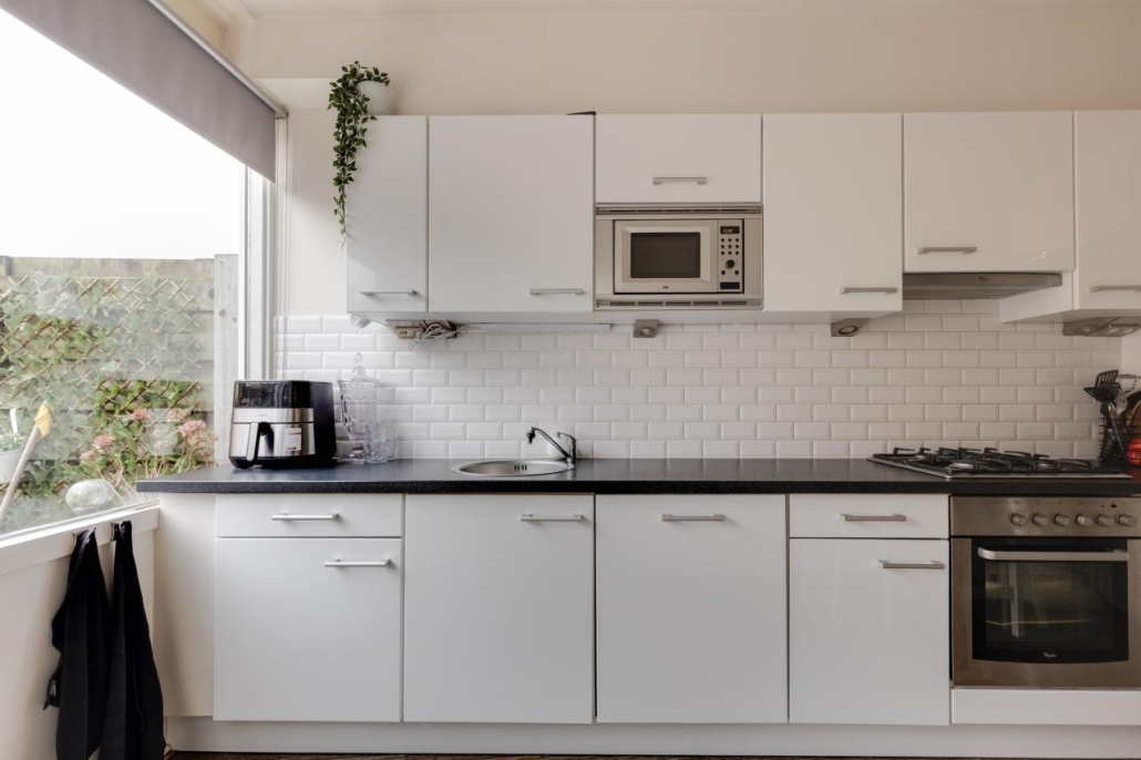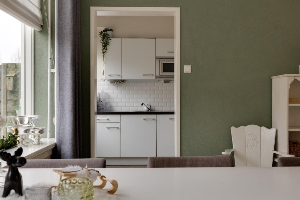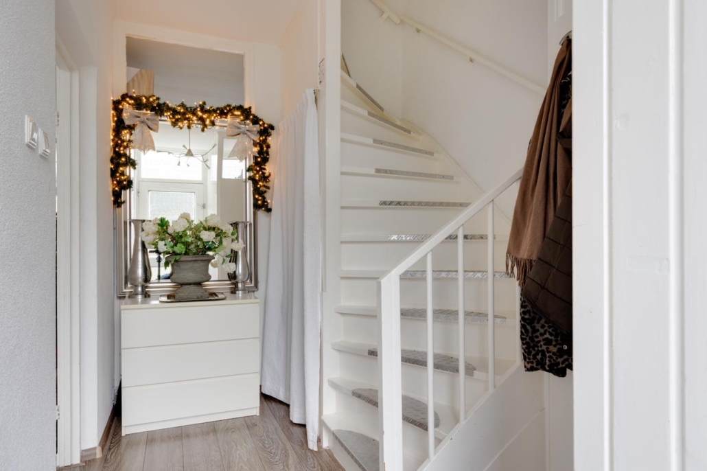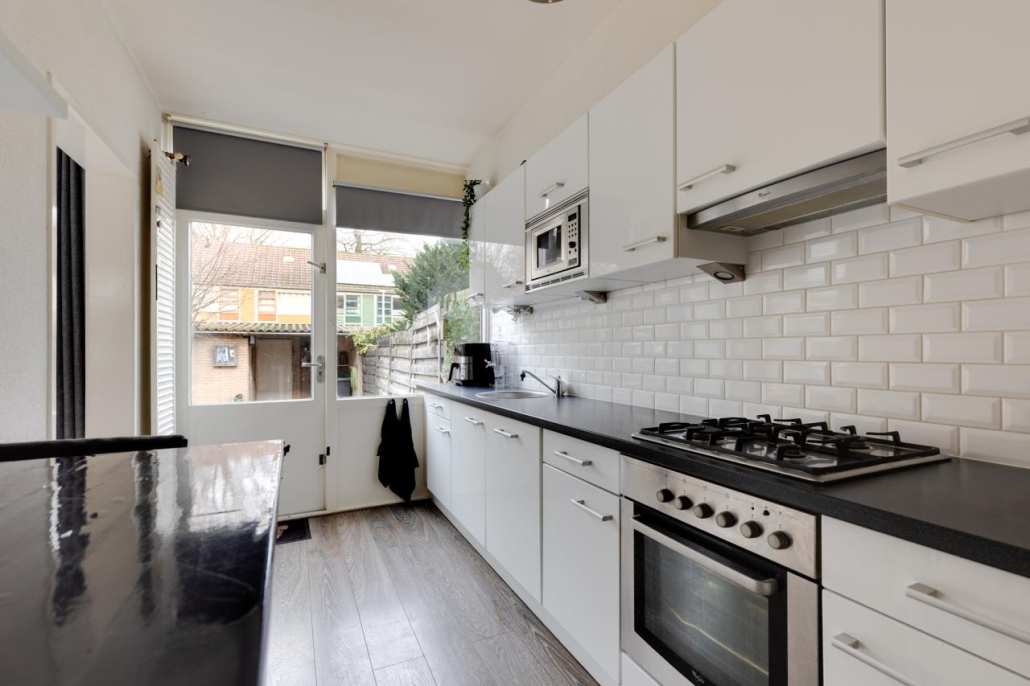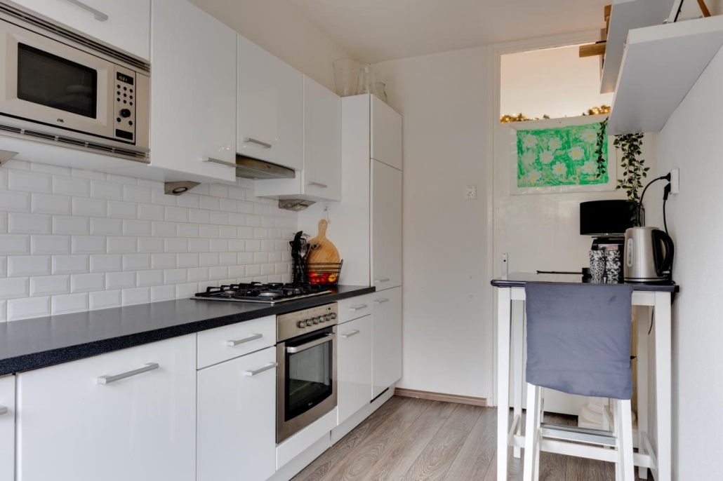Begane grond: Via de entree kom je binnen in de hal. Hier vind je de meterkast, een trapkast, de toiletruimte met fonteintje en de trap naar de verdieping. Vanuit de hal heb je toegang tot de woonkamer en keuken. De ruime doorzonwoonkamer heeft grote raampartijen. De keuken is uitgerust met een gasfornuis, oven, magnetron, vaatwasser, afzuigkap, koelkast en vriezer.