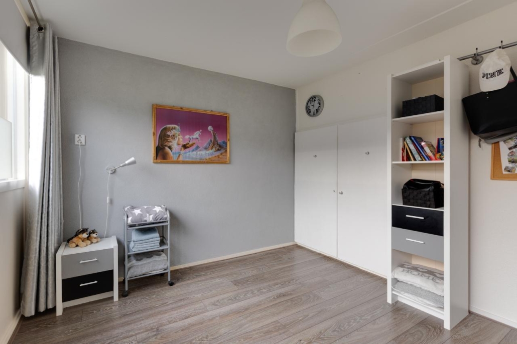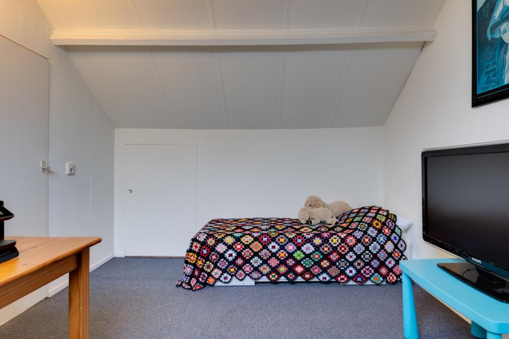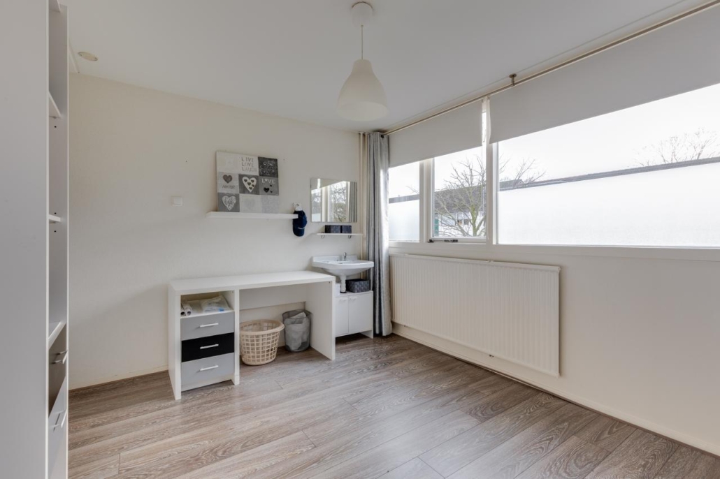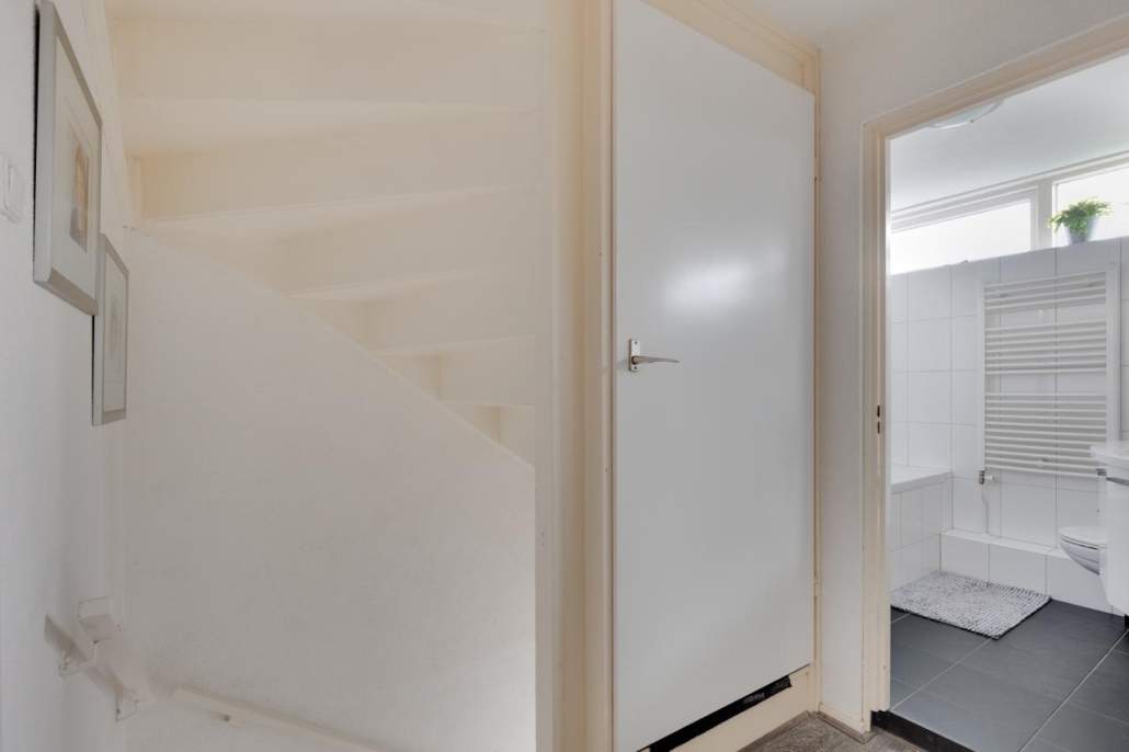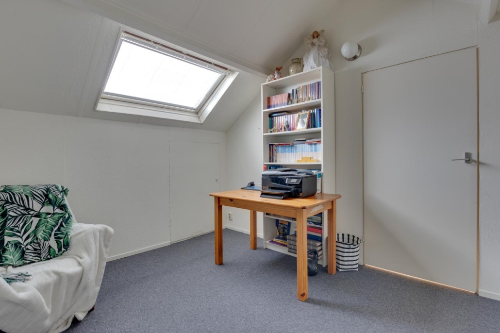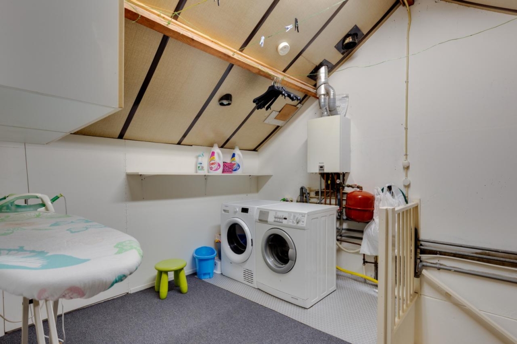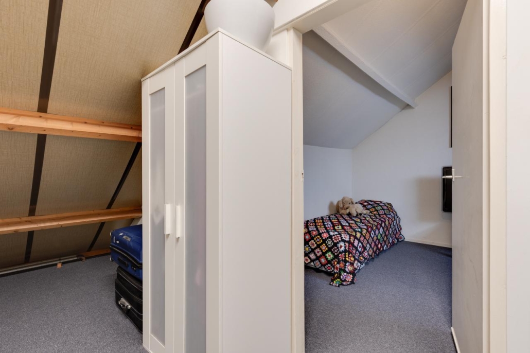 Tweede verdieping: Via een vaste trap bereik je de zolderverdieping, die bestaat uit een overloop met wasaansluitingen en cv-opstelling, een slaapkamer en veel bergruimte achter de knieschotten, zowel op de overloop als in de slaapkamer.
