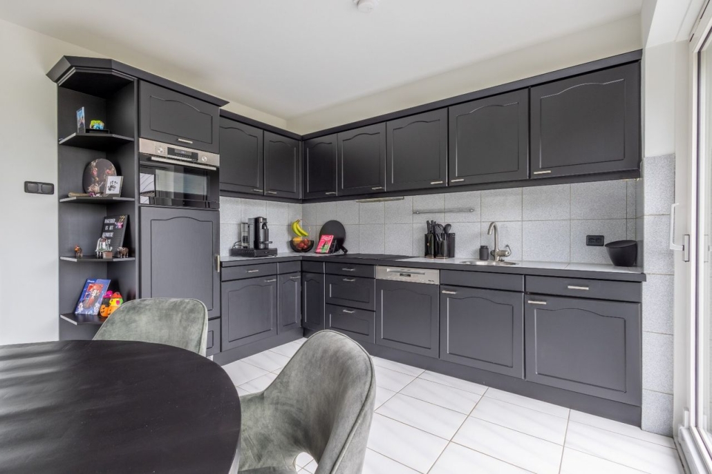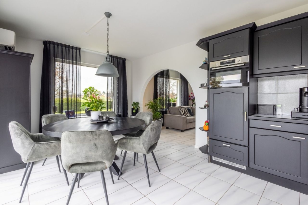 De ruime open woonkeuken is voorzien van een inbouwkeuken met daarin inductiekookplaat (2022), afzuigkap, koelkast, elektrische oven, close-in boiler, combi-magnetron (2019) en vaatwasser (2017).