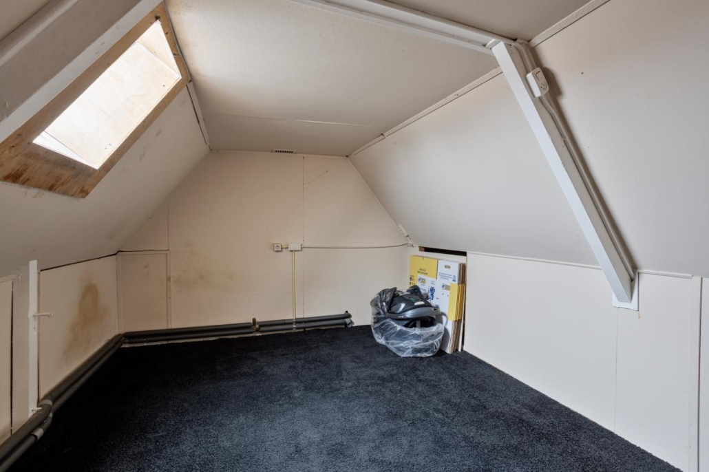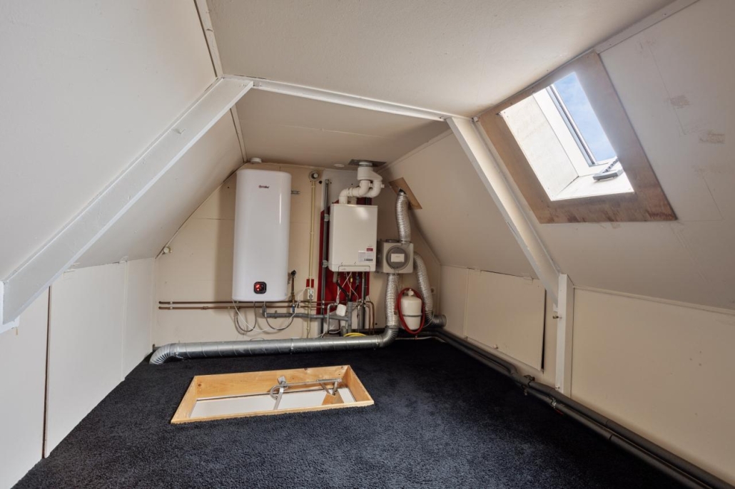 Open zolderverdieping met de opstelplaats voor de C.V.-ketel en de boiler, plus veel bergruimte. Hier bestaat de mogelijkheid om een vierde slaapkamer te realiseren.