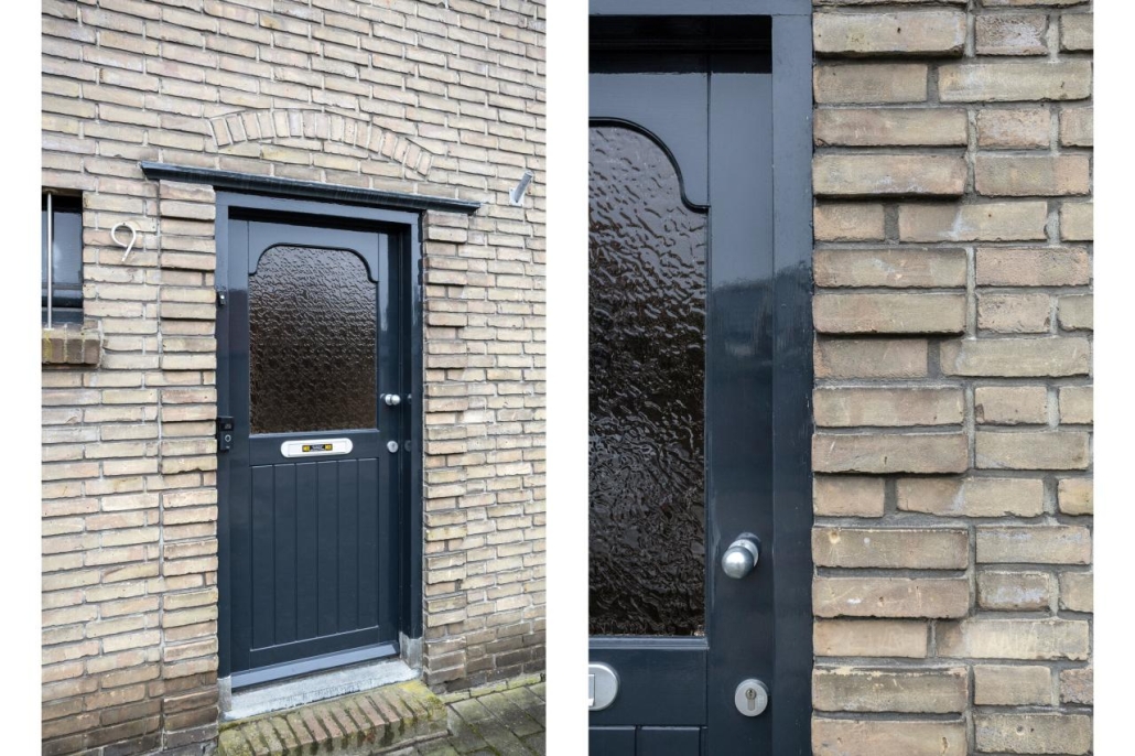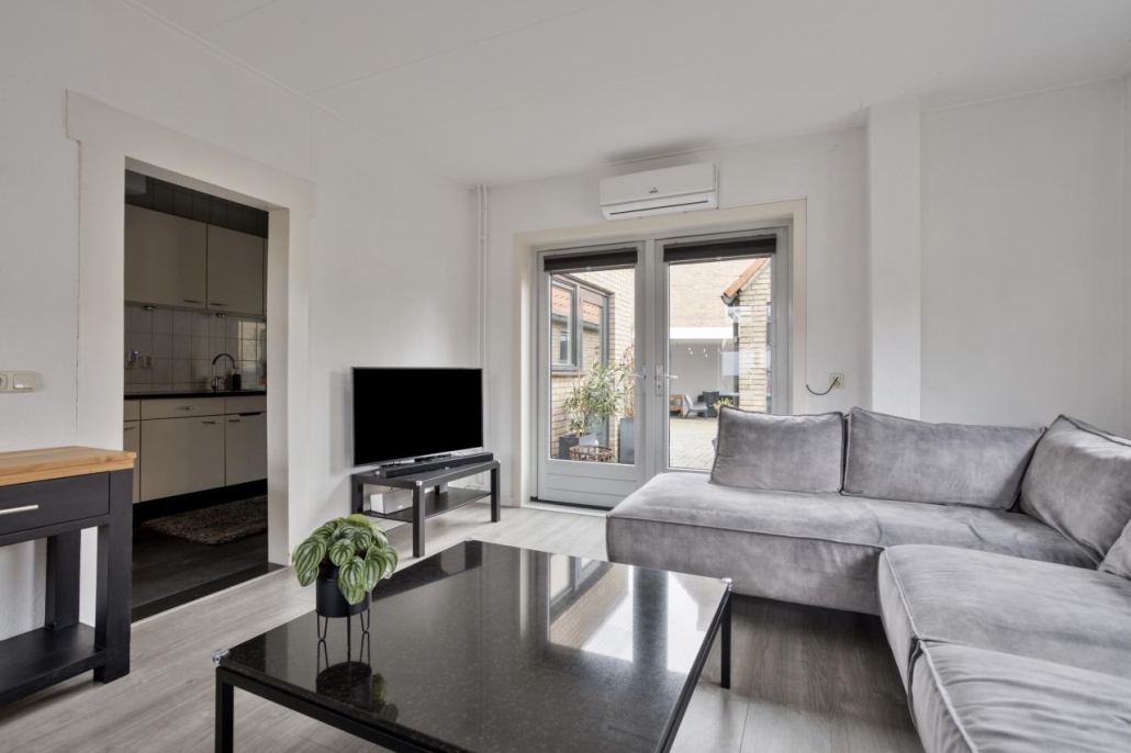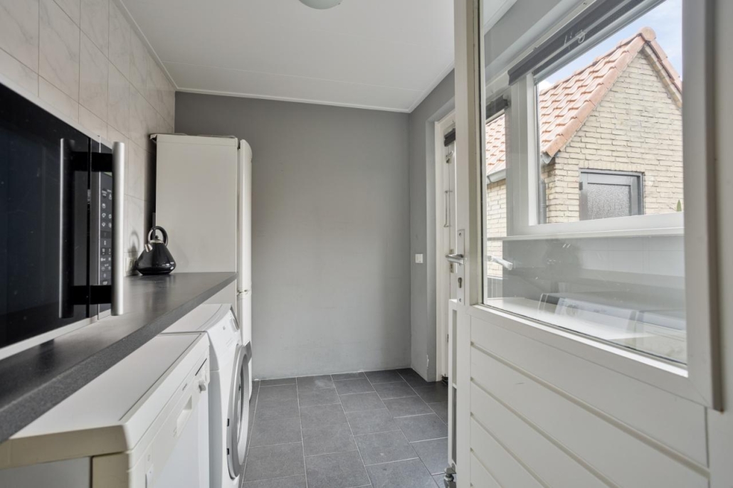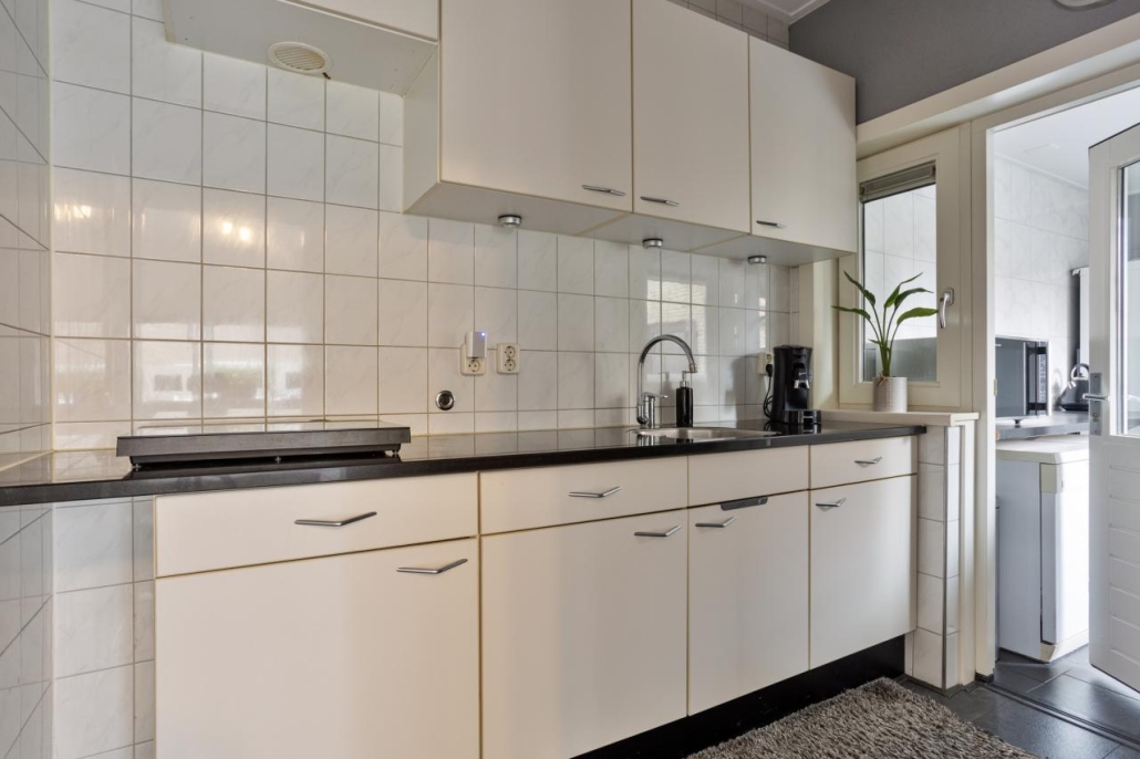 Entree/hal met trapopgang, meterkast en toiletruimte. De nette keuken, die desgewenst naar eigen smaak kan worden gemoderniseerd, biedt toegang tot de bijkeuken waar onder andere de aansluitingen zitten voor het wassen en drogen. De ruime en lichte woonkamer met een airco bevindt zich aan de zijkant van de woning en staat in directe verbinding met de diepe achtertuin.