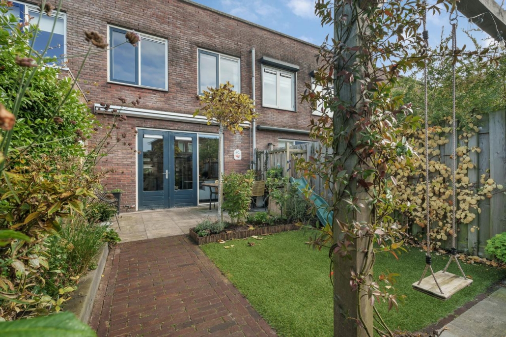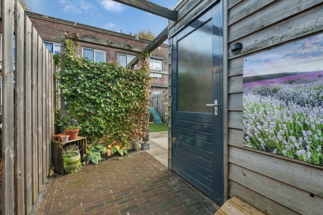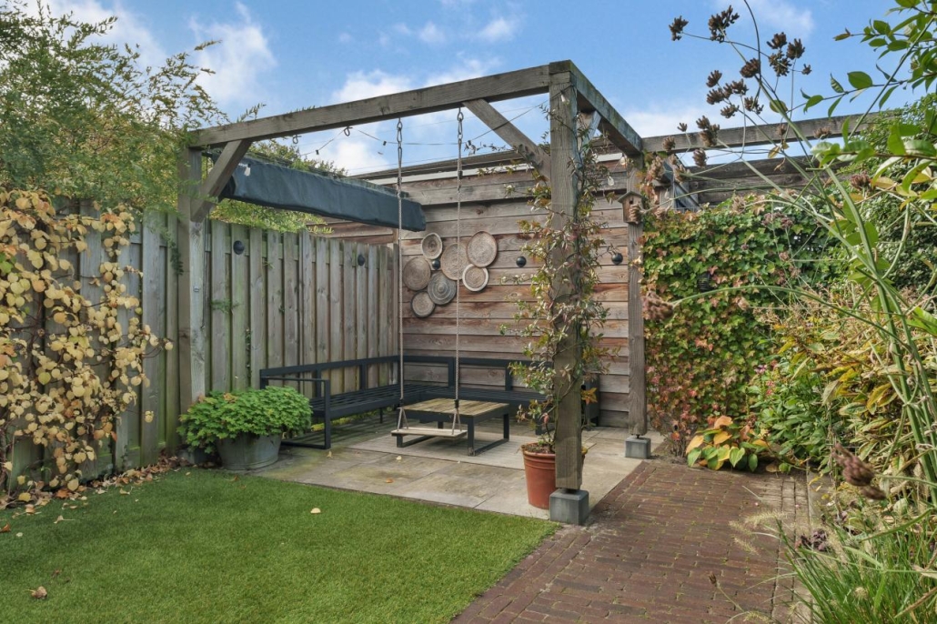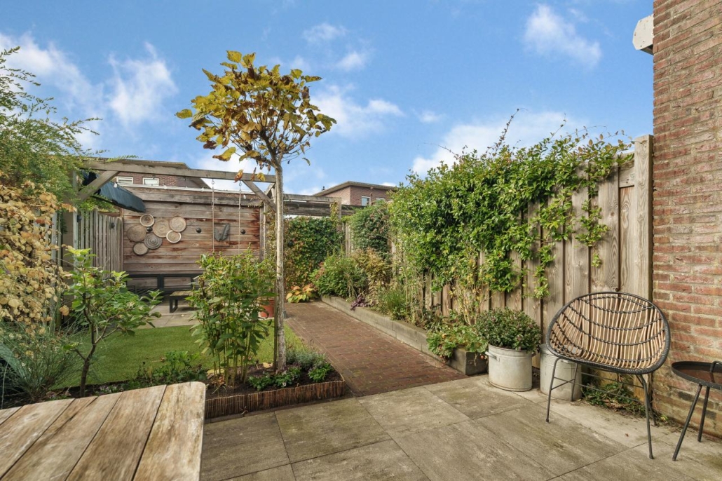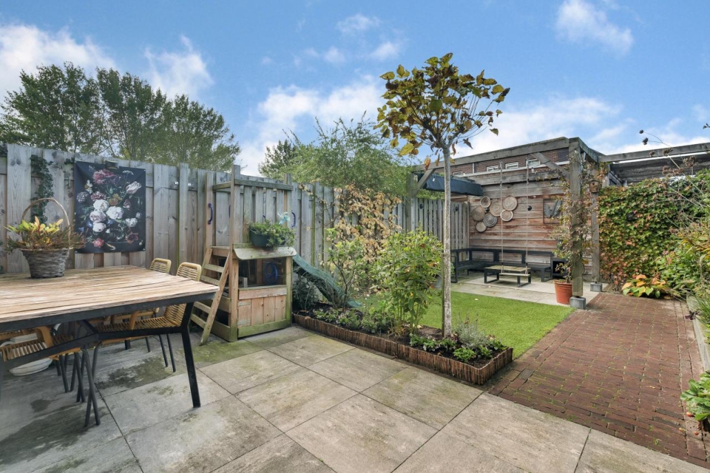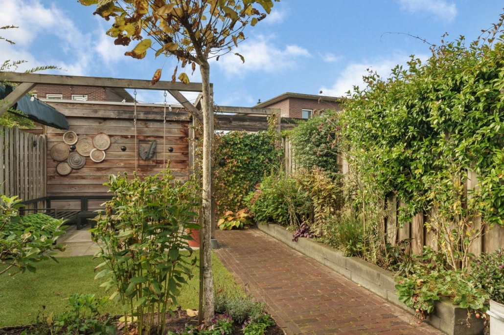 De achtertuin, gelegen op het westen, is ideaal om van de middag- en avondzon te genieten. De tuin is verzorgd aangelegd en biedt voldoende ruimte om meerdere zithoekjes te creëren. Achterin bevindt zich een berging, waarbij de deur is verplaatst om nóg beter gebruik te kunnen maken van de ruimte.