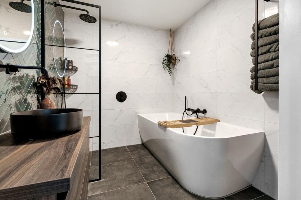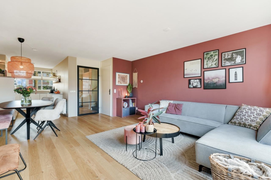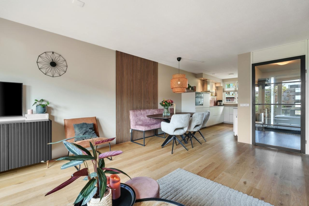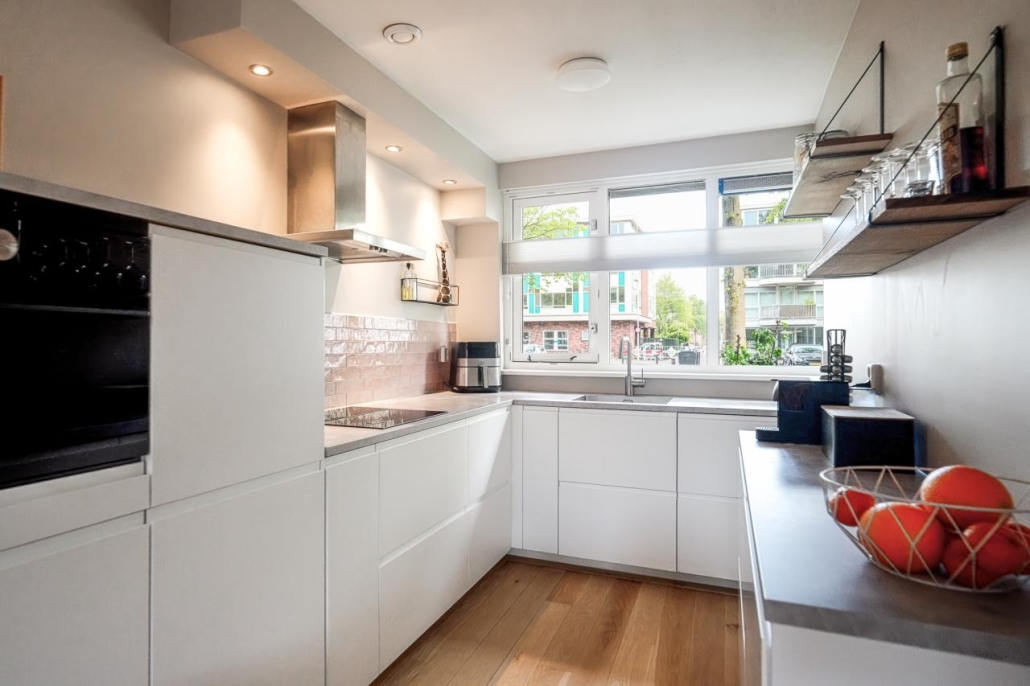 De keuken aan de voorzijde (vernieuwd in 2020) is uitgevoerd in een moderne stijl met witte fronten, een stijlvolle achterwand met decoratieve tegels en uiteraard voorzien van alle inbouwapparatuur. Leuk detail: vanuit de keuken heb je een doorkijk richting de Mastenbroekerbrug.