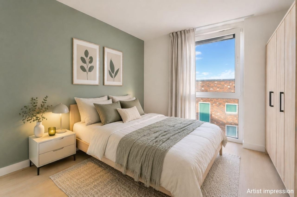 Het appartement beschikt over één ruime slaapkamer met voldoende ruimte voor een tweepersoonsbed en een kledingkast. De badkamer is uitgerust met een inloopdouche, wastafel en een aansluiting voor de wasmachine.