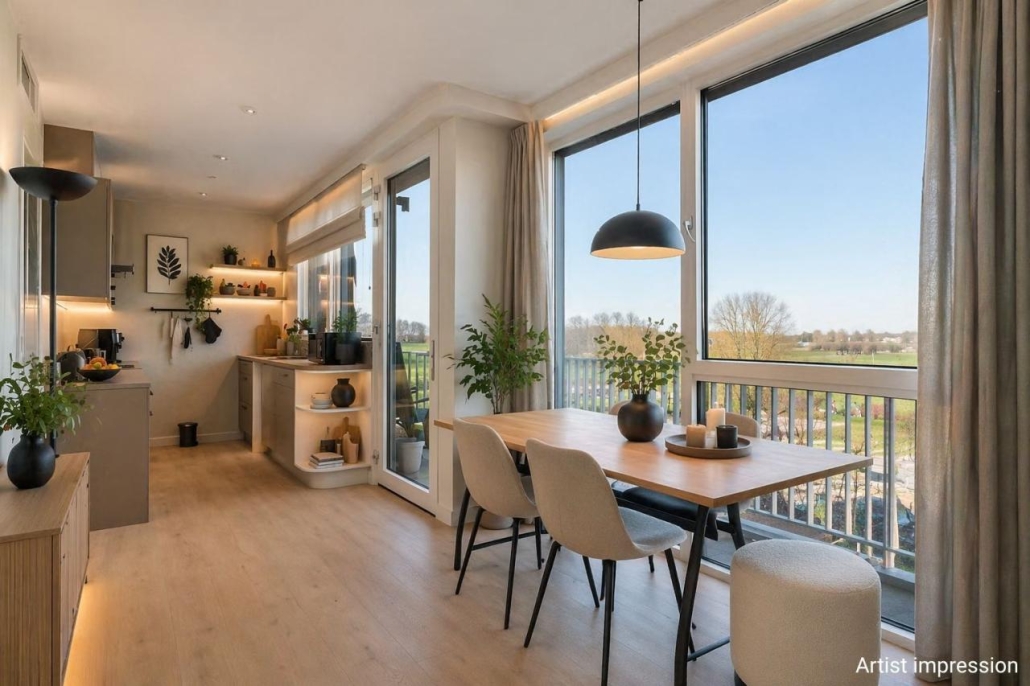 De woonkamer is een lichte en prettige leefruimte dankzij de grote raampartijen. Hier is voldoende ruimte voor een comfortabele zithoek en eethoek. Vanuit de woonkamer heb je toegang tot het balkon. Hier kun je heerlijk zitten en genieten van het vrije uitzicht over de weilanden en richting de Mastenbroekerbrug.