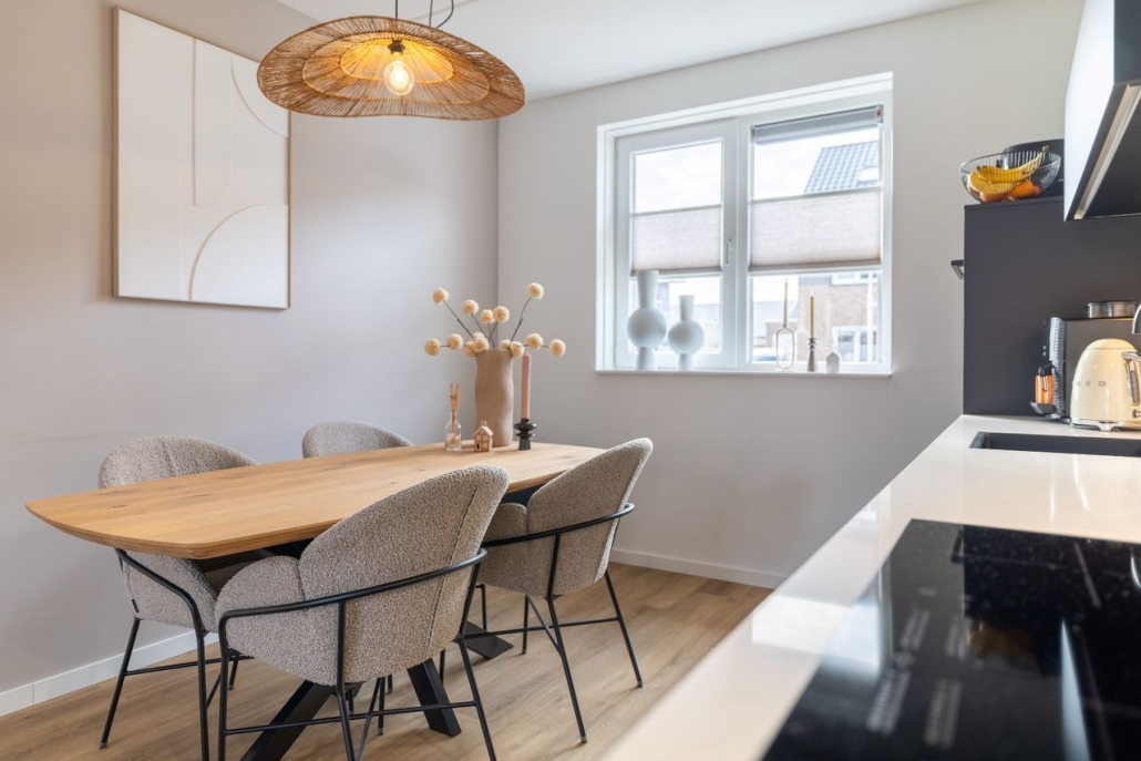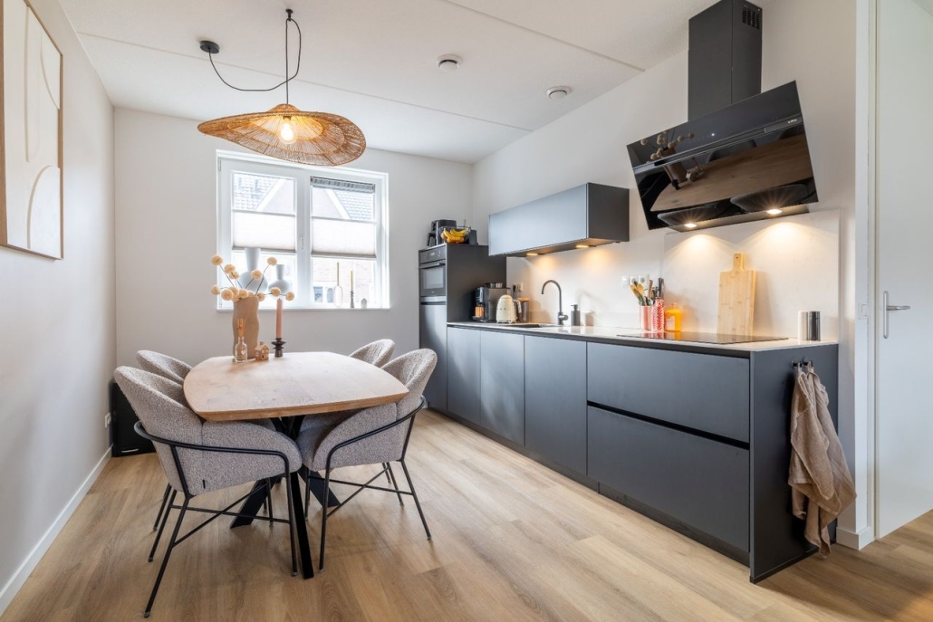 De open keuken is voorzien van een moderne inbouwkeuken (2023) met daarin een inductiekookplaat, afzuigkap, koelkast, vaatwasser en combi-oven.