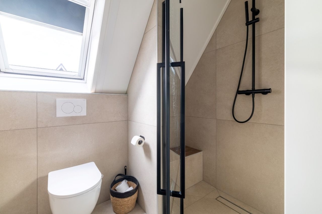 De moderne badkamer (2023)is voorzien van een inloopdouche, wastafelmeubel en hangtoilet.