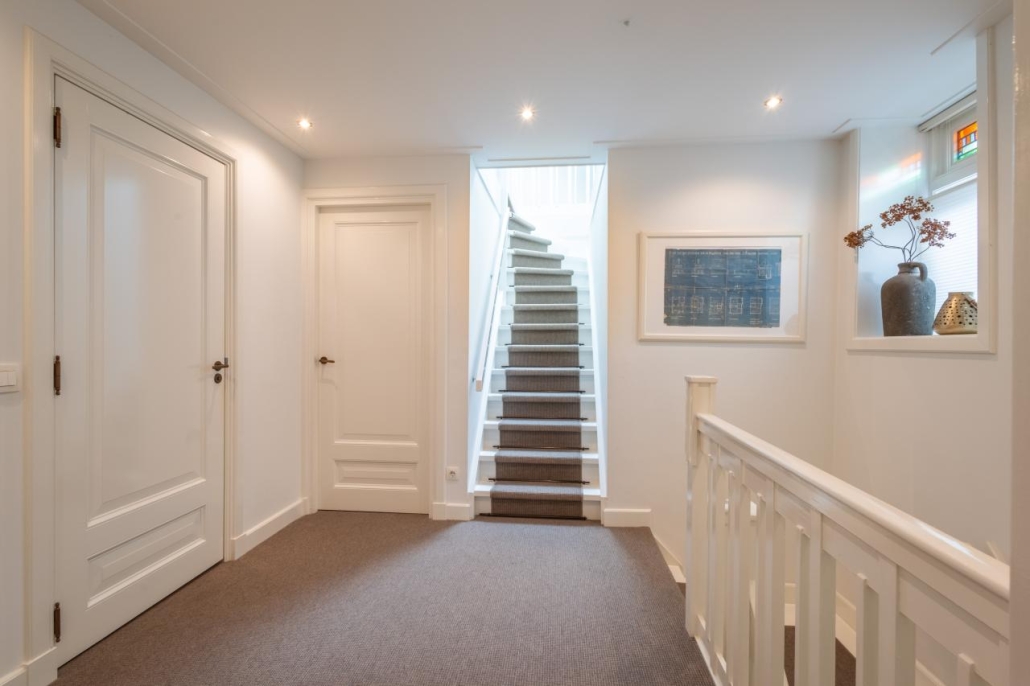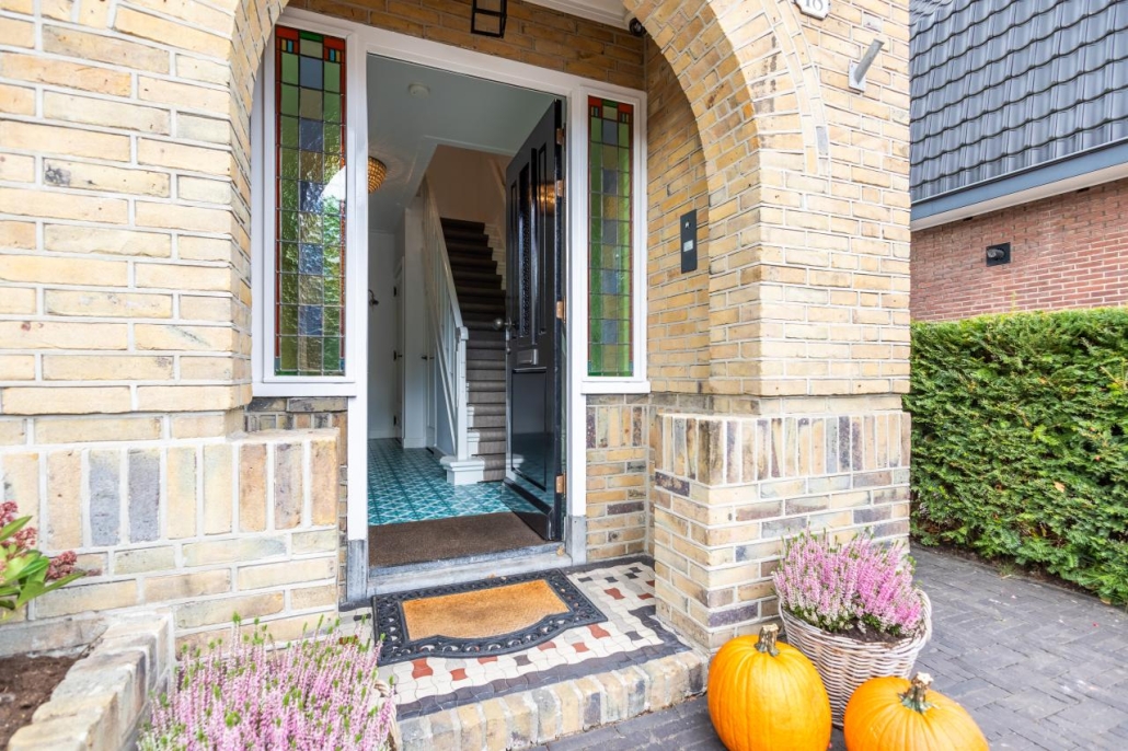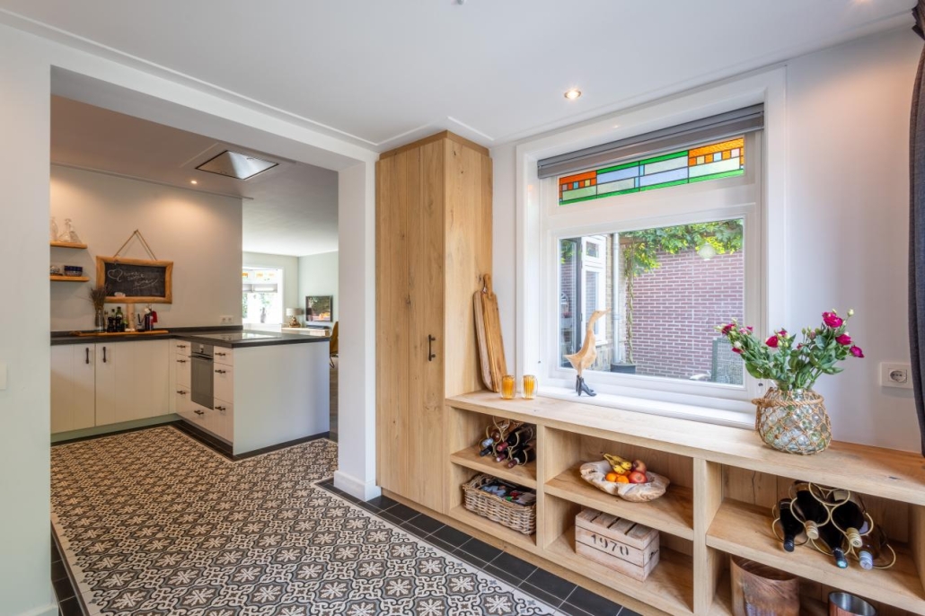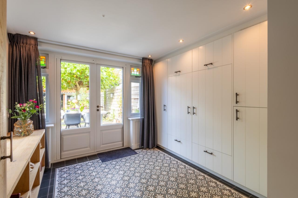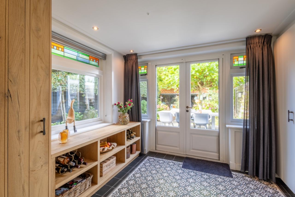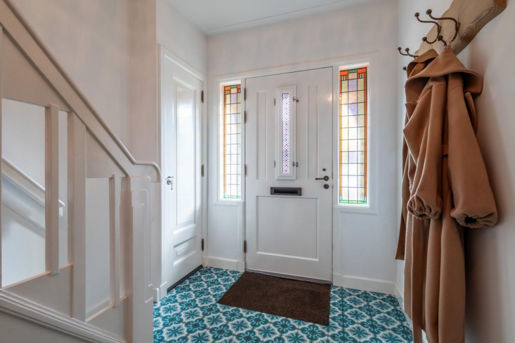 De entree met originele details geeft toegang tot een ruime hal met meterkast, modern gerenoveerd toilet en trapopgang naar de eerste verdieping. Vanuit de hal stap je door naar de woonkamer, waar direct de warme uitstraling van het huis voelbaar is.