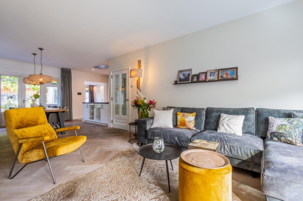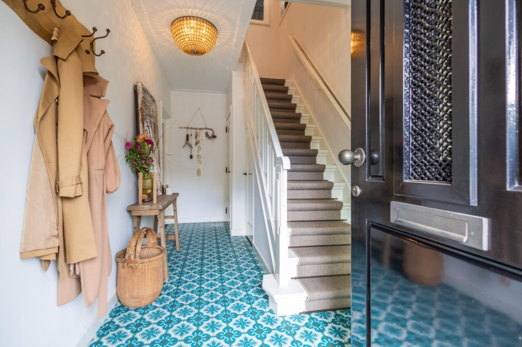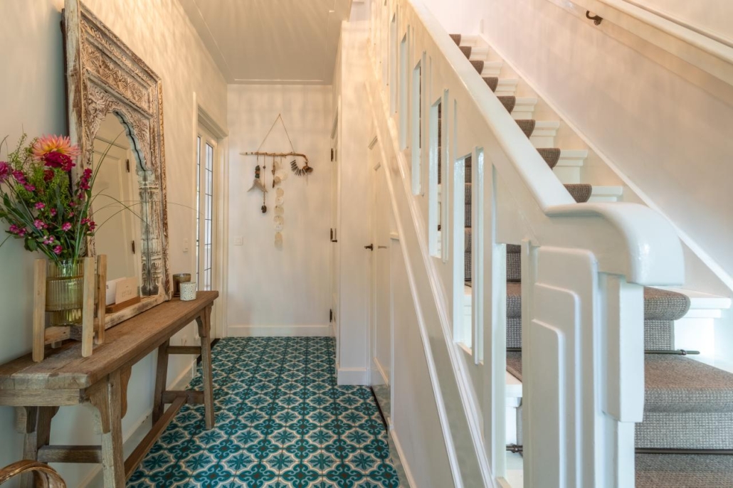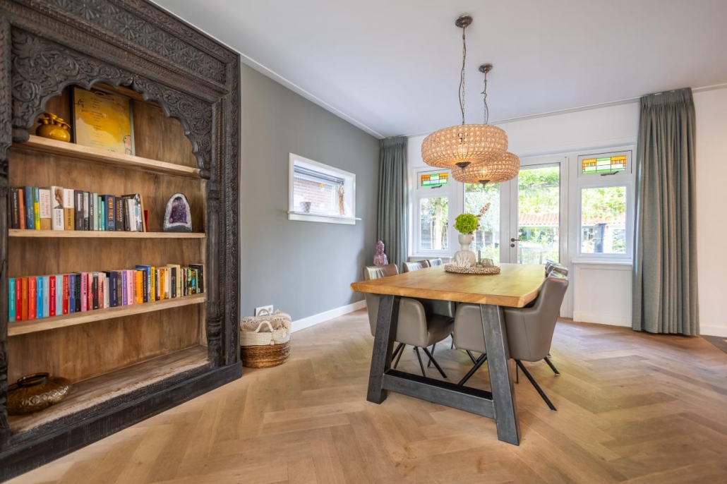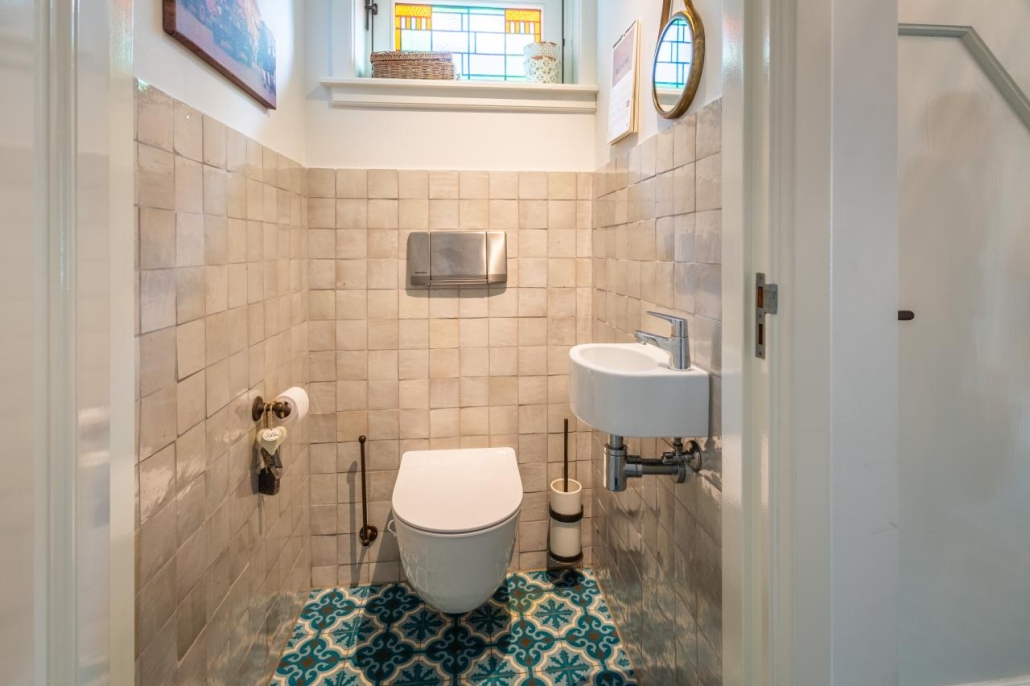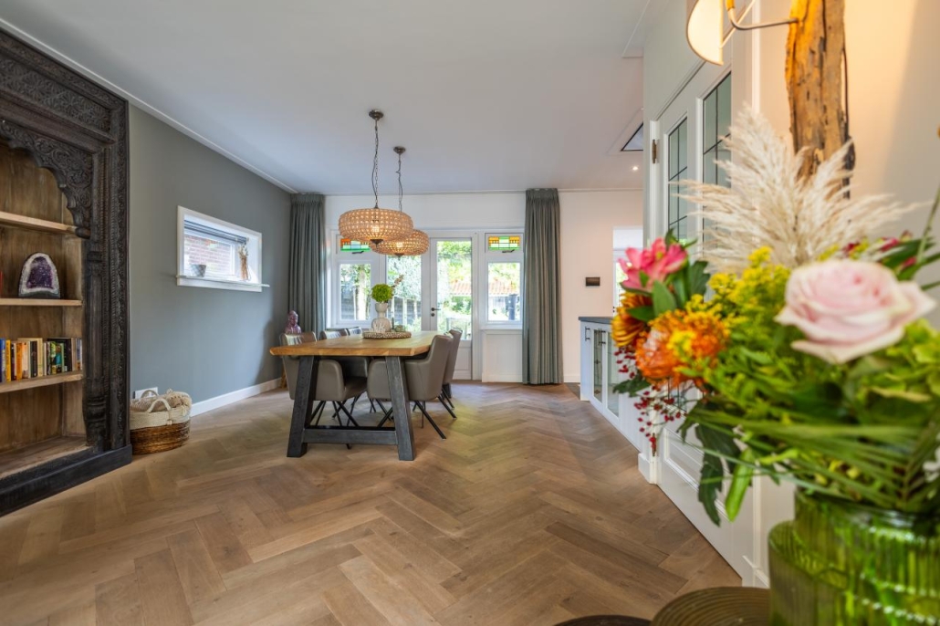 De entree met originele details geeft toegang tot een ruime hal met meterkast, modern gerenoveerd toilet en trapopgang naar de eerste verdieping. Vanuit de hal stap je door naar de woonkamer, waar direct de warme uitstraling van het huis voelbaar is.
